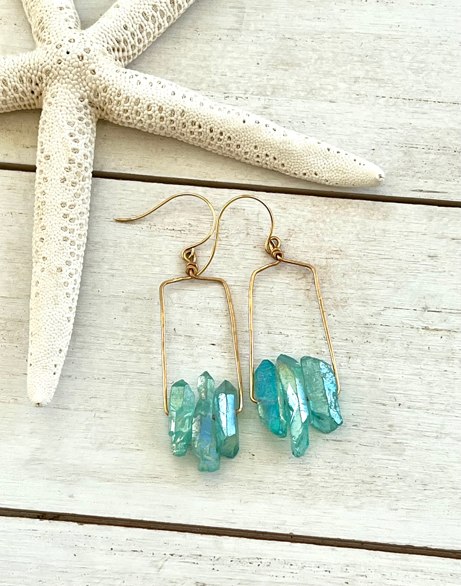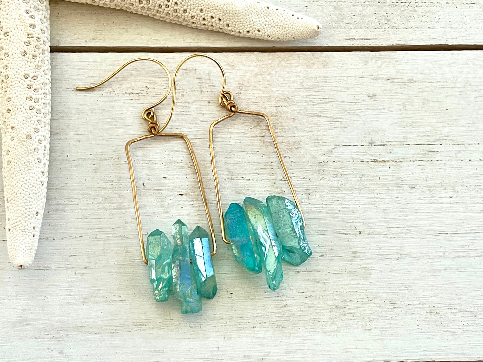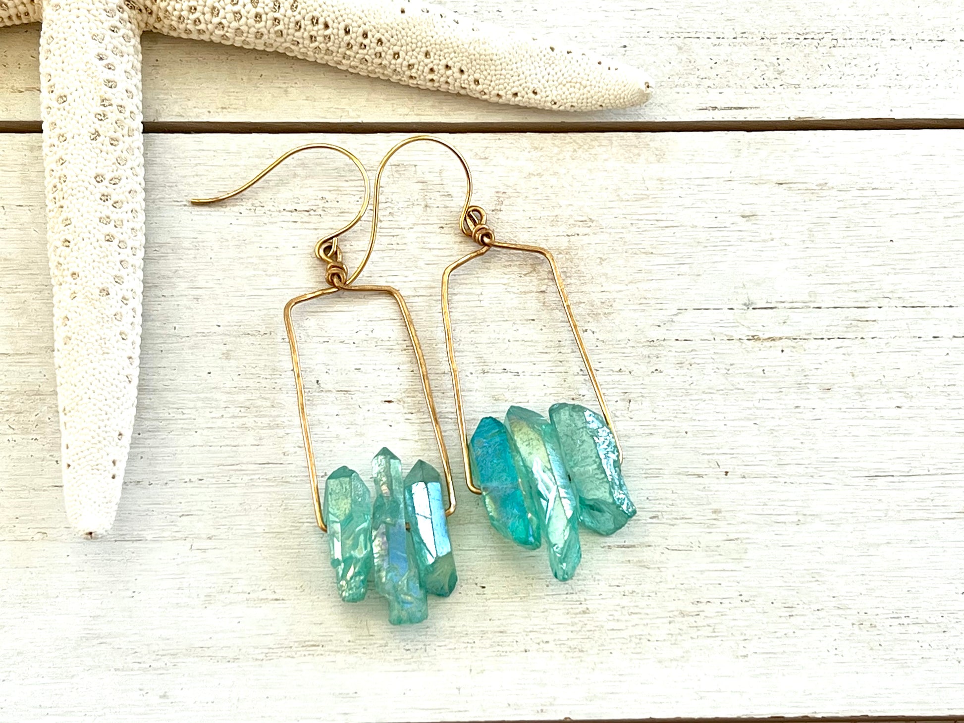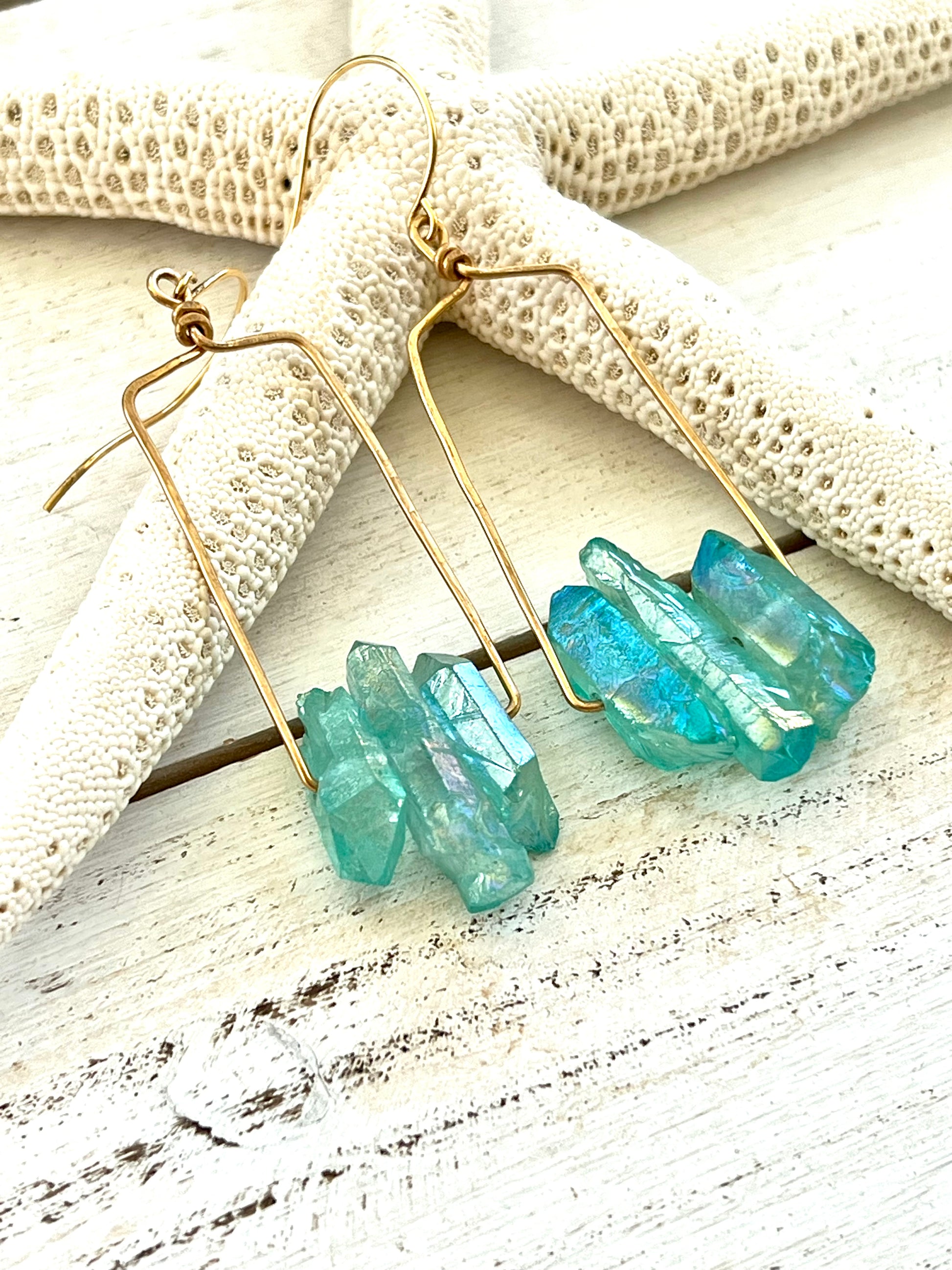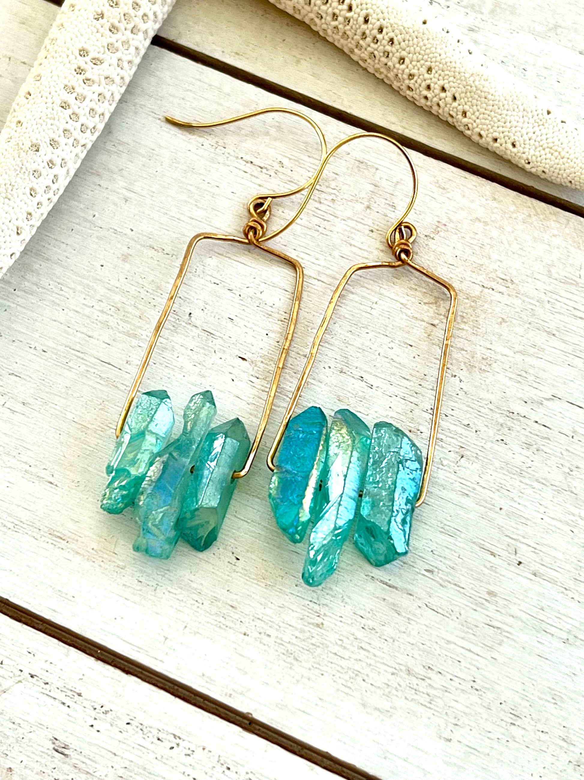 Turquoise rough cut crystals have been strung onto hand forged metal rectangle frames. The frames are textured due to the hammering process. The earrings are attached to 24k gold plated wire hoops. Earrings measure approximately 3 1/4" from ear hole to bottom of hoop and are 1" at the widest point.