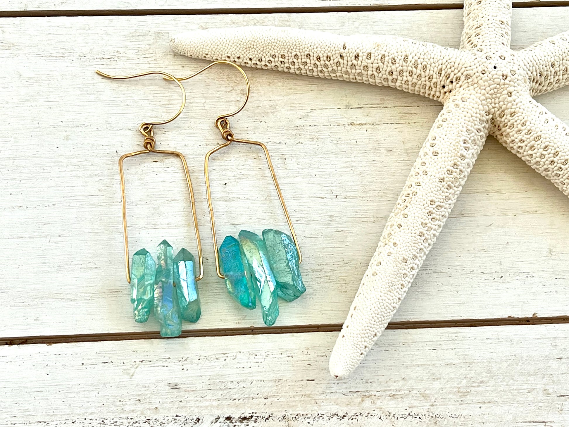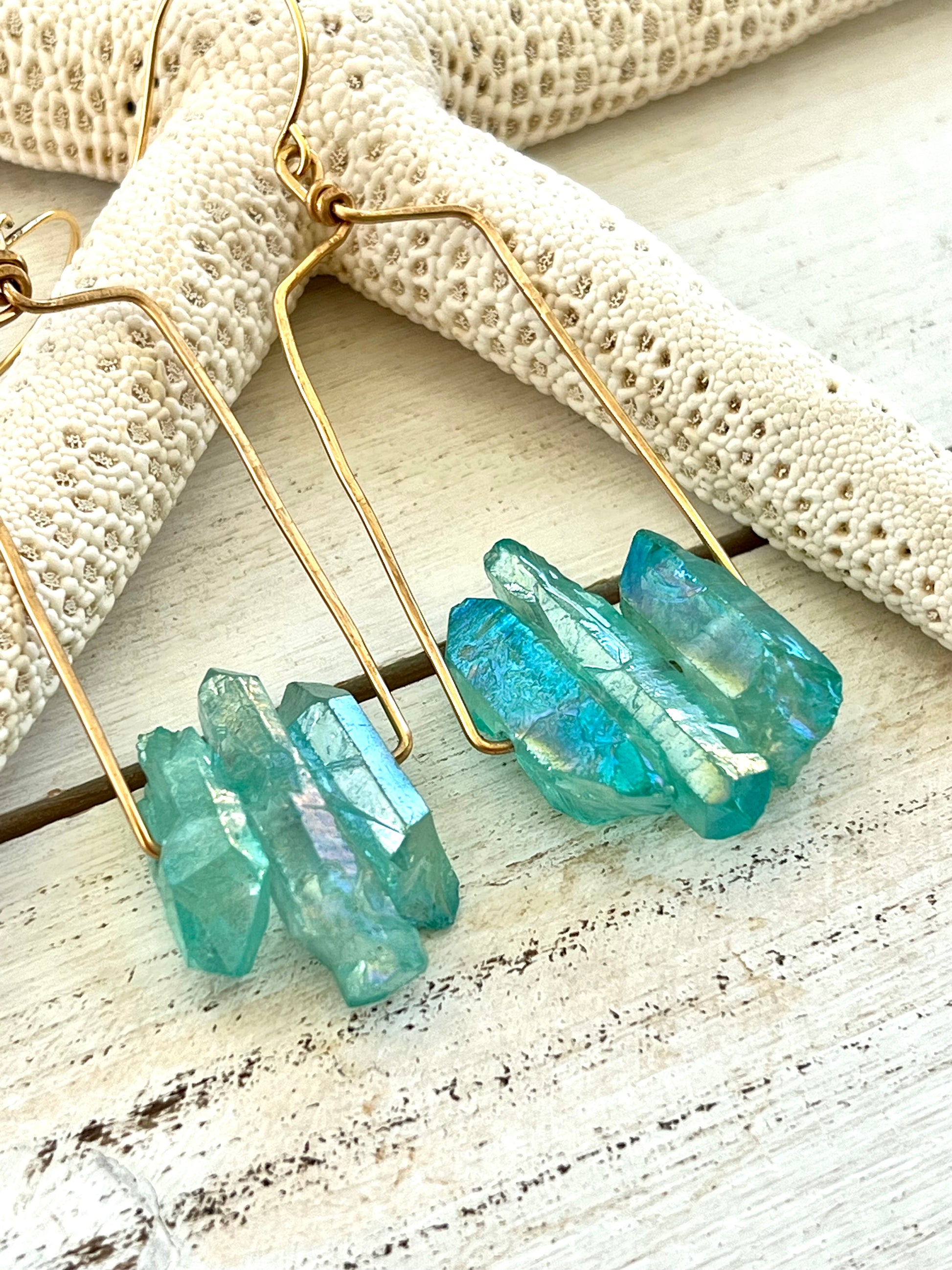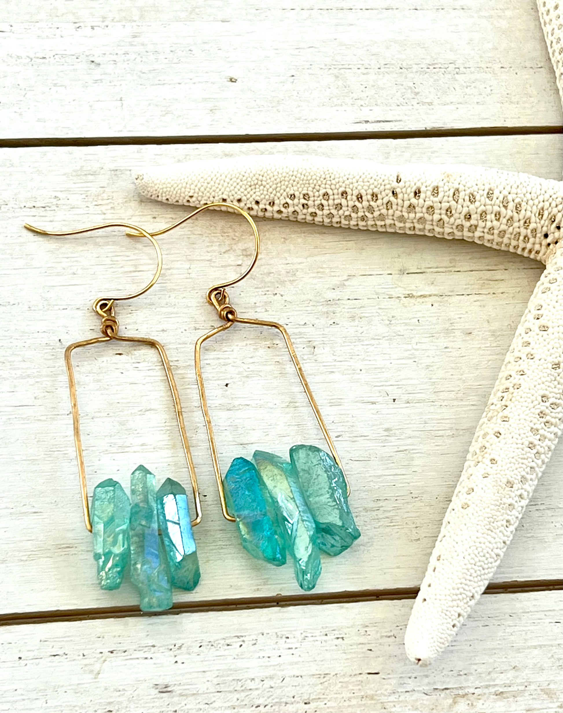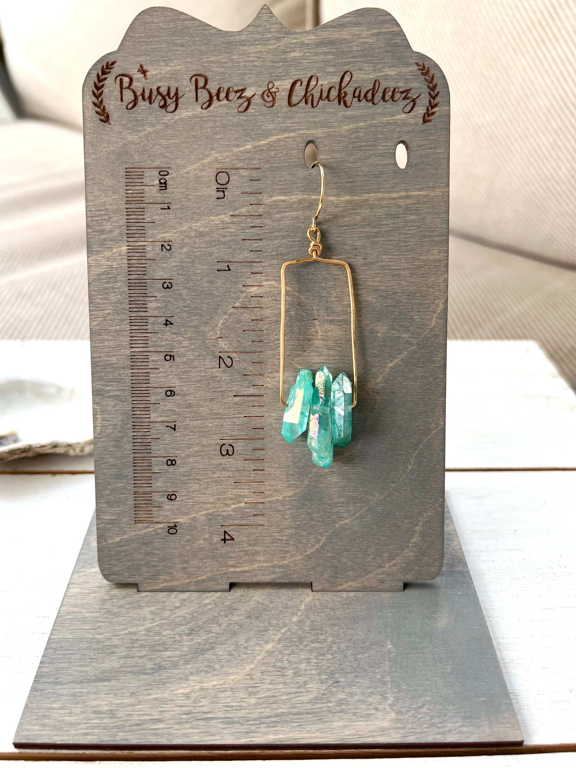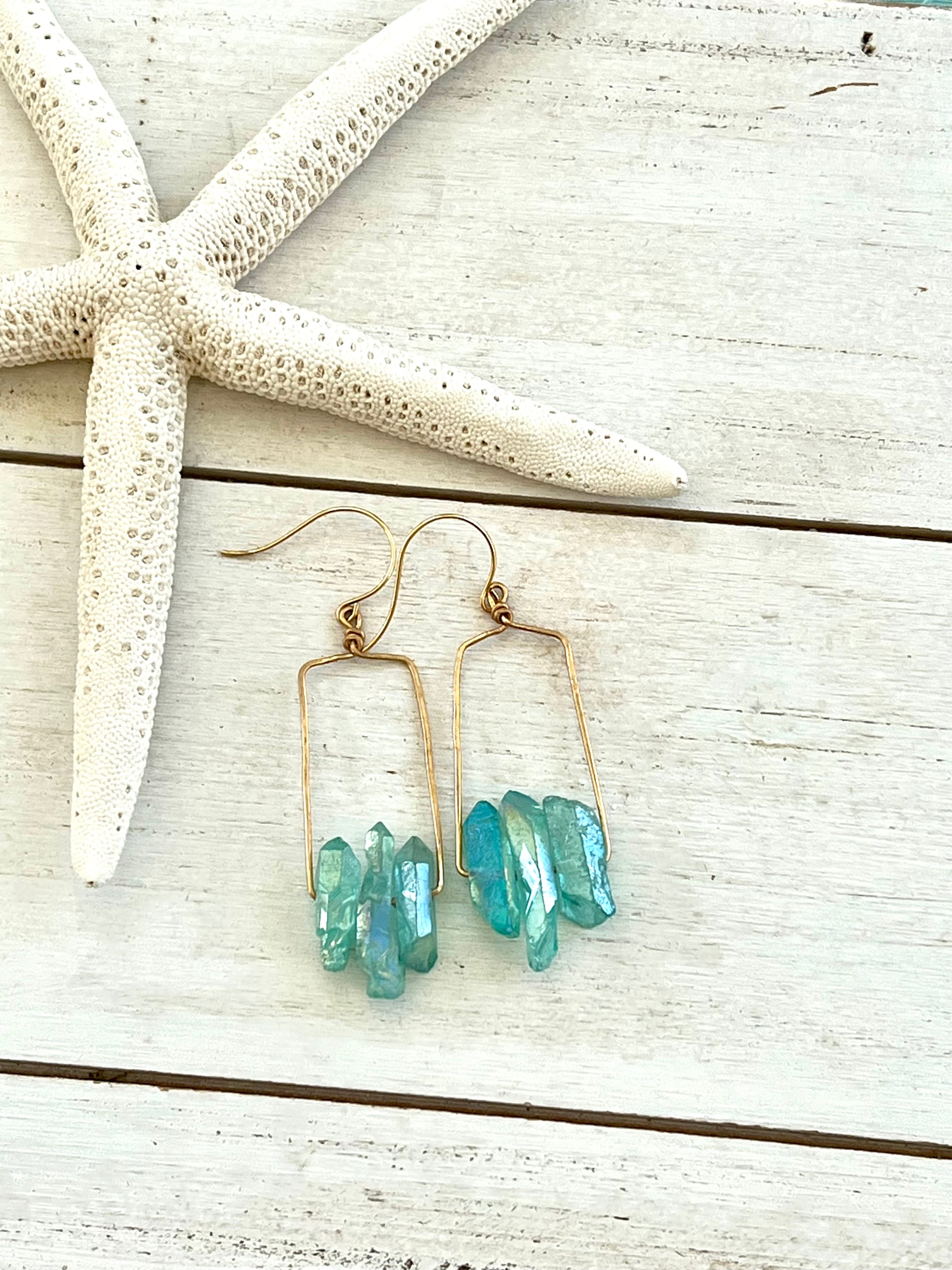 Turquoise rough cut crystals have been strung onto hand forged metal rectangle frames. The frames are textured due to the hammering process. The earrings are attached to 24k gold plated wire hoops. Earrings measure approximately 3 1/4" from ear hole to bottom of hoop and are 1" at the widest point.