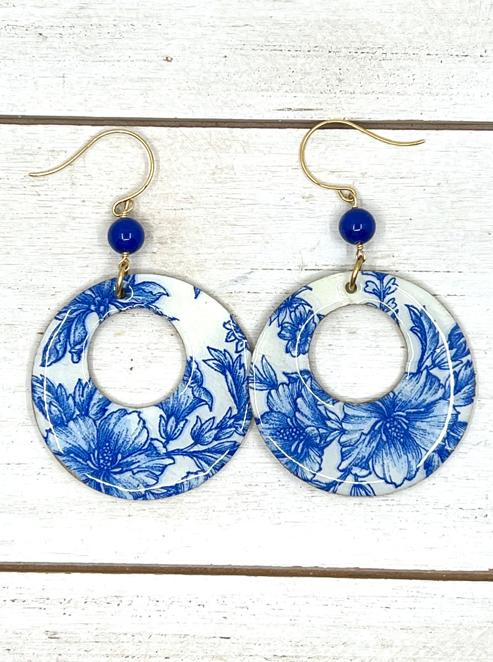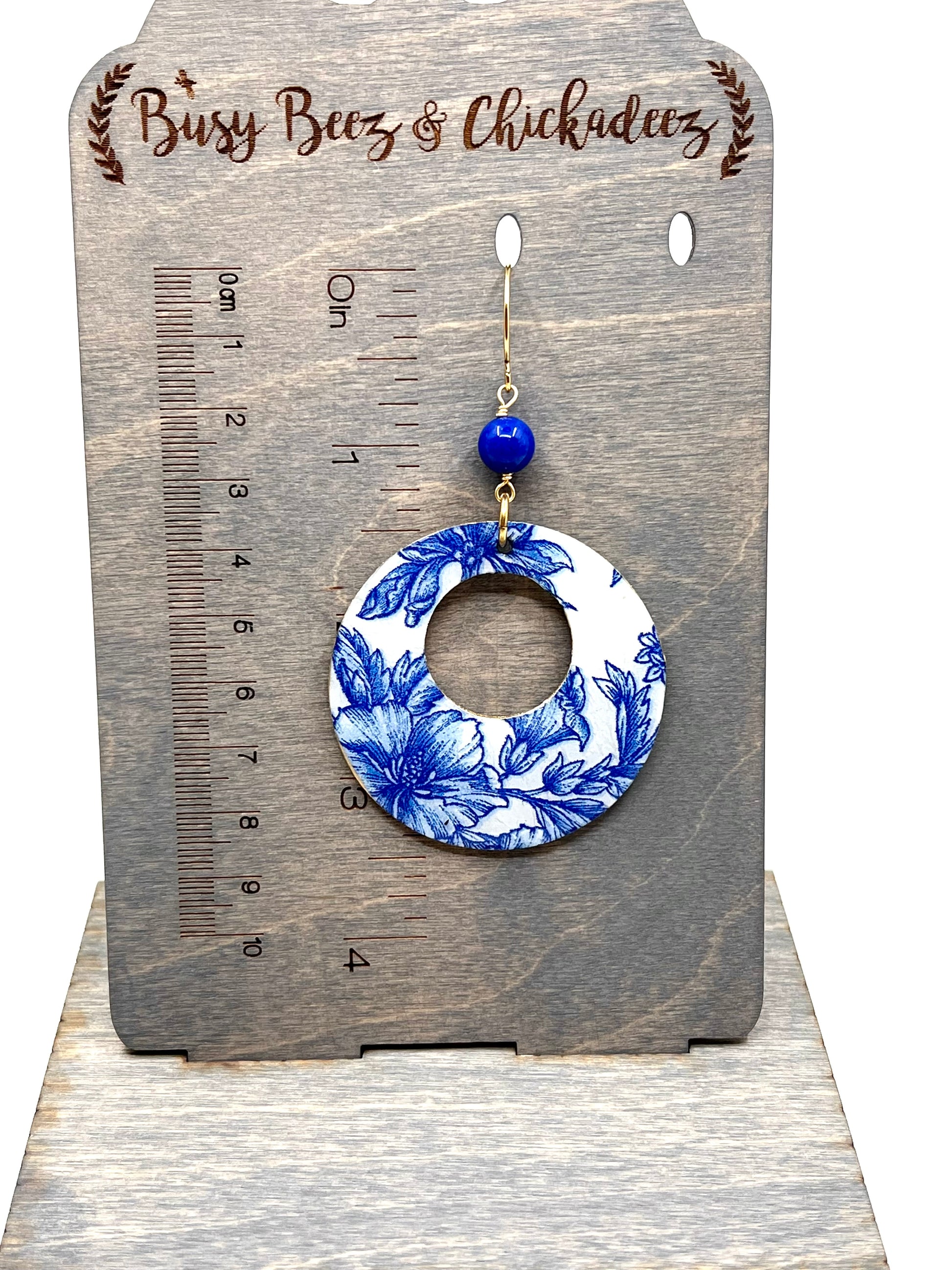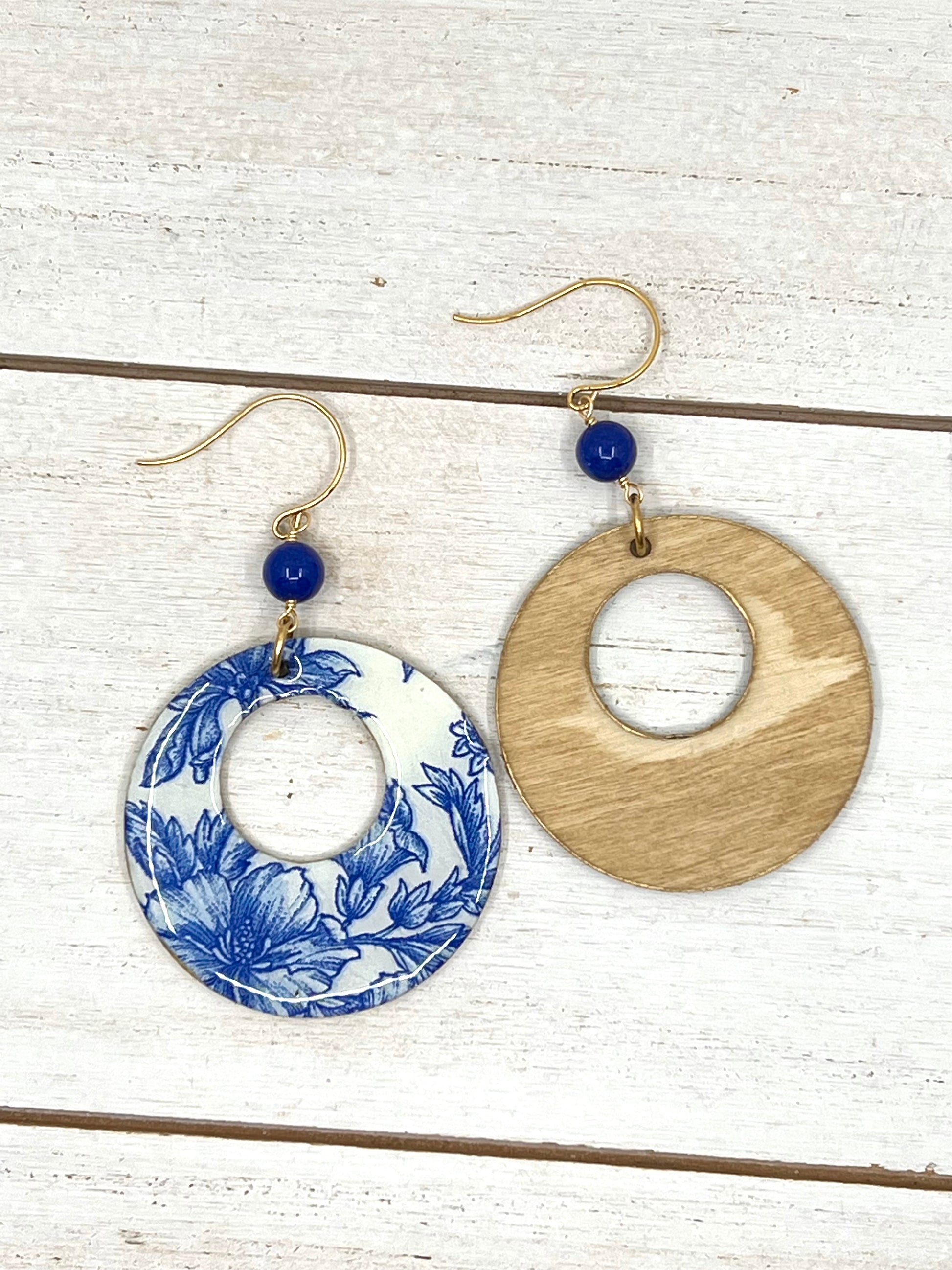Blue and white chinoiserie print decorate these large wood earrings. The image is sealed with resin. The back of the wooden earring has been stained. The earrings dangle from blue stone beads and are attached to 24k plated gold earring wires. Earrings dangle 3 3/8" from ear hole and are 2" at the widest point.