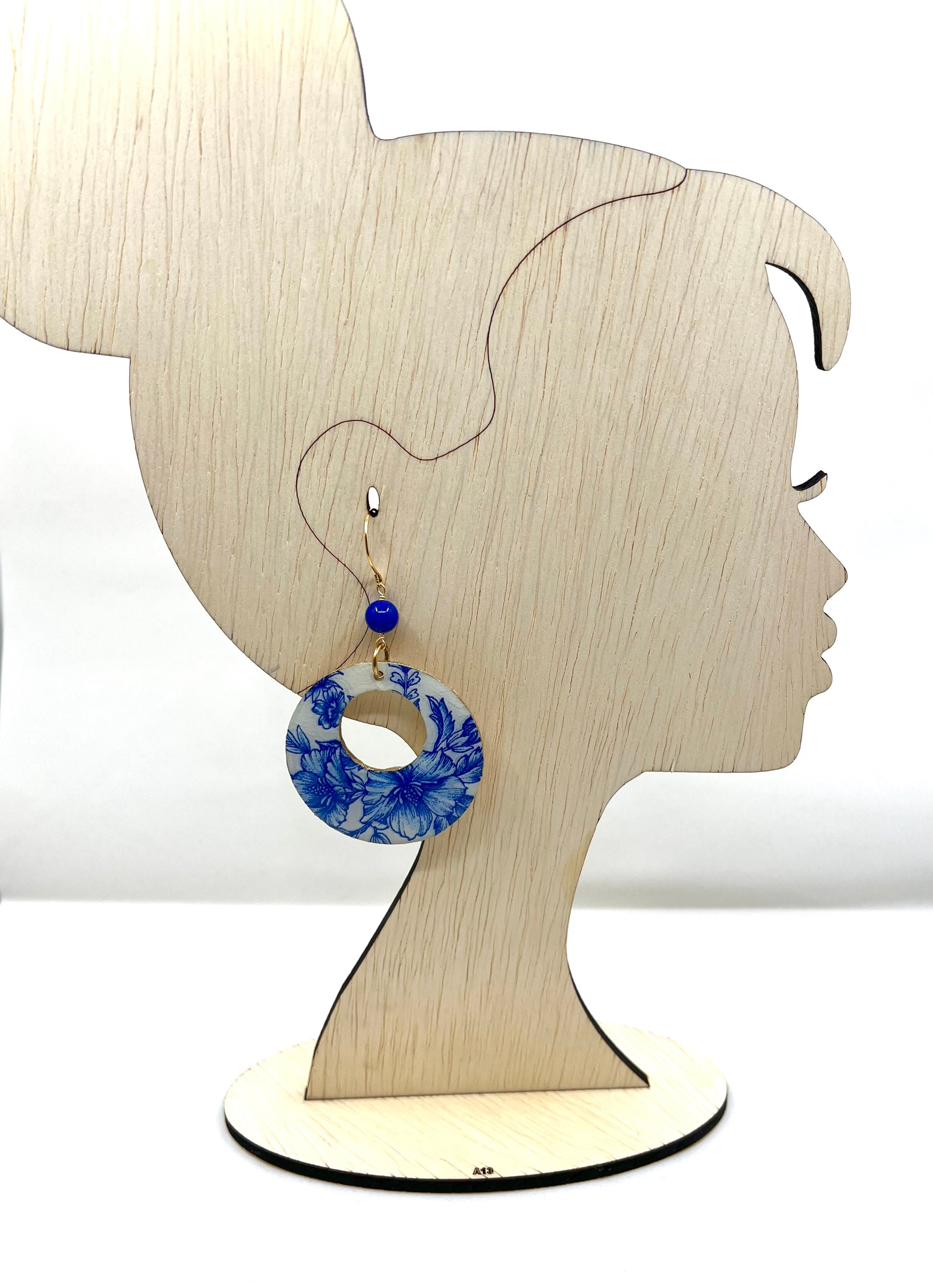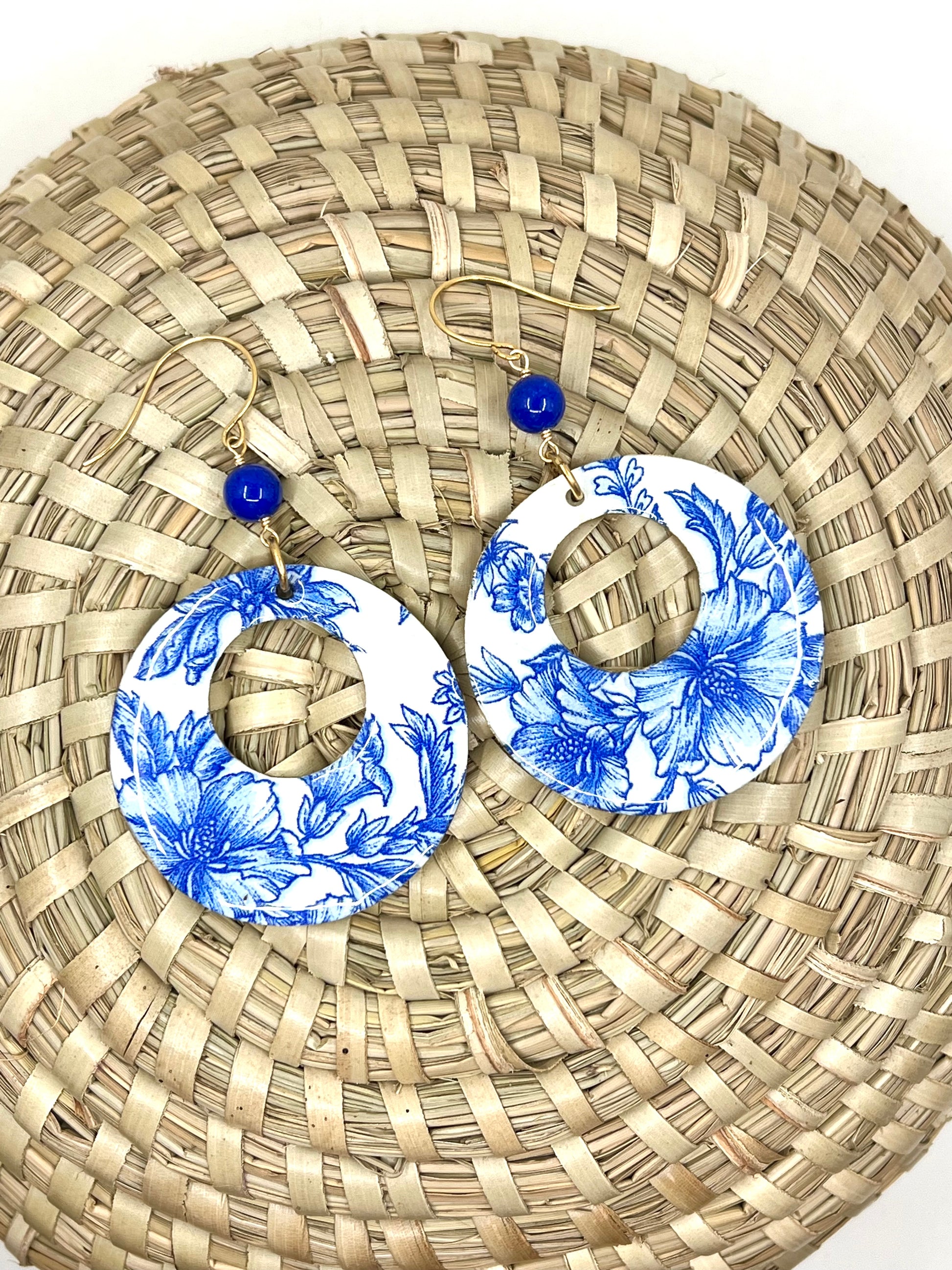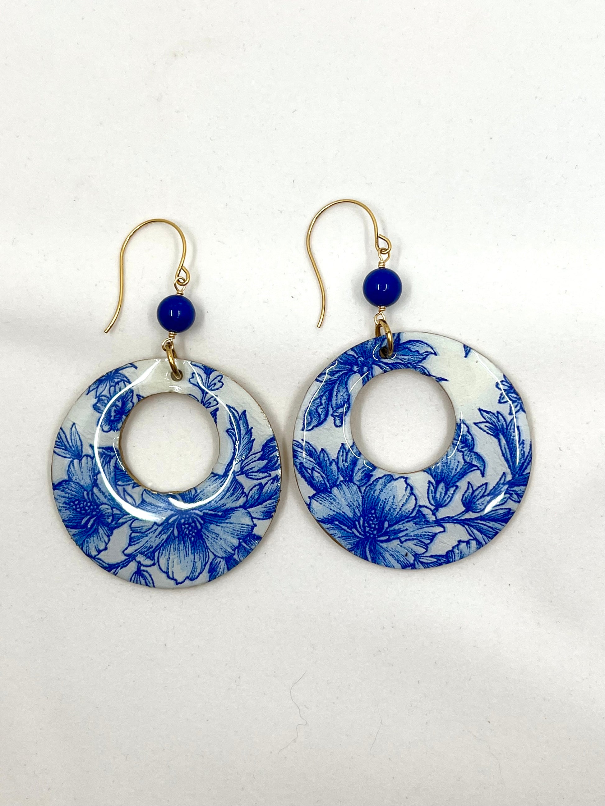 Blue and white chinoiserie print decorate these large wood earrings. The image is sealed with resin. The back of the wooden earring has been stained. The earrings dangle from blue stone beads and are attached to 24k plated gold earring wires. Earrings dangle 3 3/8" from ear hole and are 2" at the widest point.