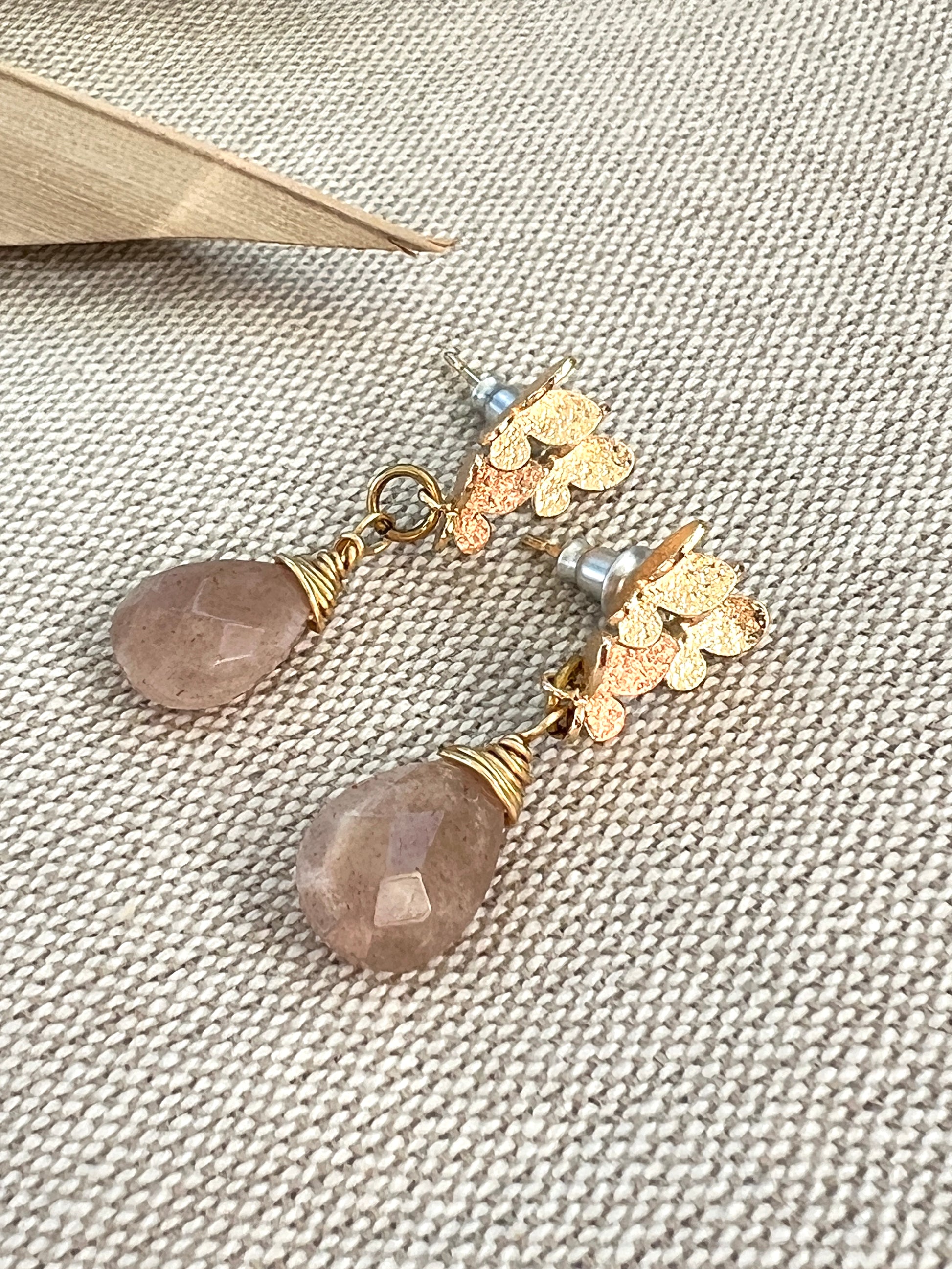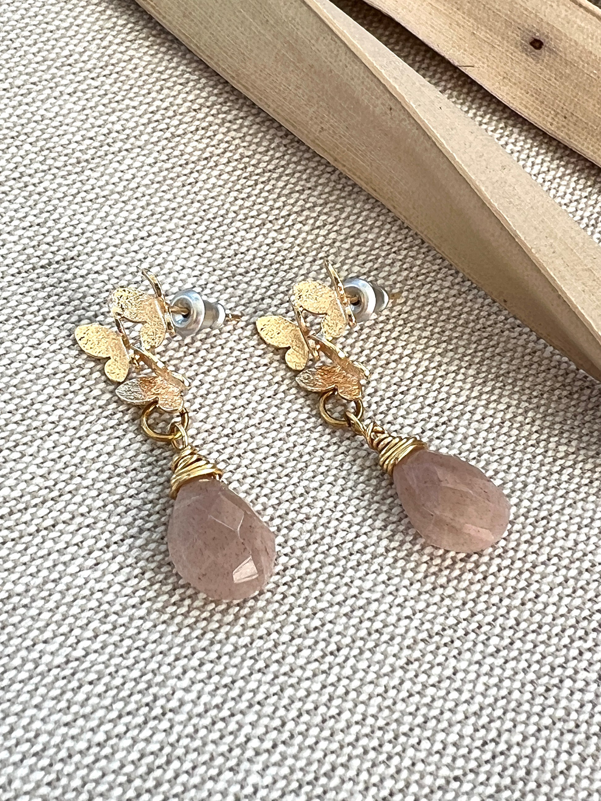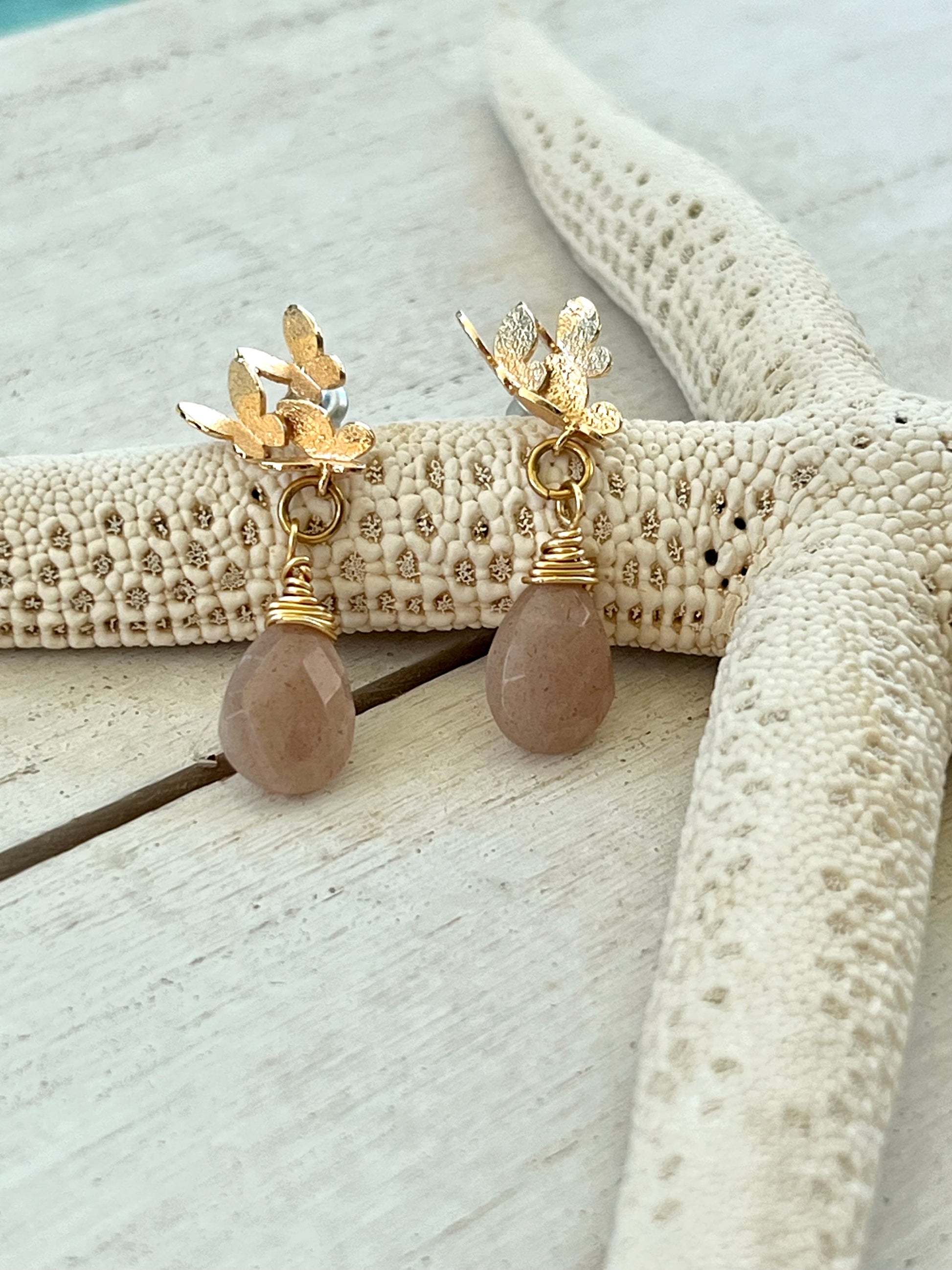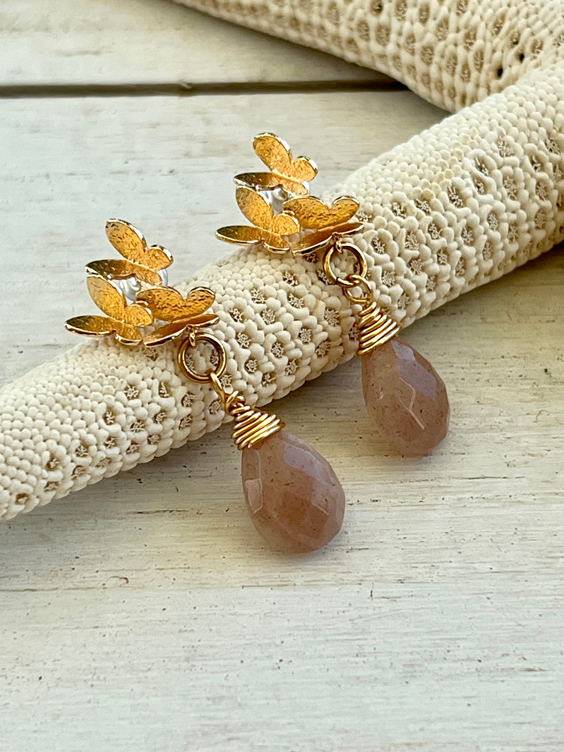Eighteen karat gold plated butterfly cluster earring post, holds a faceted genuine peach moonstone wire wrapped briolette. Earrings measure 1 1/4" from ear hole to bottom of moonstone and are 1/2" at the widest point.