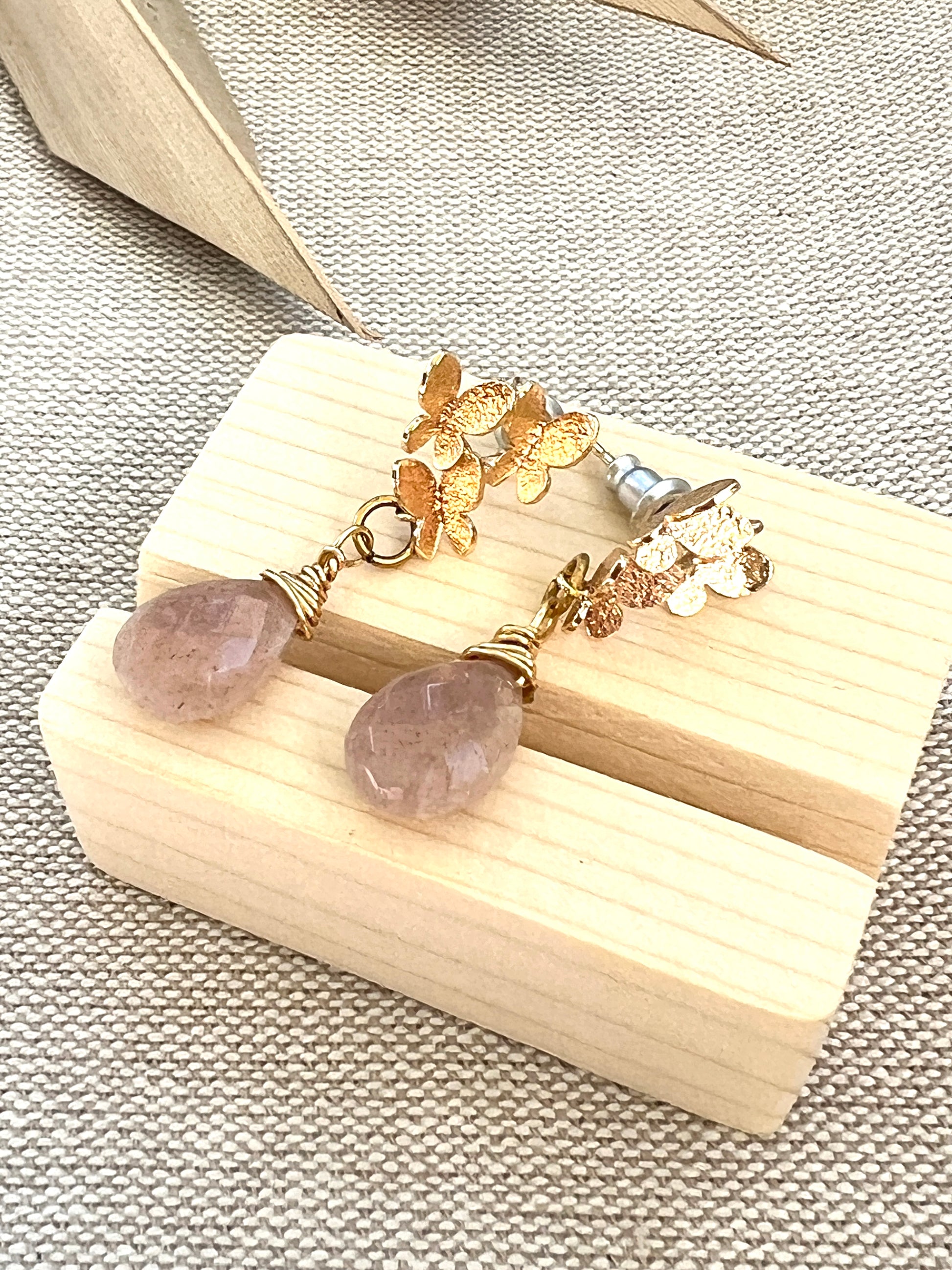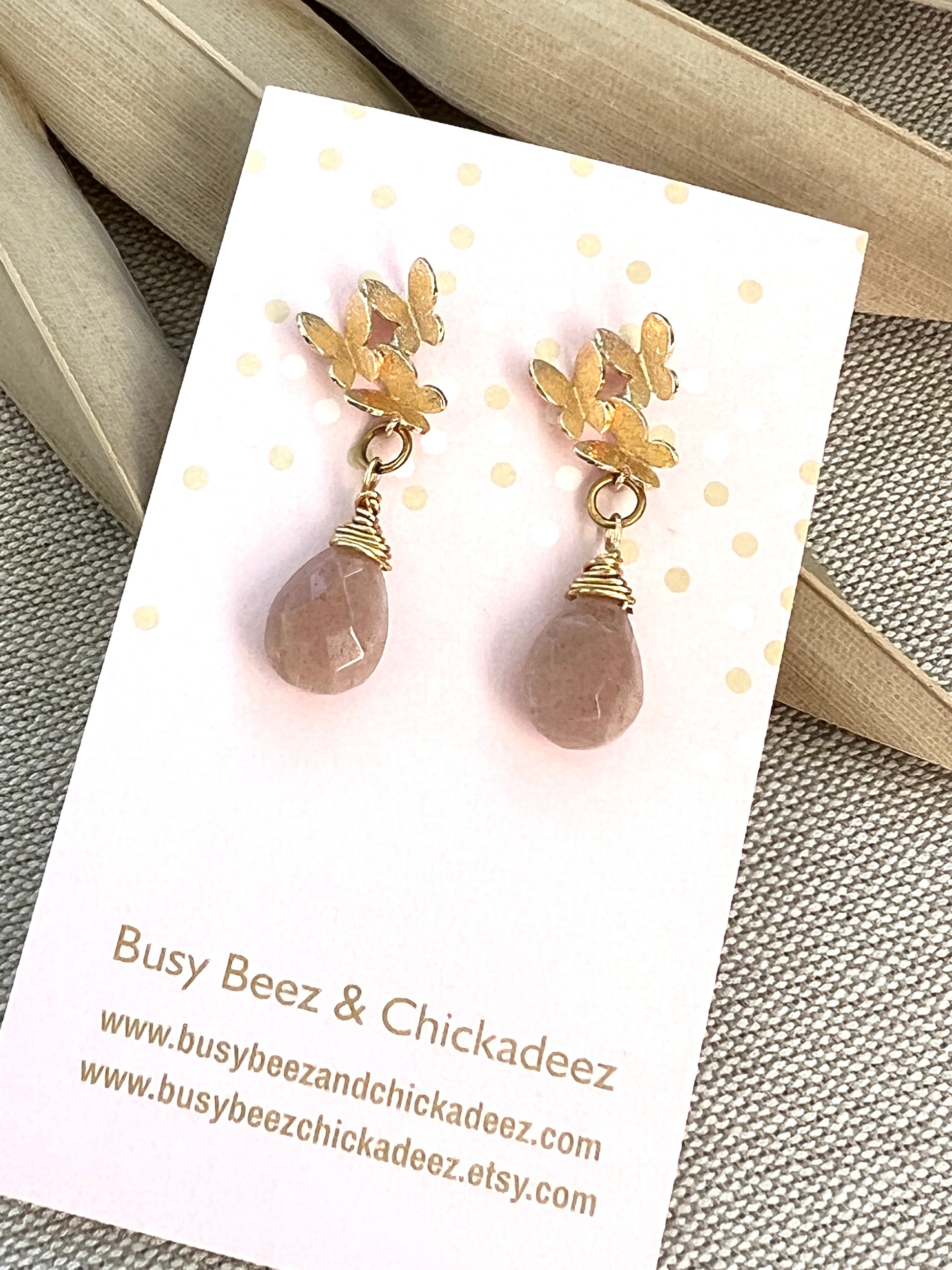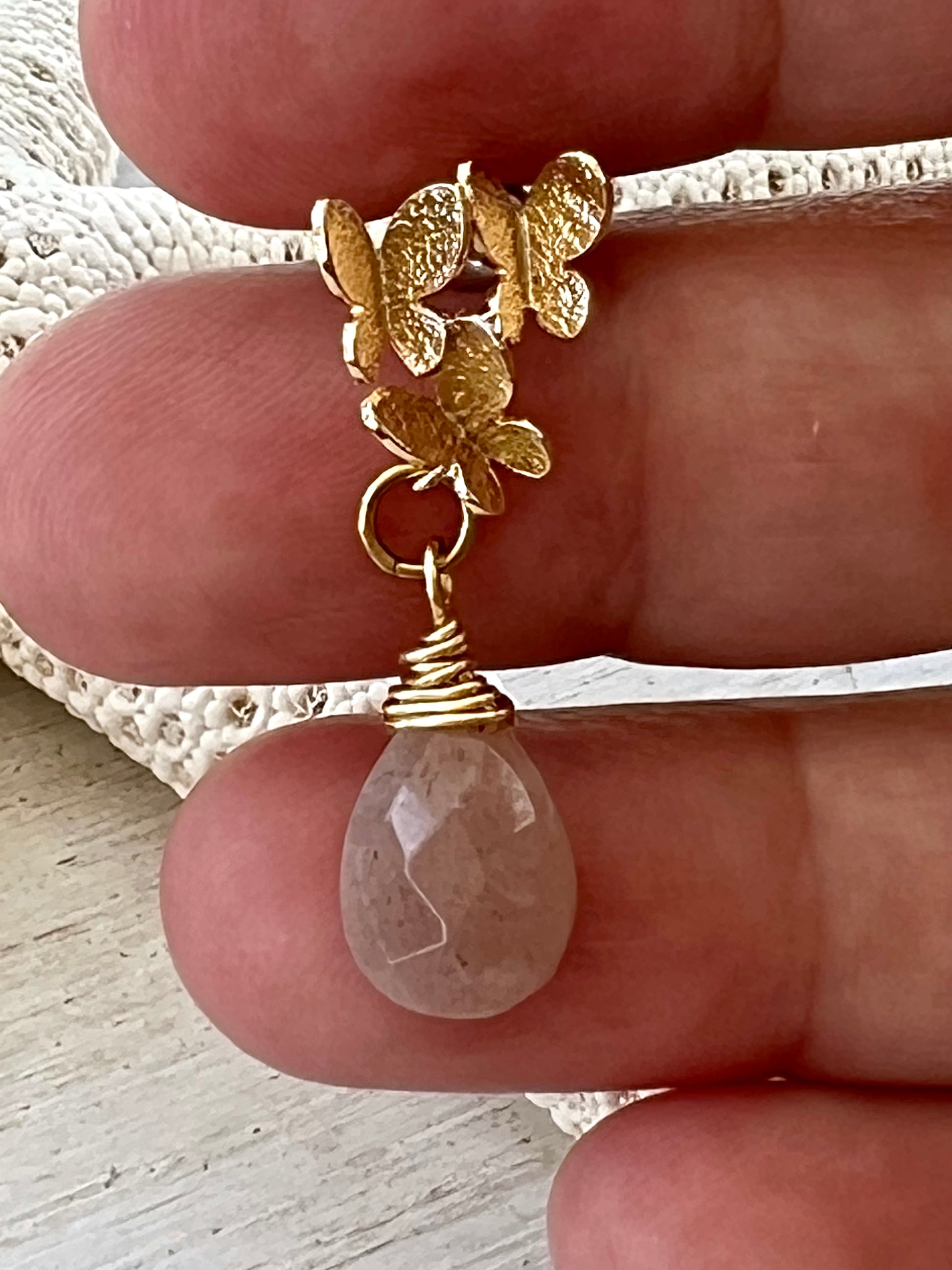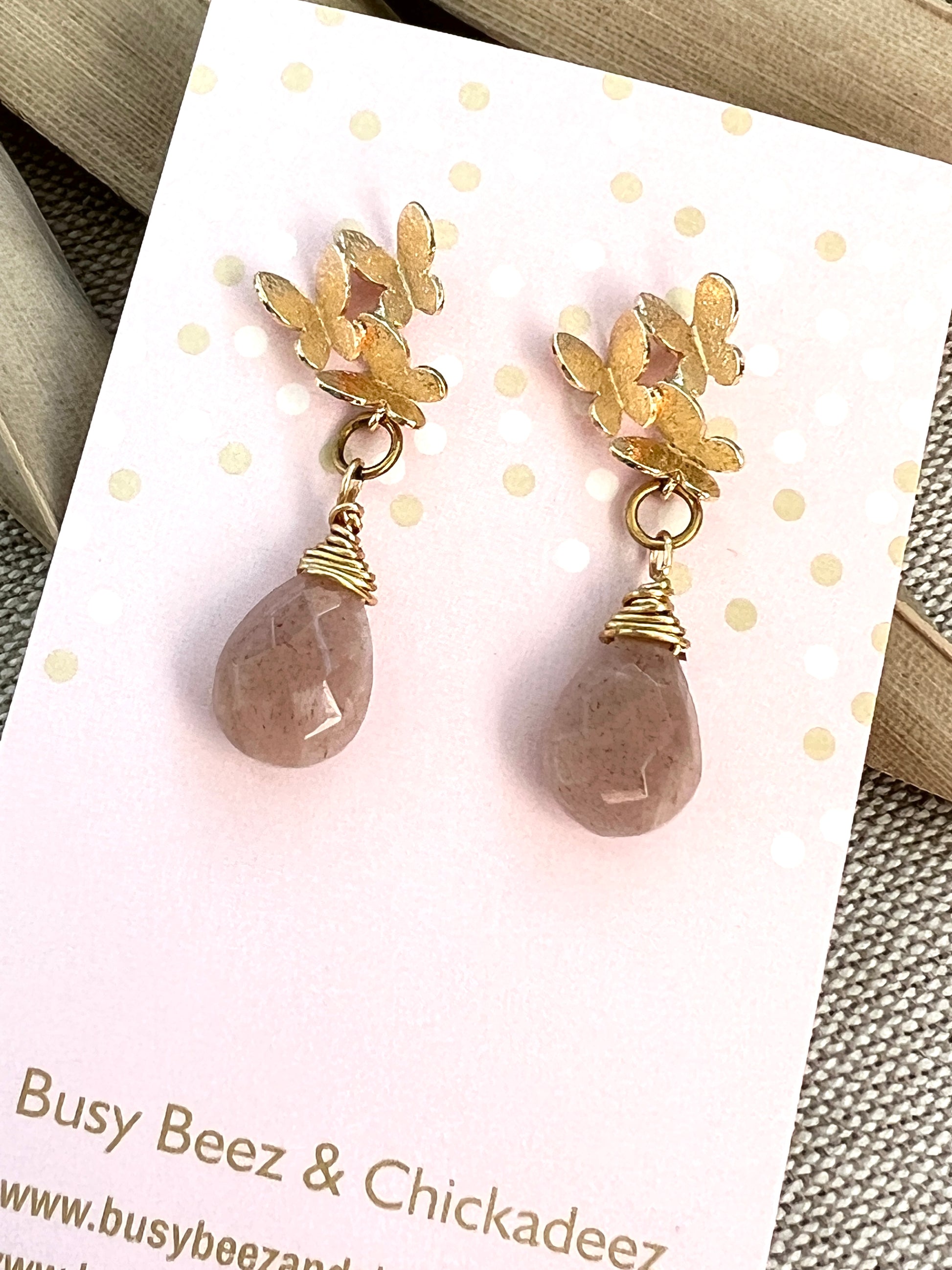 Eighteen karat gold plated butterfly cluster earring post, holds a faceted genuine peach moonstone wire wrapped briolette. Earrings measure 1 1/4" from ear hole to bottom of moonstone and are 1/2" at the widest point.