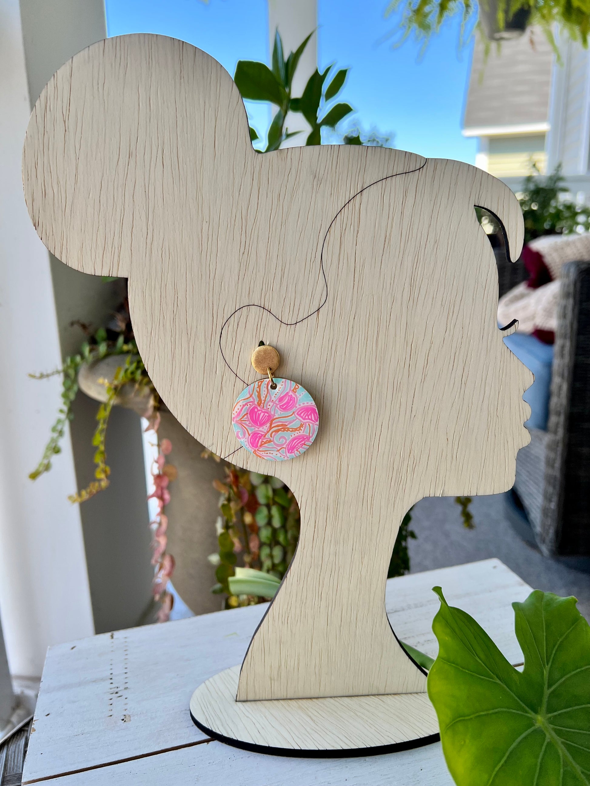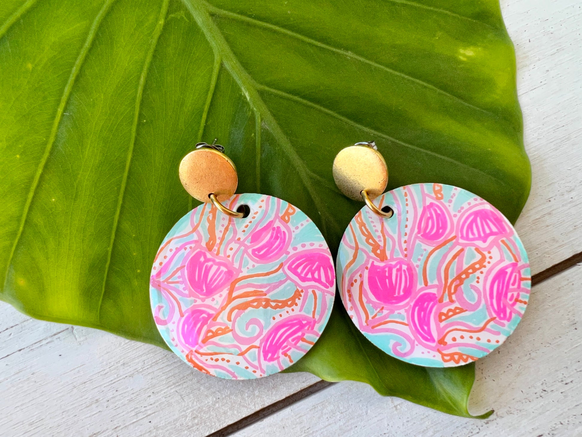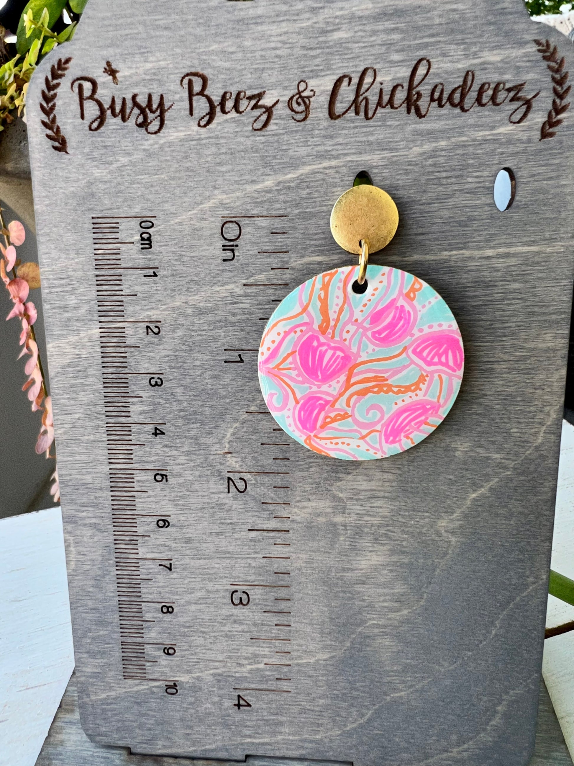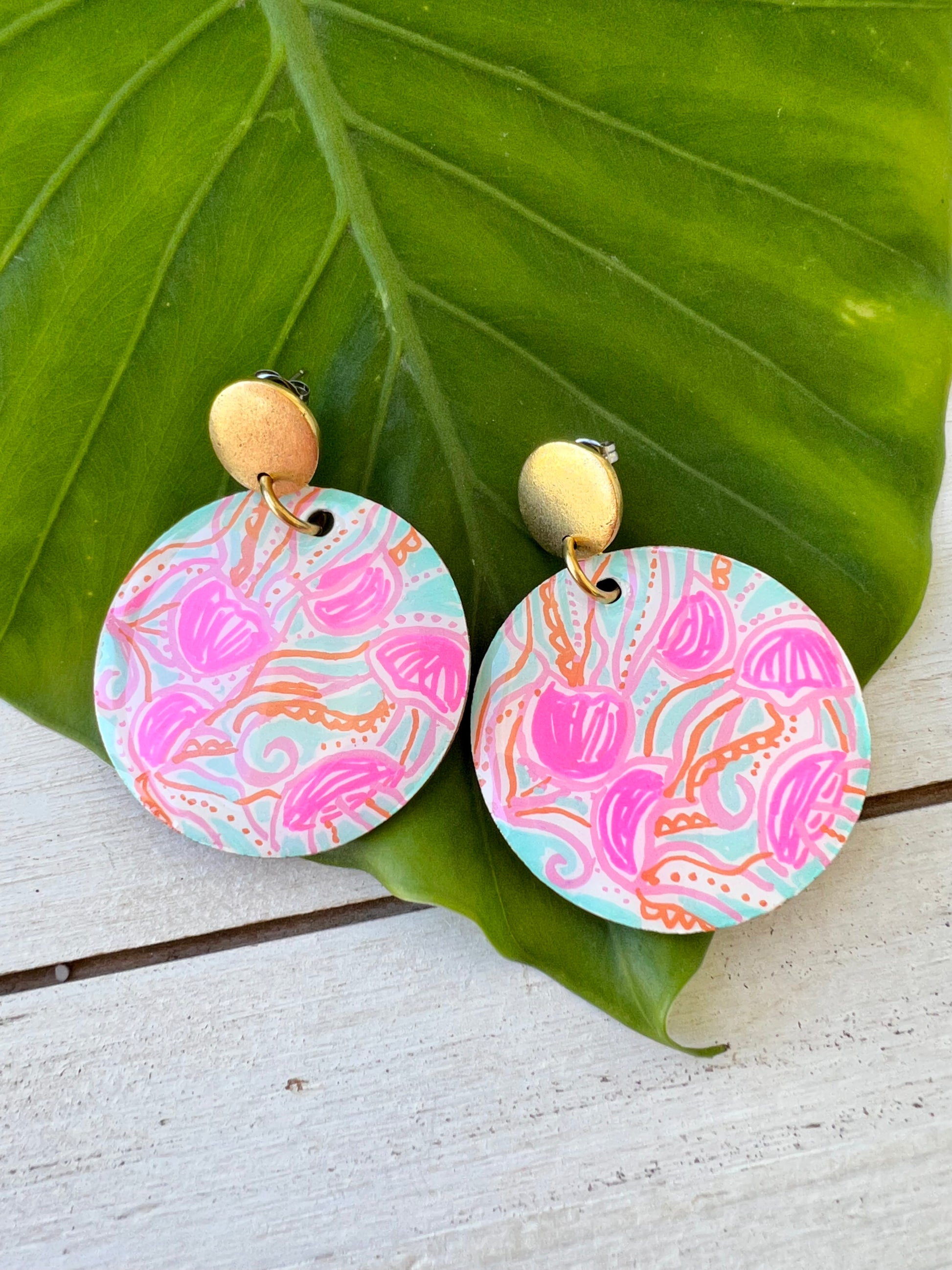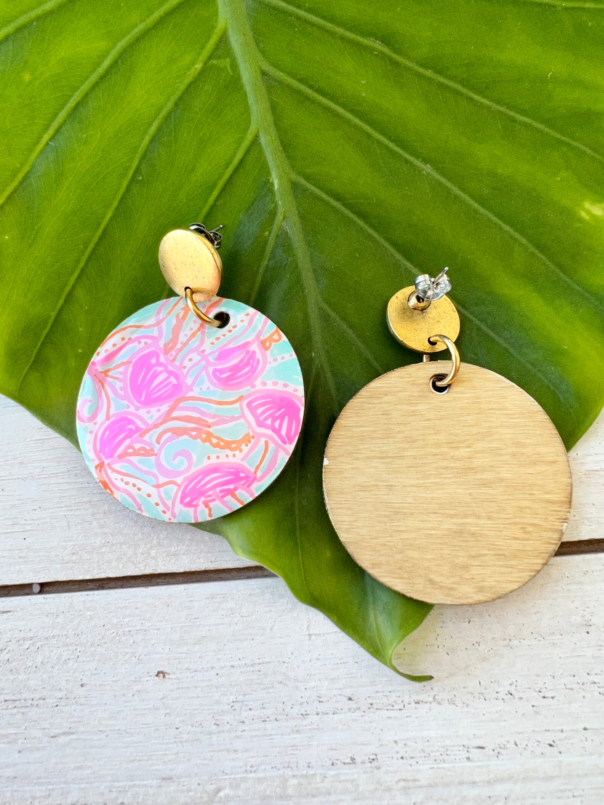 On these hand painted earrings, jellyfish swirl giving a lovely design. The hand painted image is sealed with resin. The back of the wooden hand painted earring has been stained. The earrings dangle from 24k plated gold earring posts. Earrings dangle 2" from ear hole and are 1 9/16" at the widest point. Since these are hand painted, each earring set will be one of a kind!