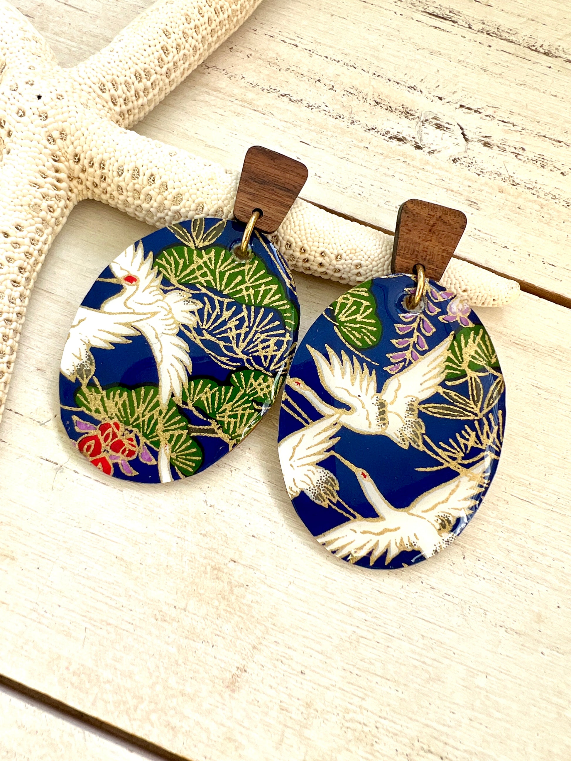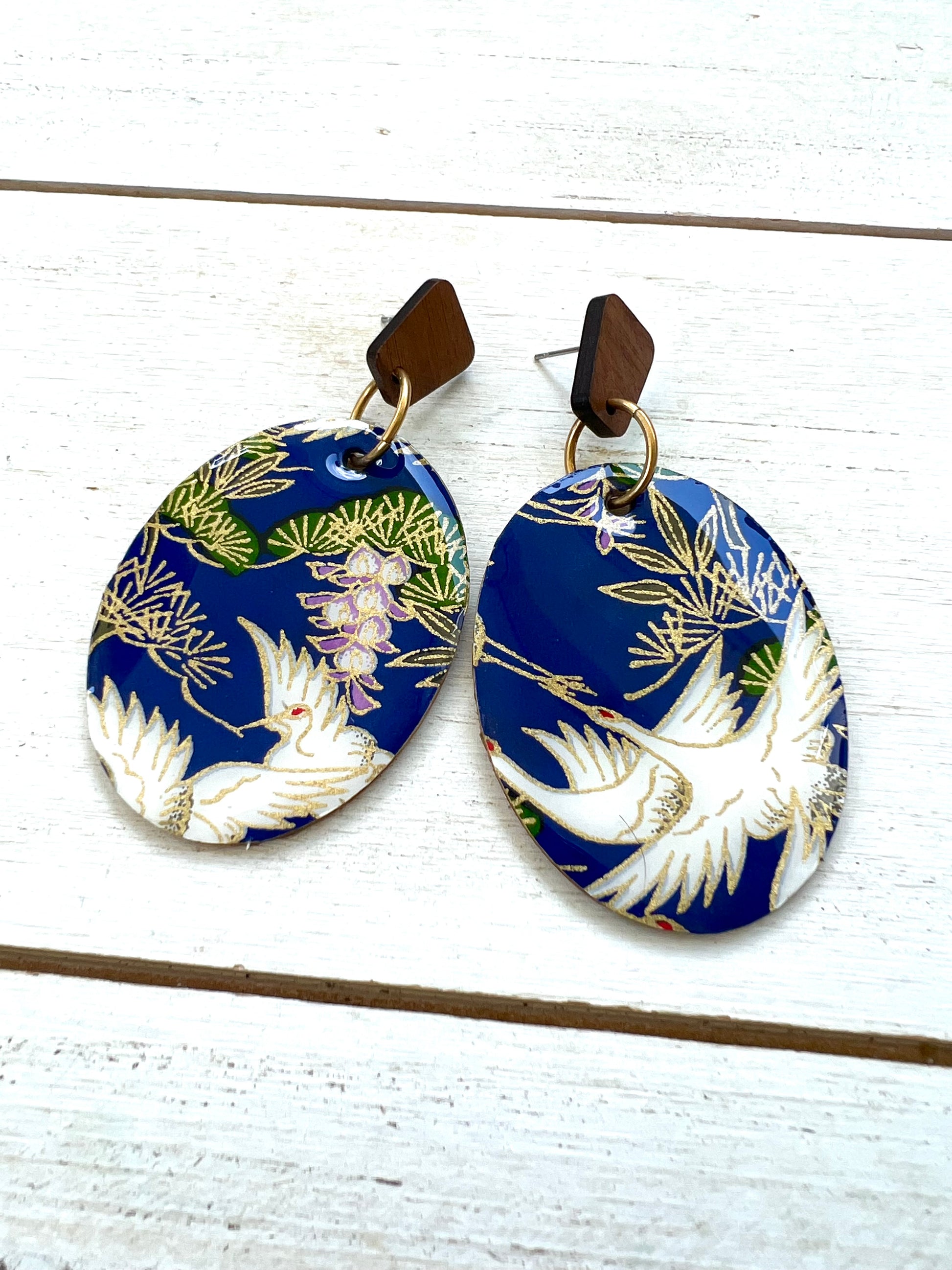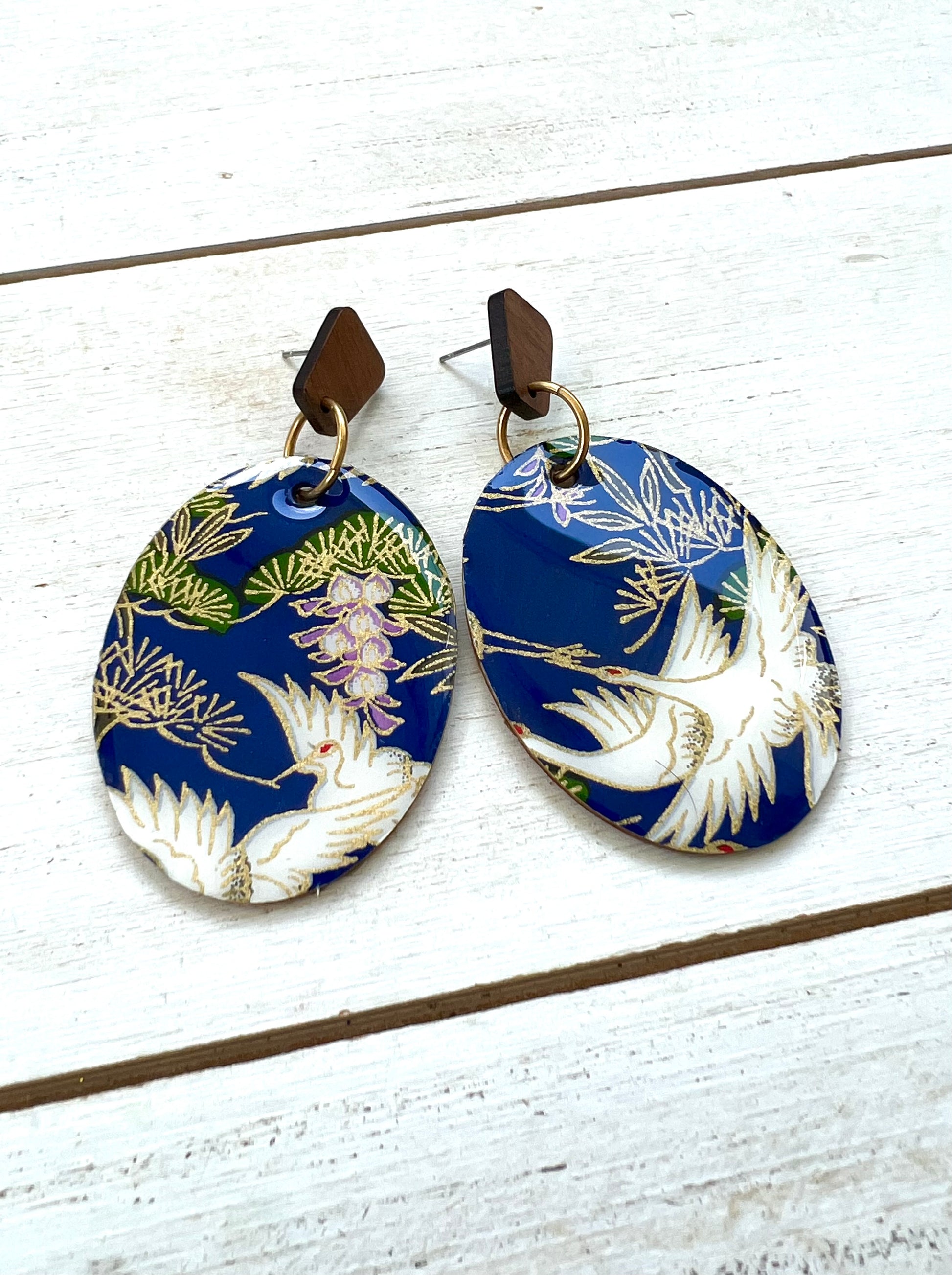 Wooden earrings have been embellished with chiyogami paper - paper that has been individually silk screened by artists in Japan. The paper is then sealed in resin. The earrings are attached to wooden stained trapezoid posts. The back of the wood earrings have also been stained. Earrings drop 2 11/16" in length from ear hole and are 1 1/2" at the widest point.