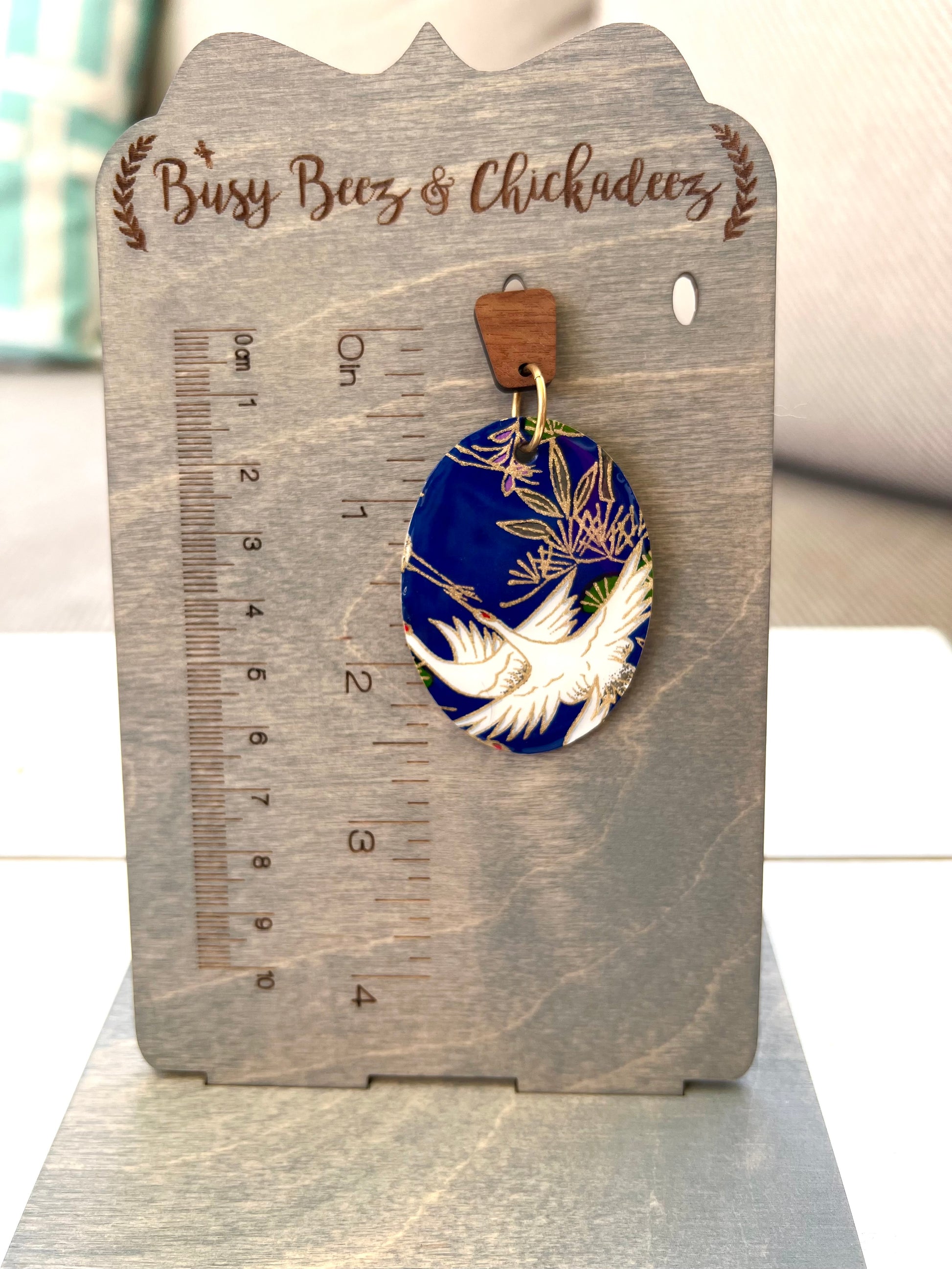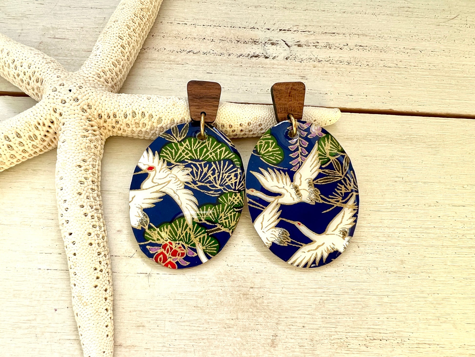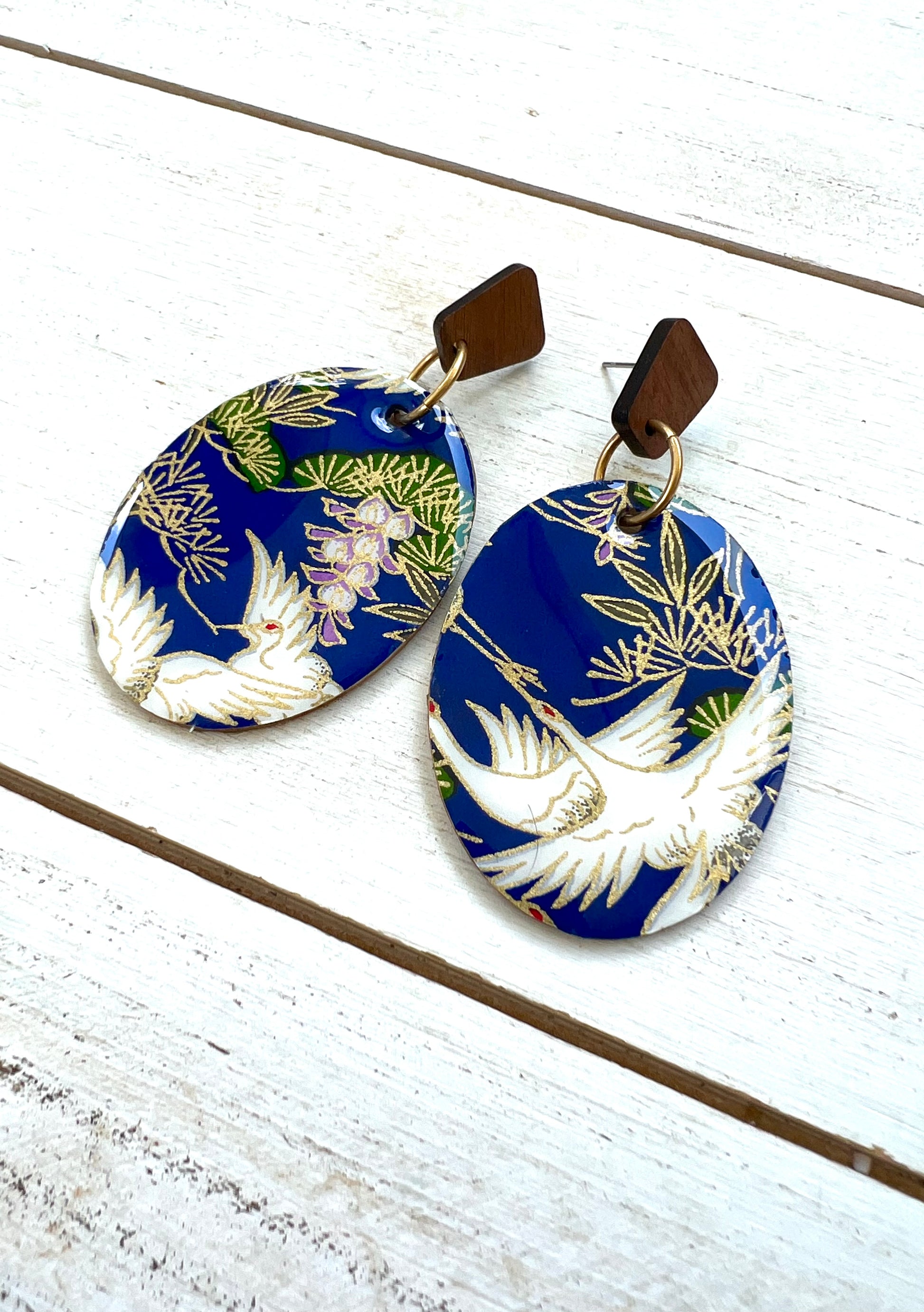 Wooden earrings have been embellished with chiyogami paper - paper that has been individually silk screened by artists in Japan. The paper is then sealed in resin. The earrings are attached to wooden stained trapezoid posts. The back of the wood earrings have also been stained. Earrings drop 2 11/16" in length from ear hole and are 1 1/2" at the widest point.