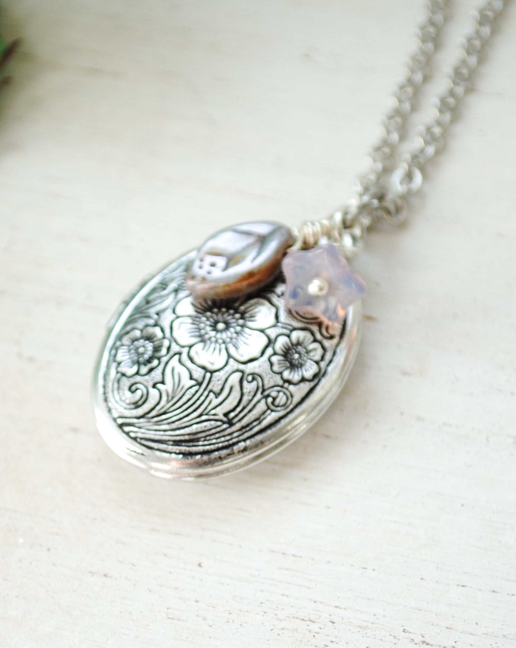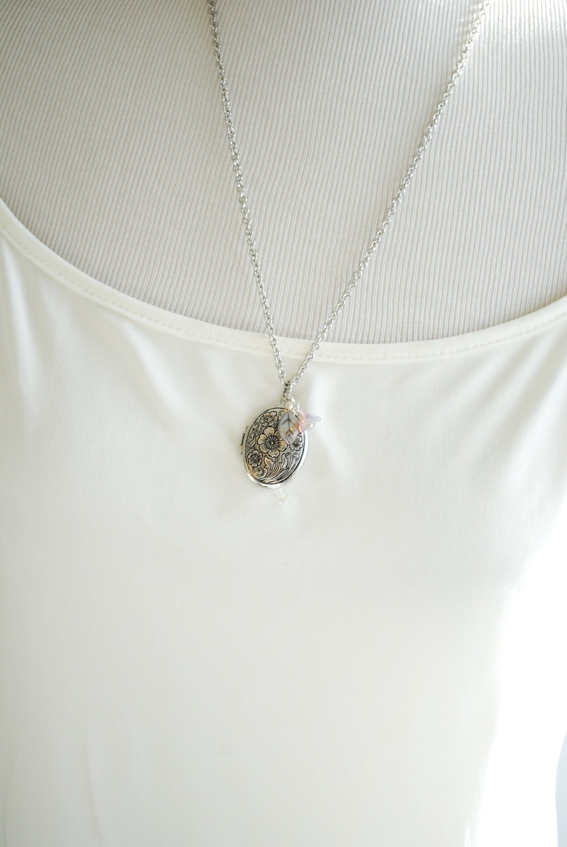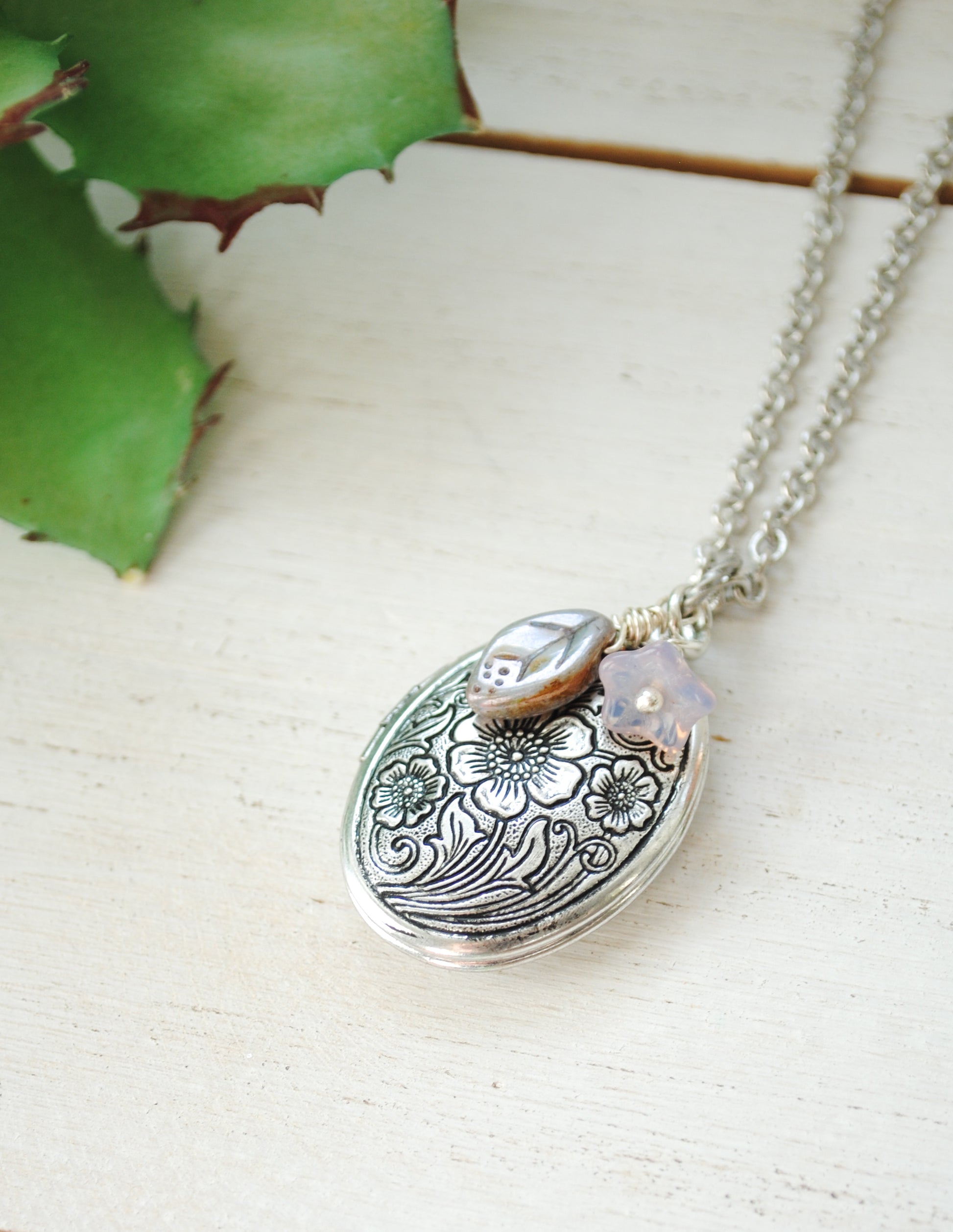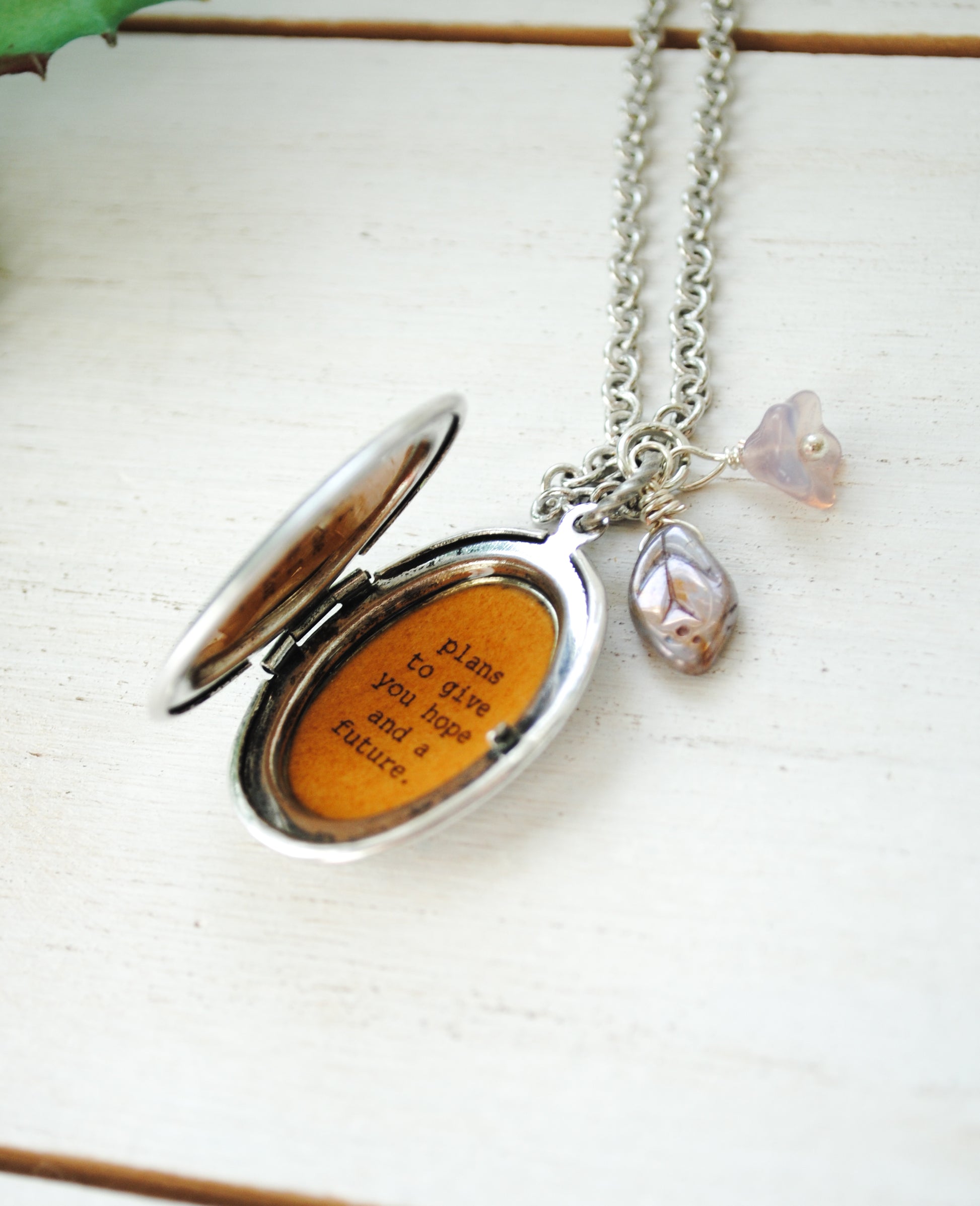 The simple antique silver locket is accented with a soft purple Czech glass bellflower and soft green leaf. Inside the locket an excerpt of the verse states, "For I know the plans I have for you....plans to give you a hope and a future." The locket measures 1 1/8" long and 15/16" wide. The standard silver plated chain measures approximately 24" and has a sturdy lobster claw clasp.