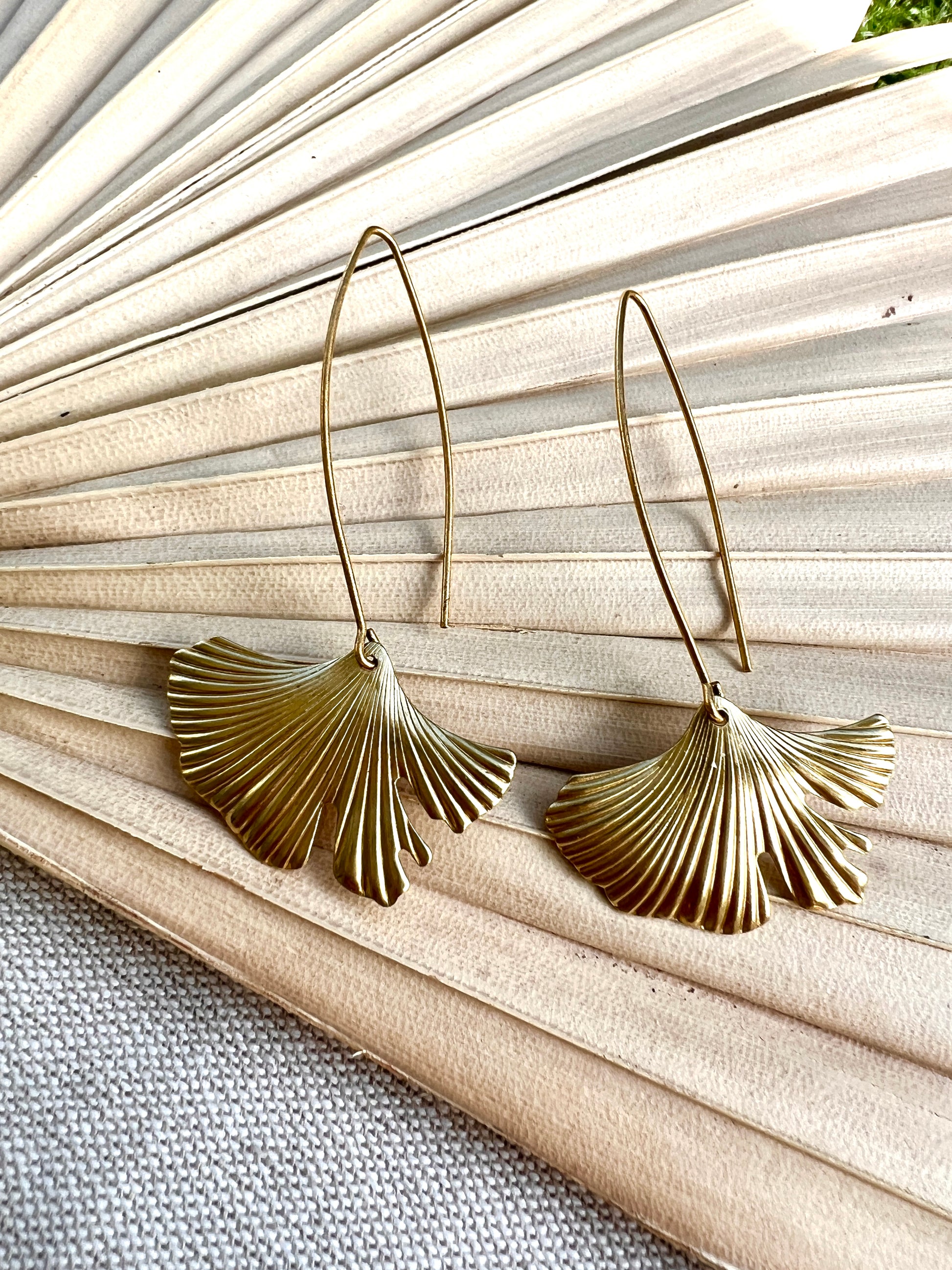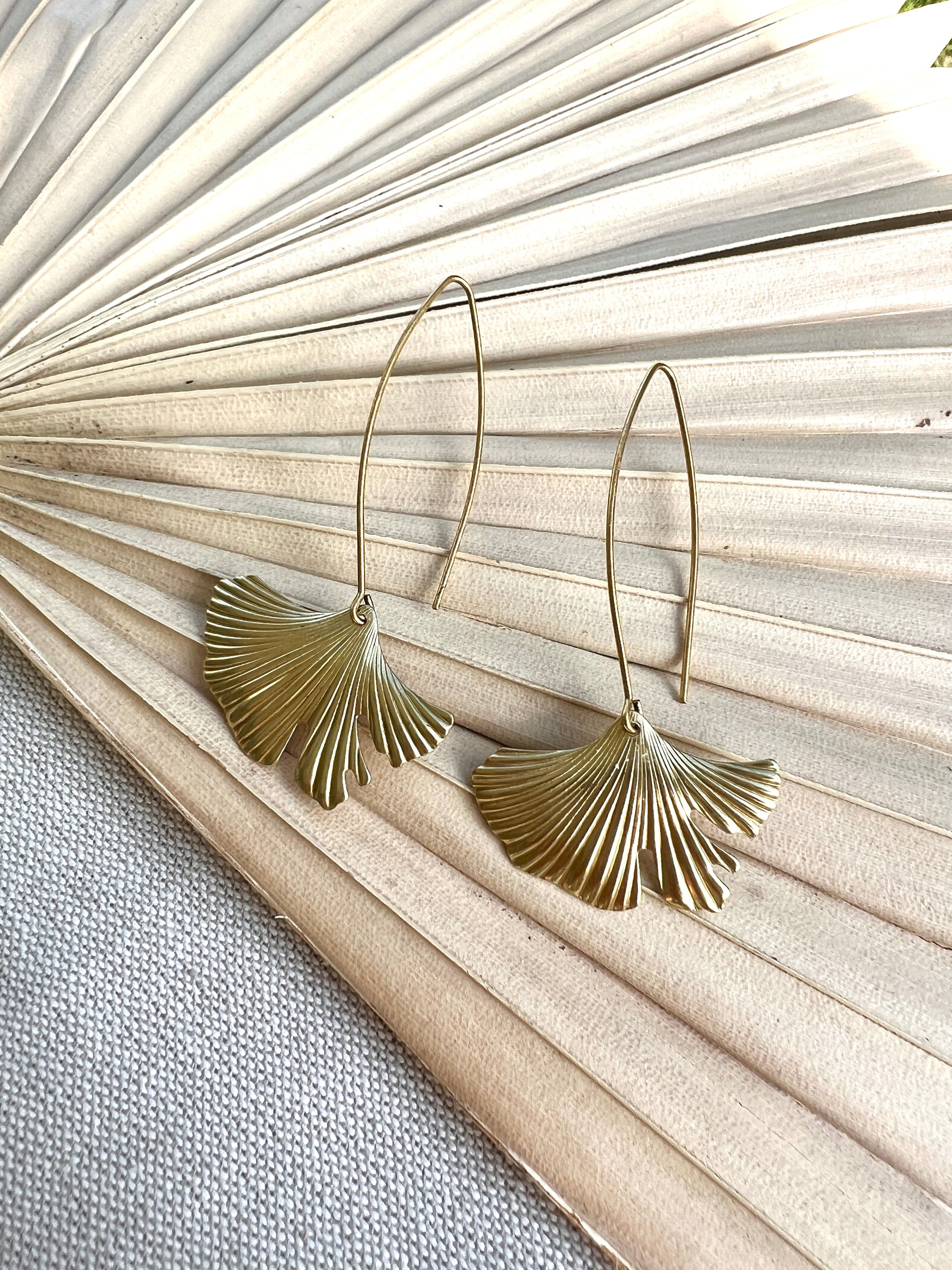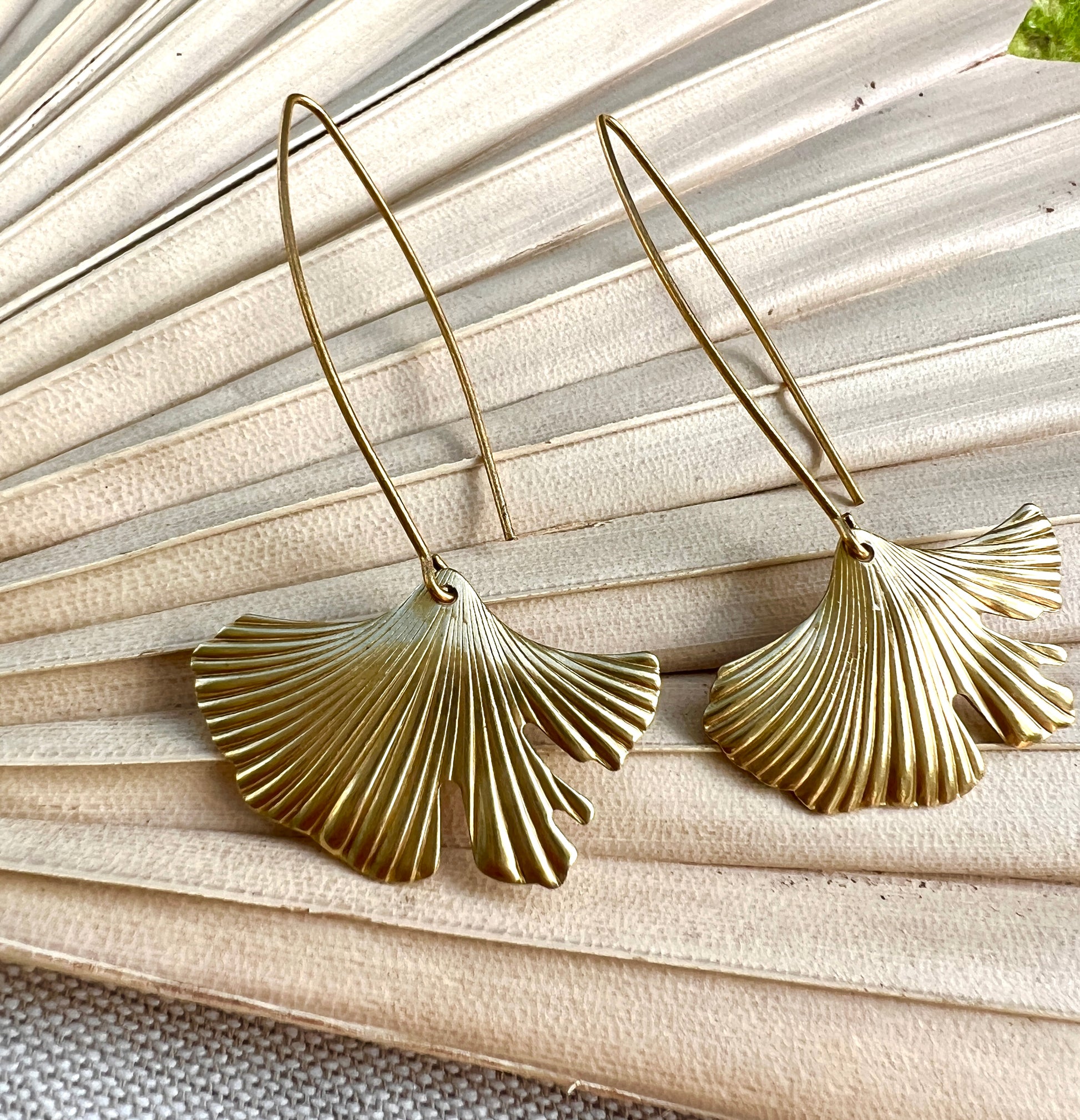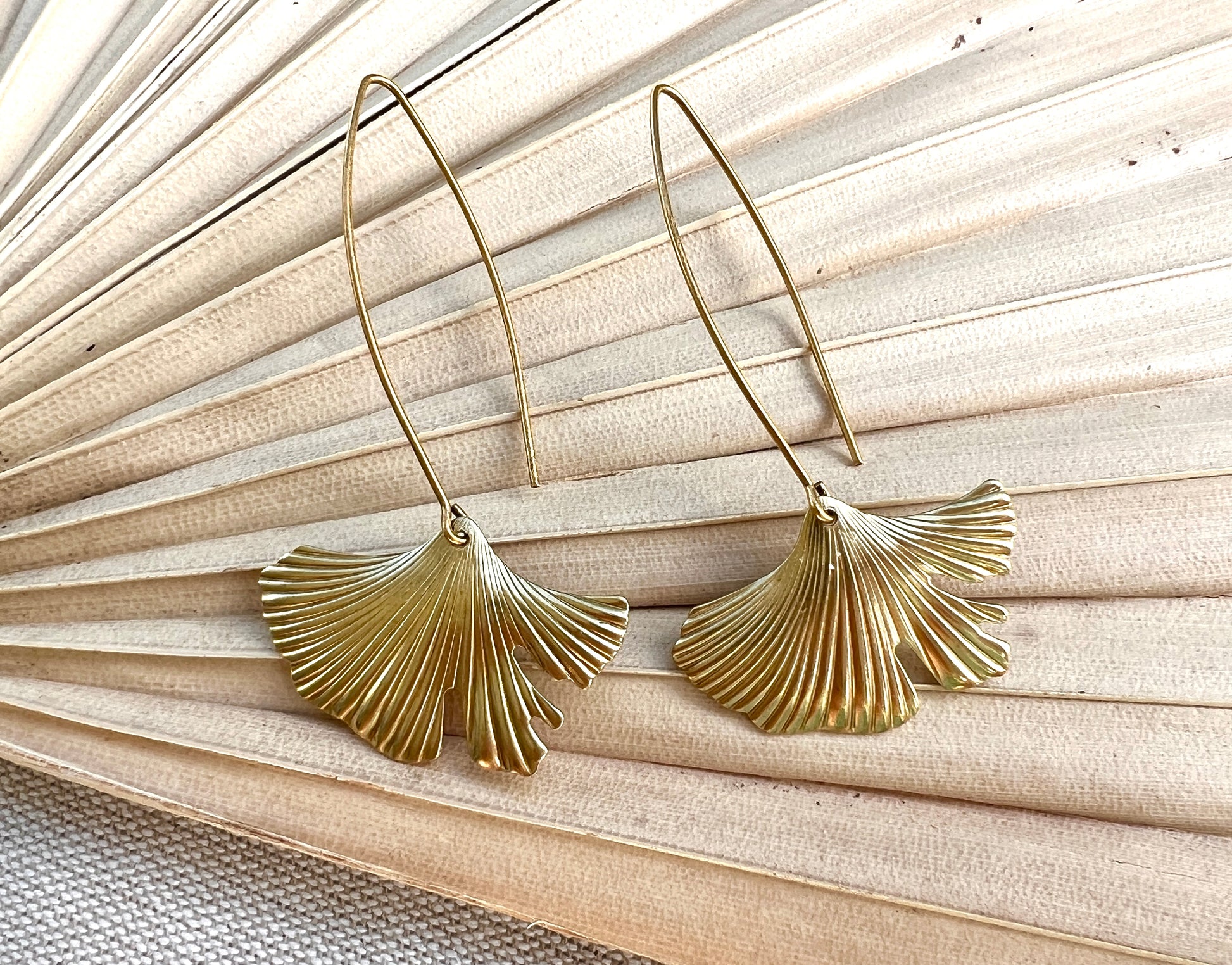These are elegant, light weight earrings. Brass Ginkgo Charms are attached to 24k gold plated ear wires. Earrings from top of wire to base of charm, measure 2 1/2" and are 11/4" at the widest point.