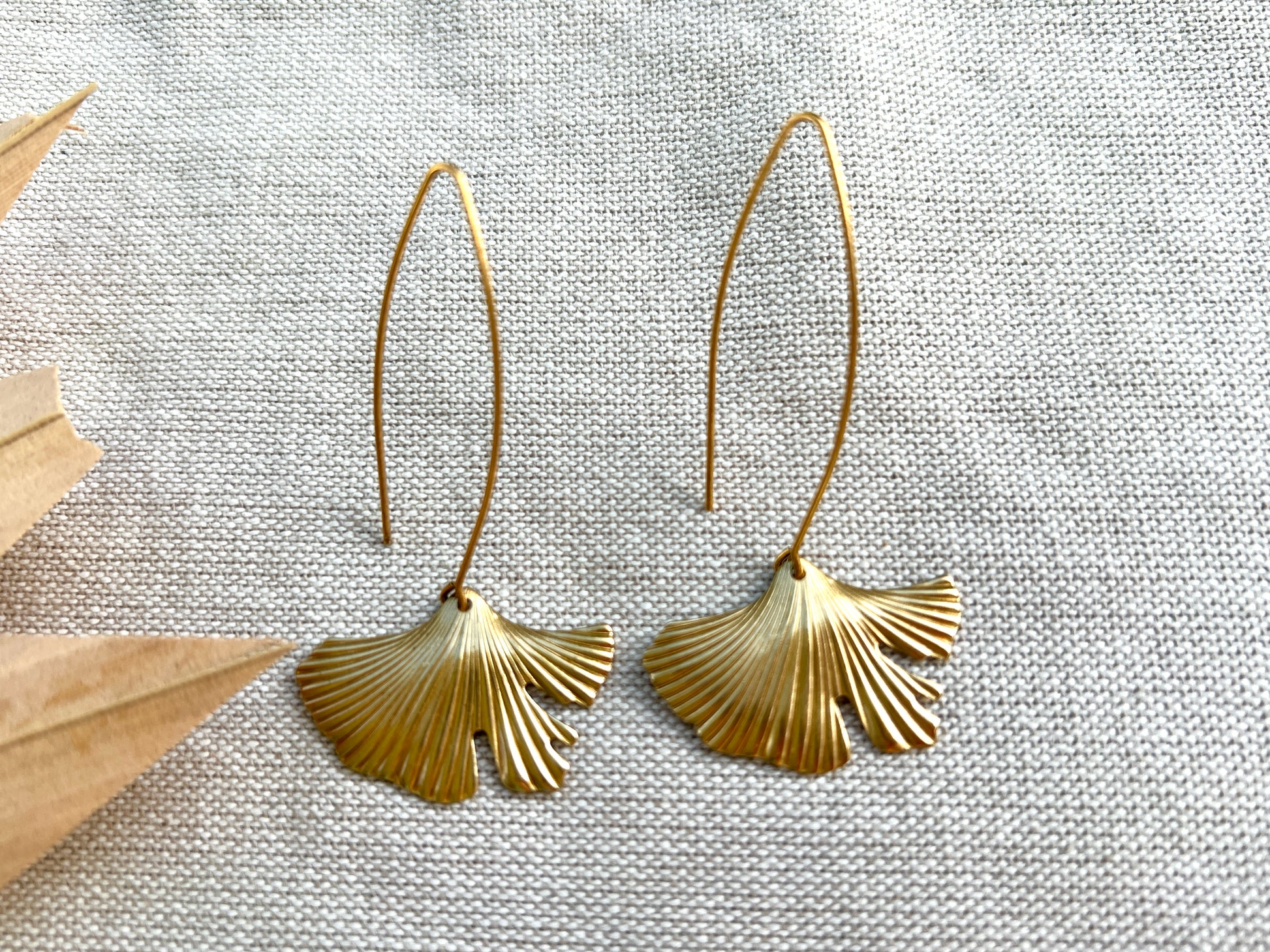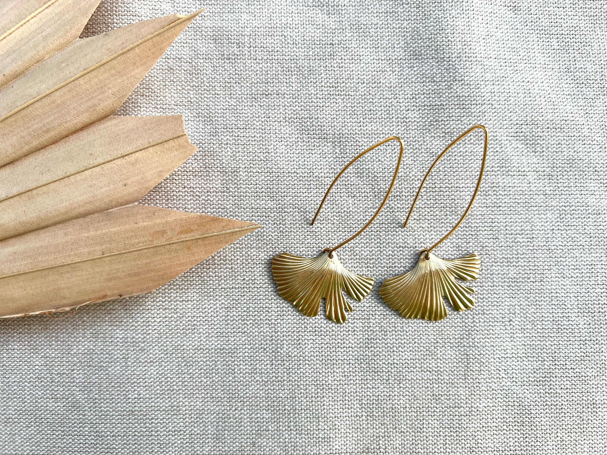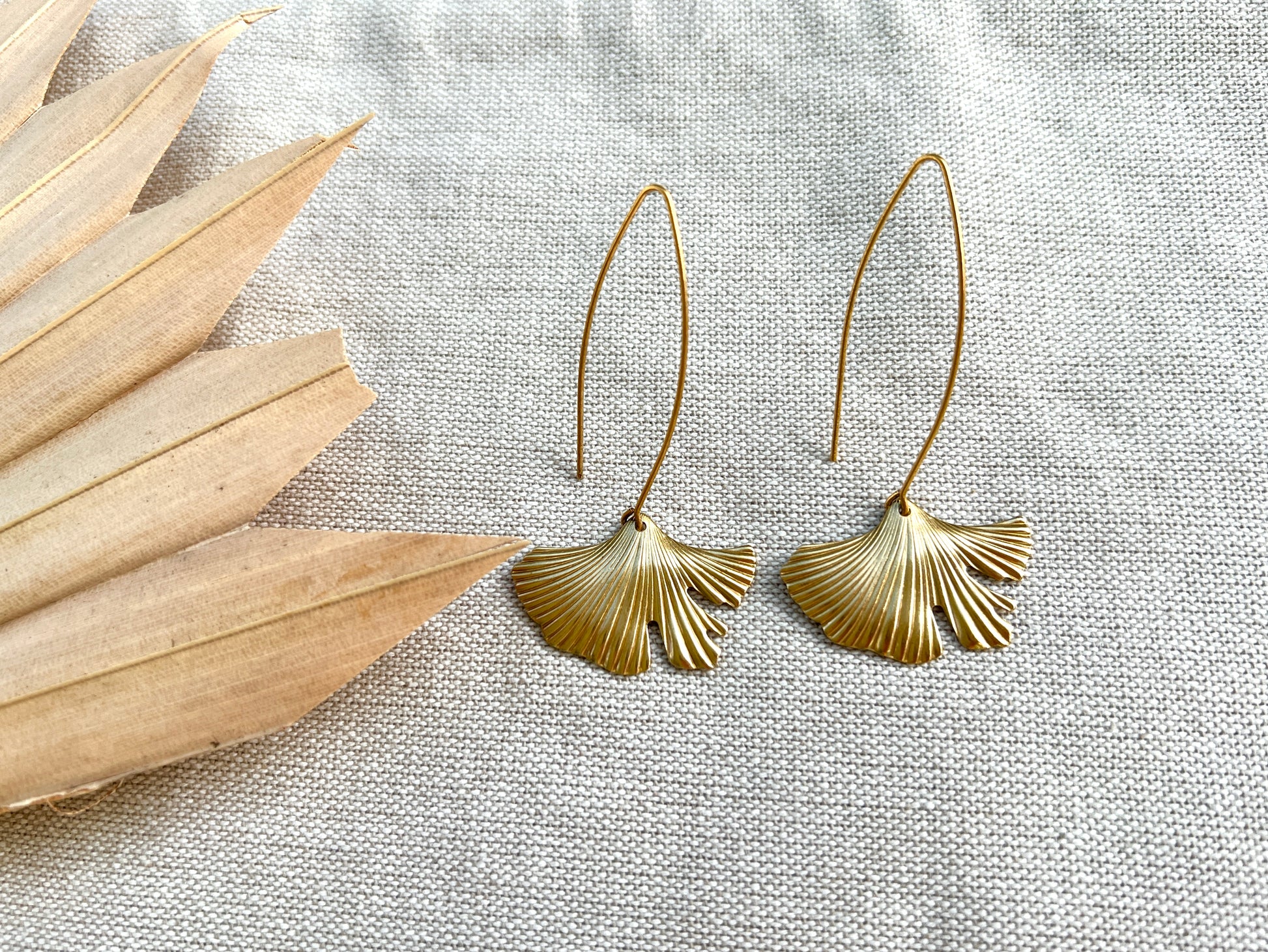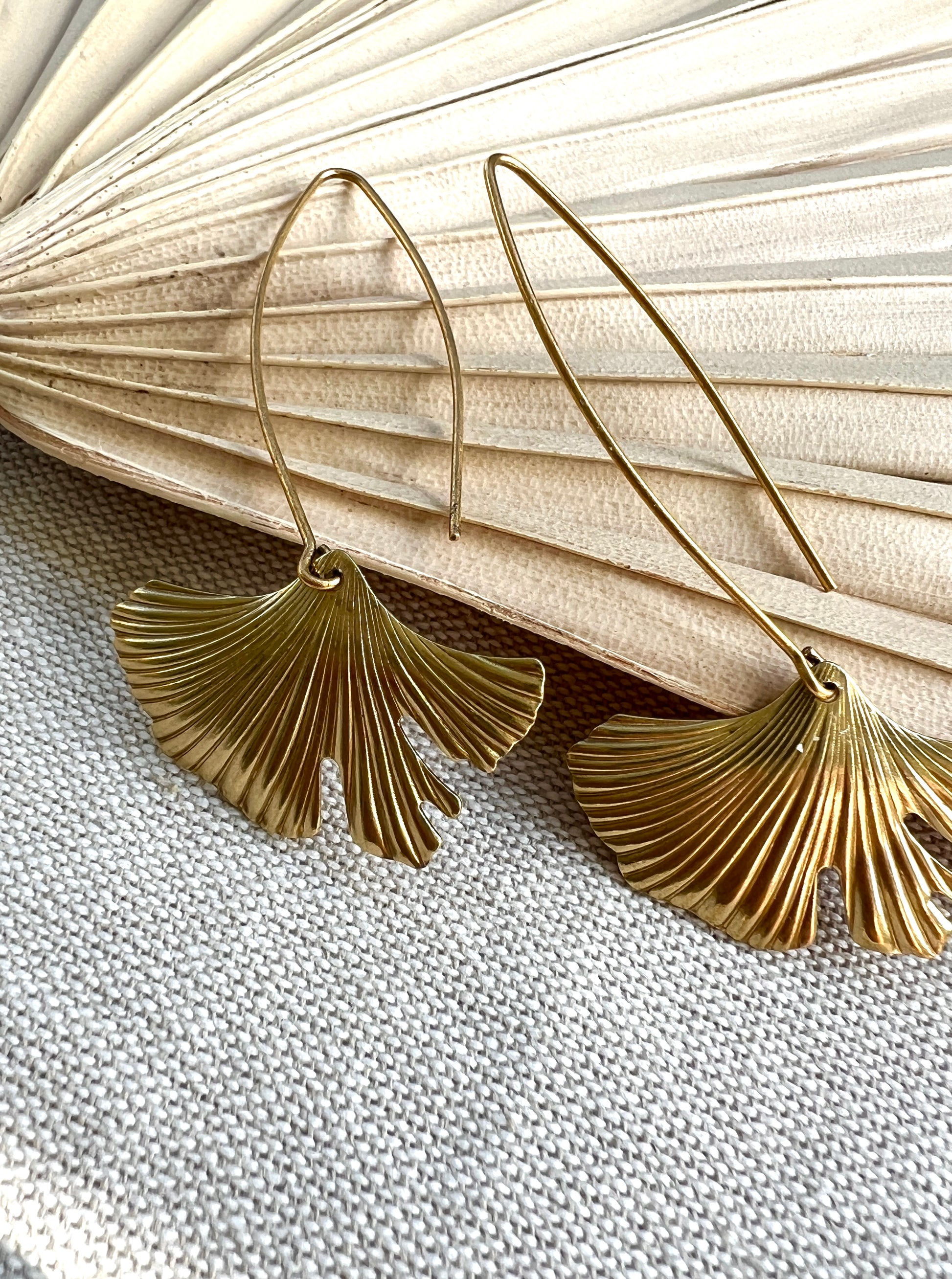These are elegant, light weight earrings. Brass Ginkgo Charms are attached to 24k gold plated ear wires. Earrings from top of wire to base of charm, measure 2 1/2" and are 11/4" at the widest point.