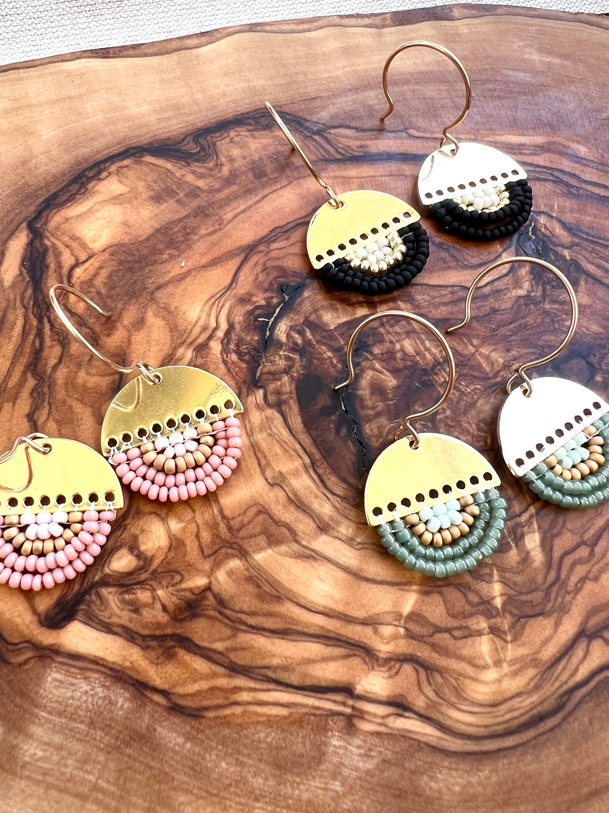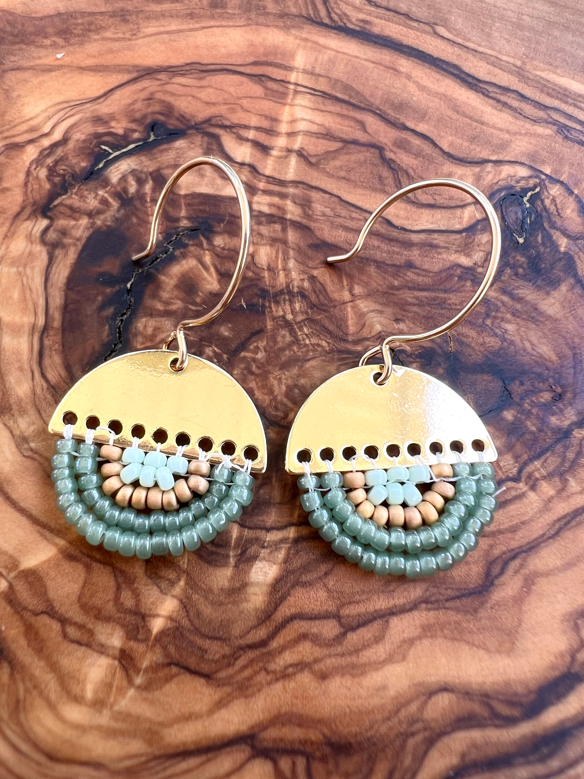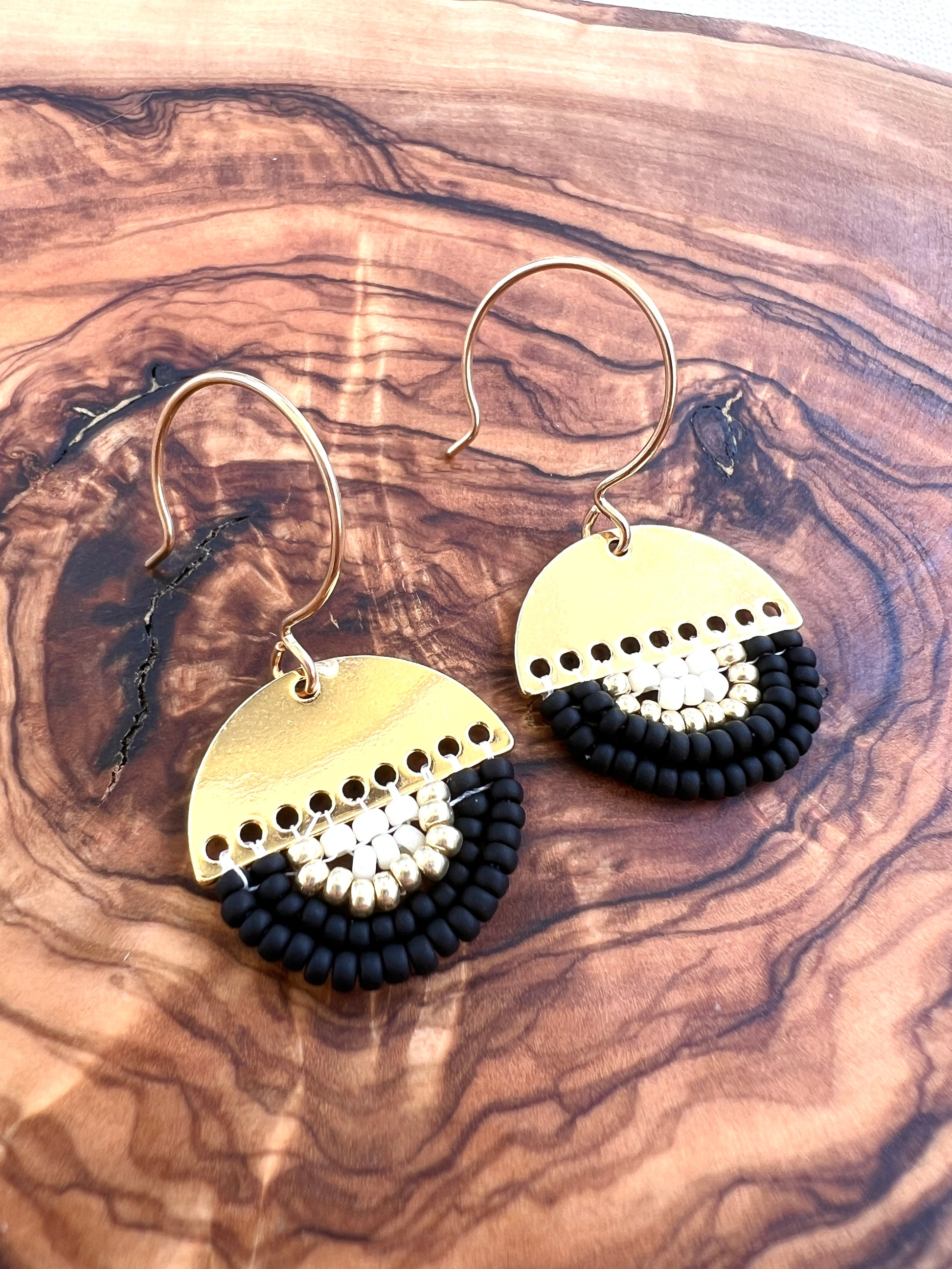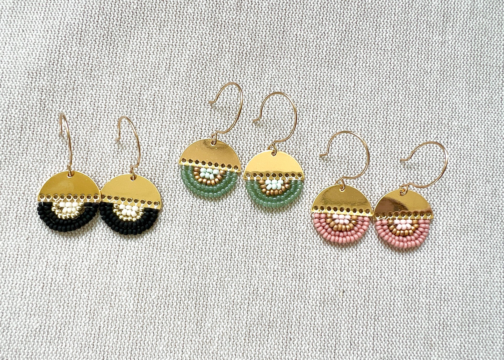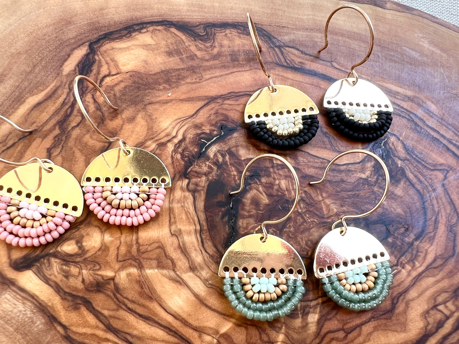 Seed beads are hand woven onto an 18k gold half circle. Earrings are attached to 14k gold filled wires. These are light weight and add modern flair to your wardrobe!