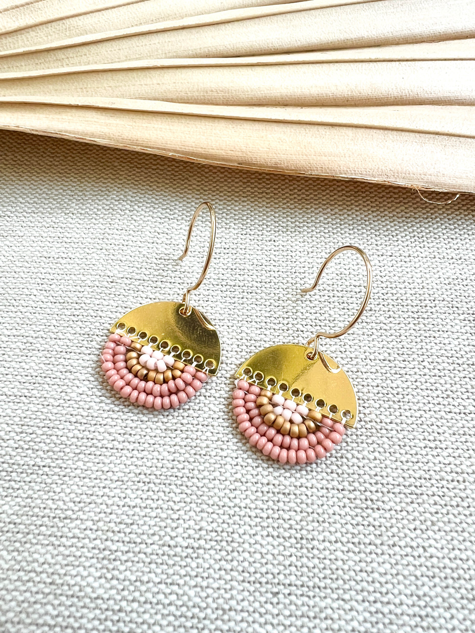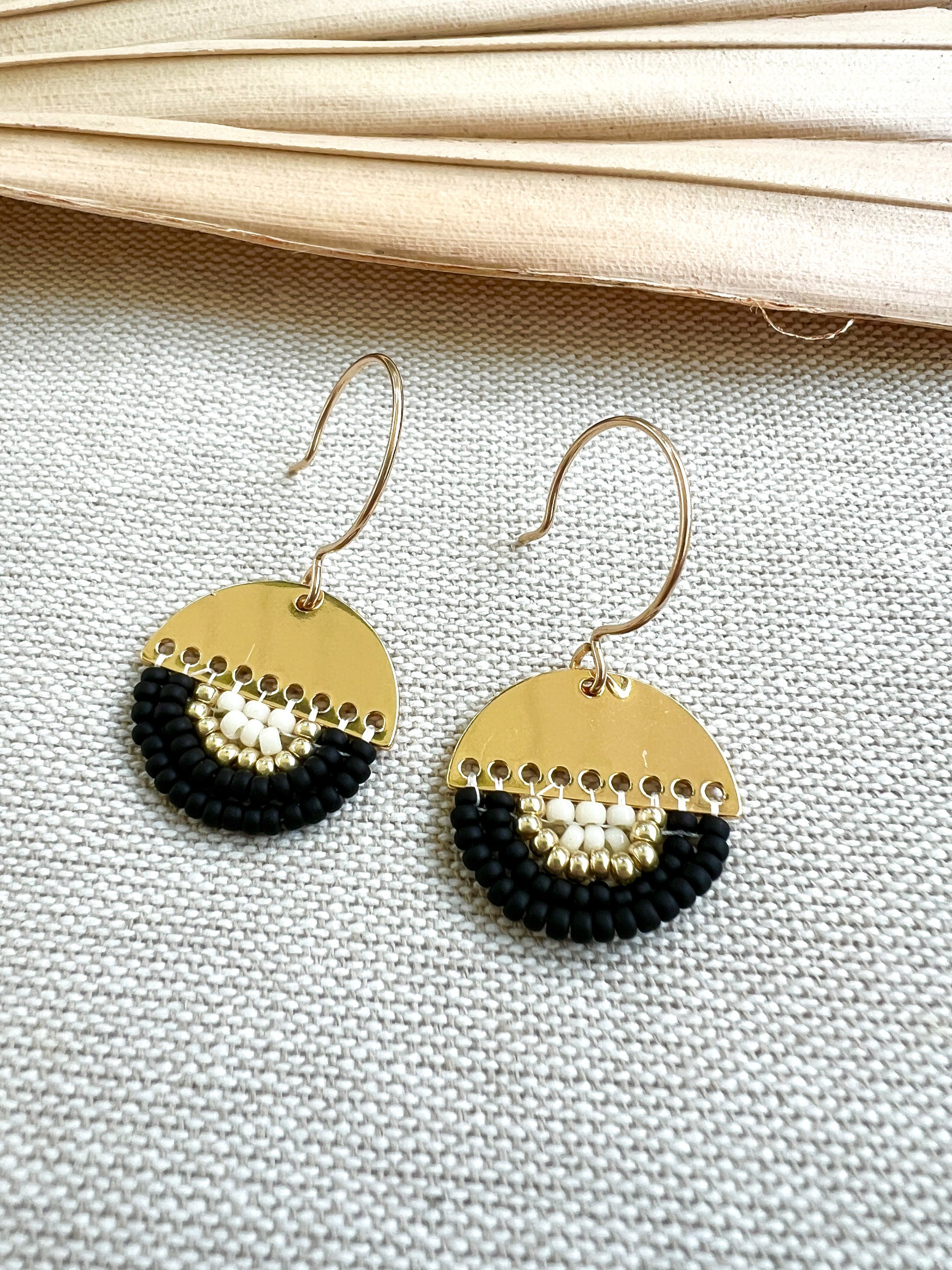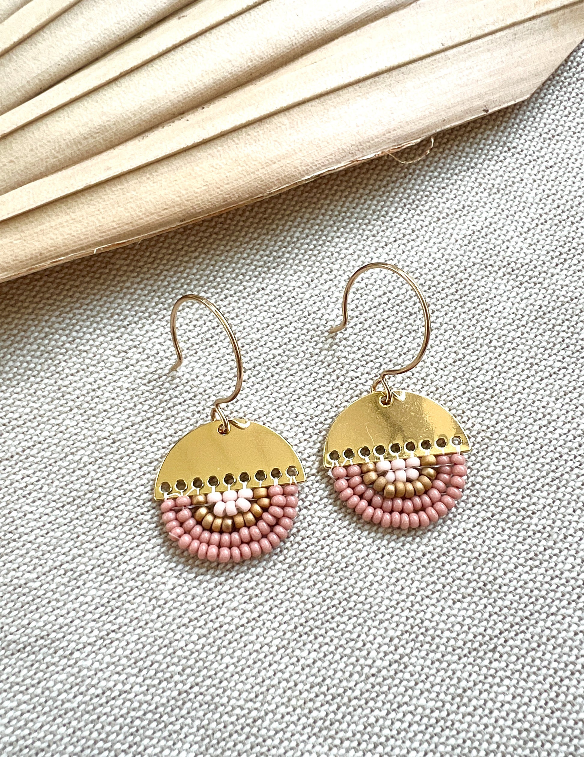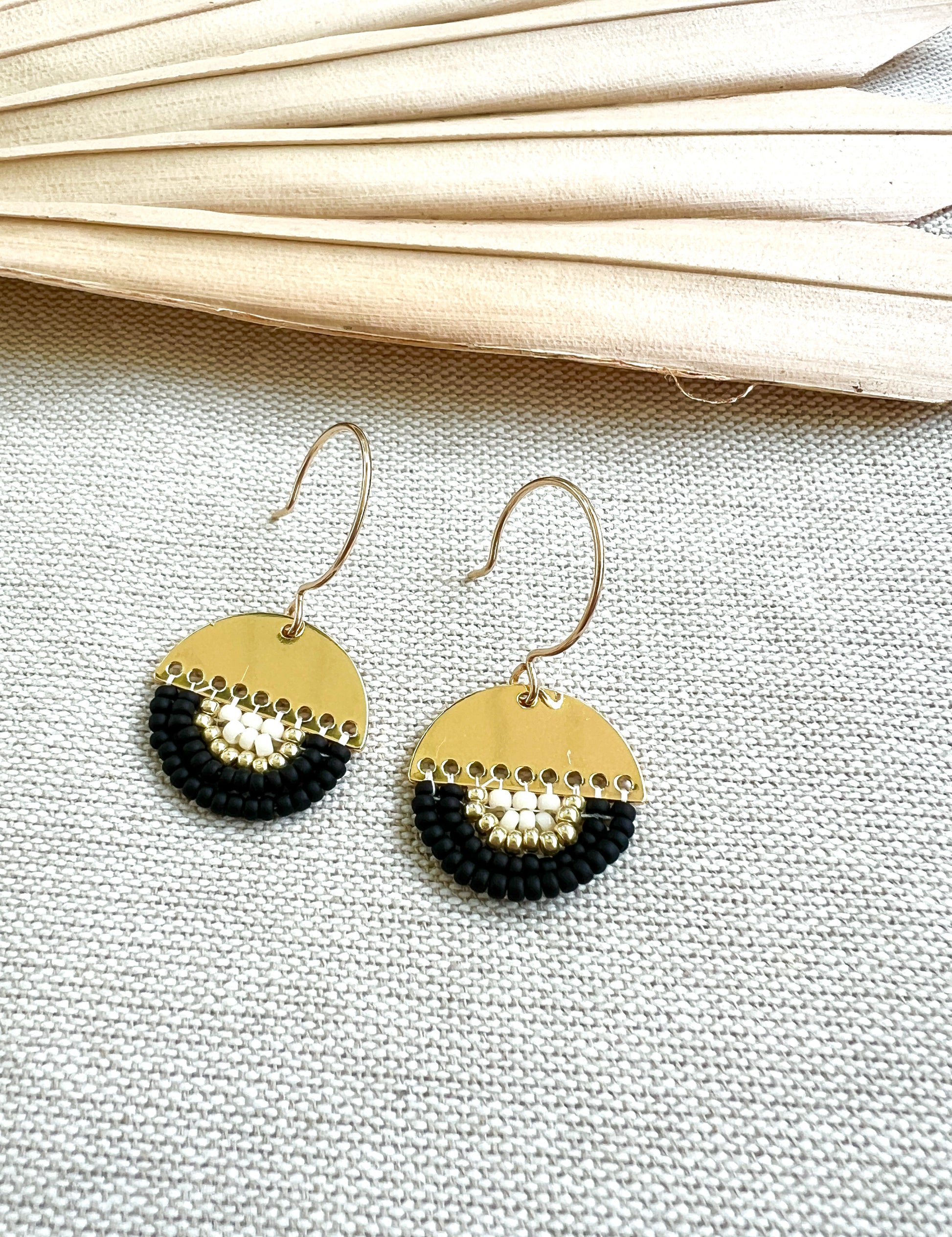 Seed beads are hand woven onto an 18k gold half circle. Earrings are attached to 14k gold filled wires. These are light weight and add modern flair to your wardrobe!