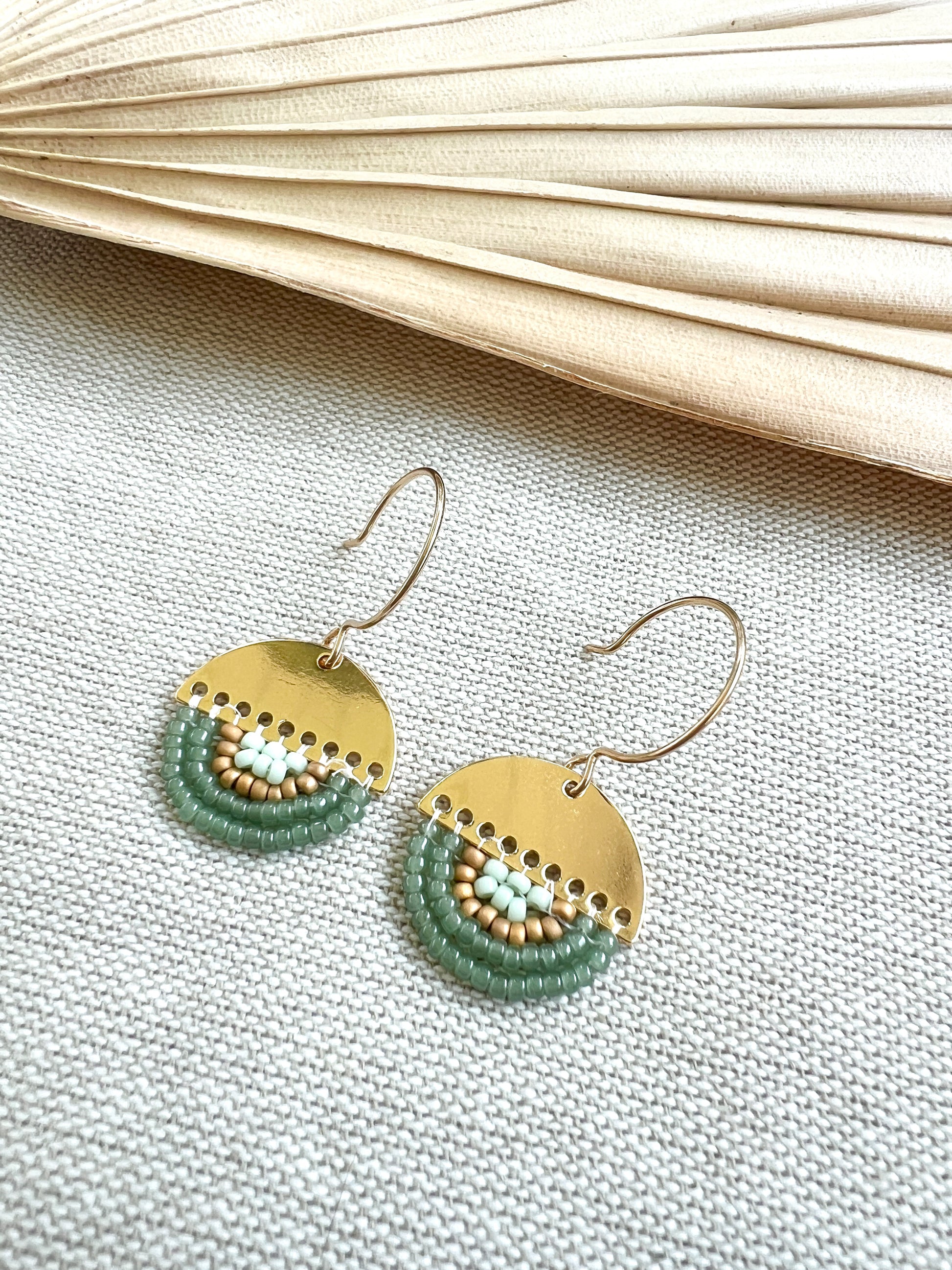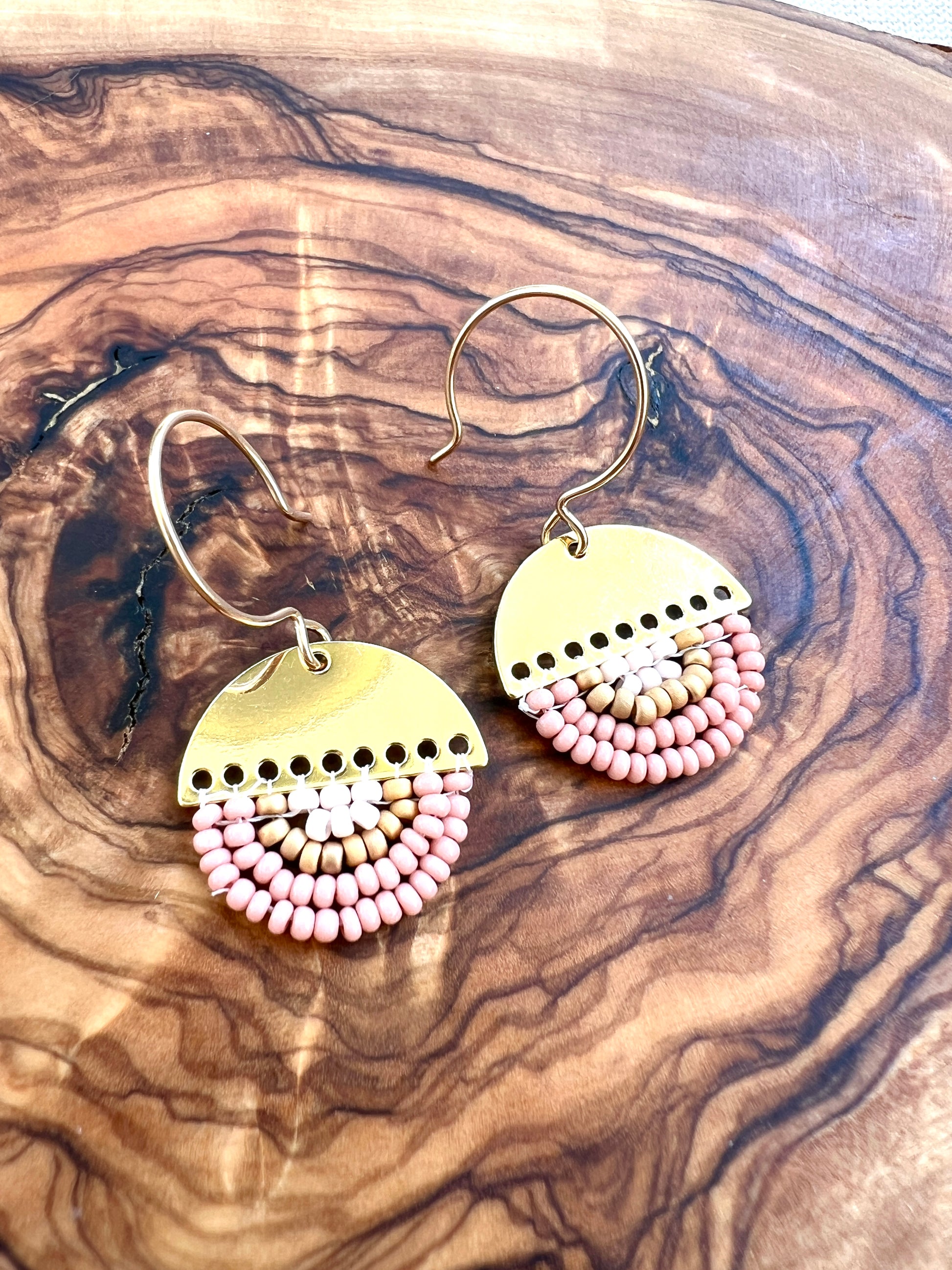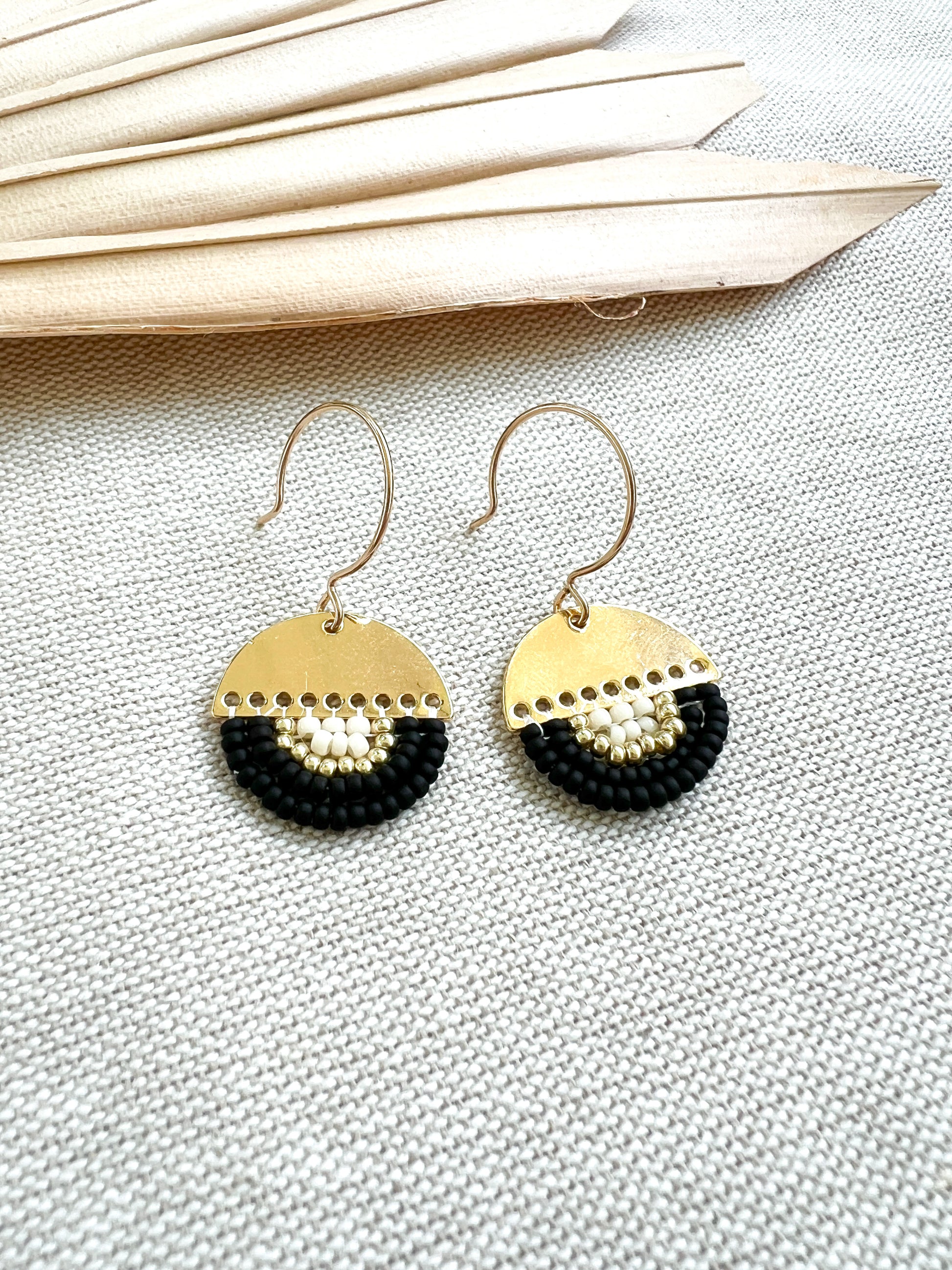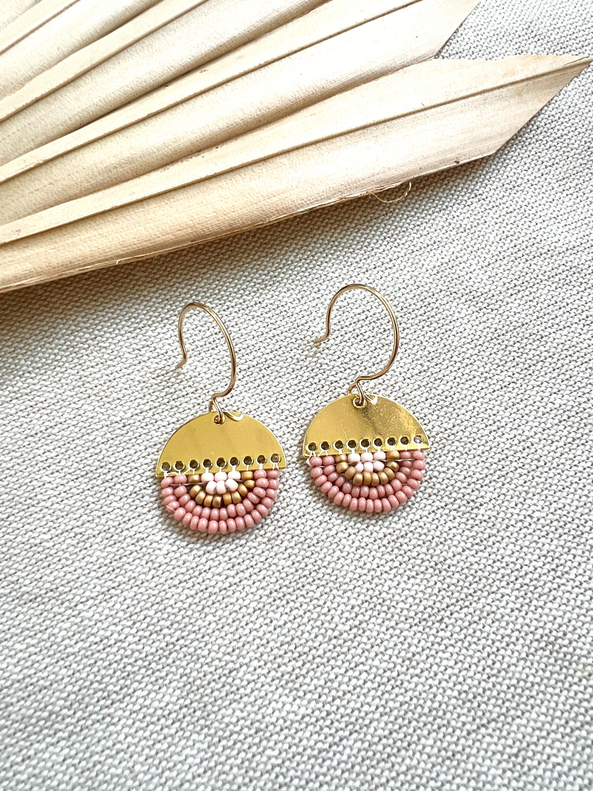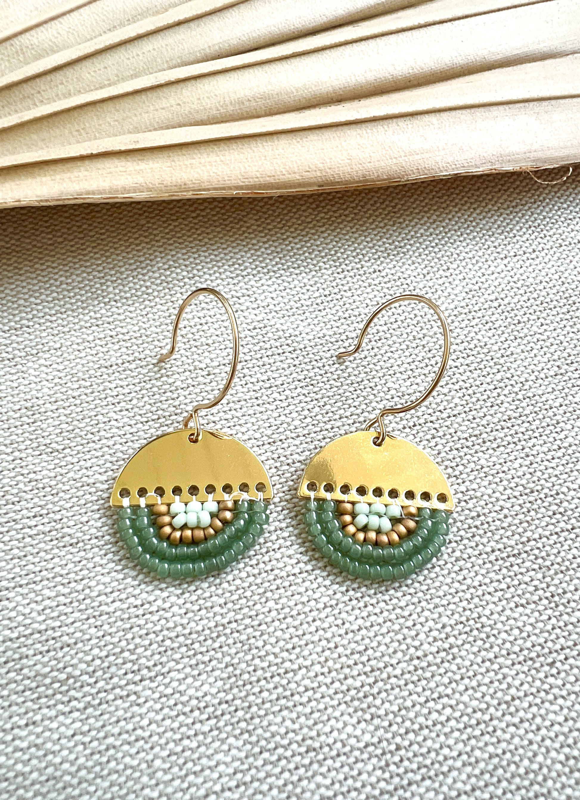 Seed beads are hand woven onto an 18k gold half circle. Earrings are attached to 14k gold filled wires. These are light weight and add modern flair to your wardrobe!