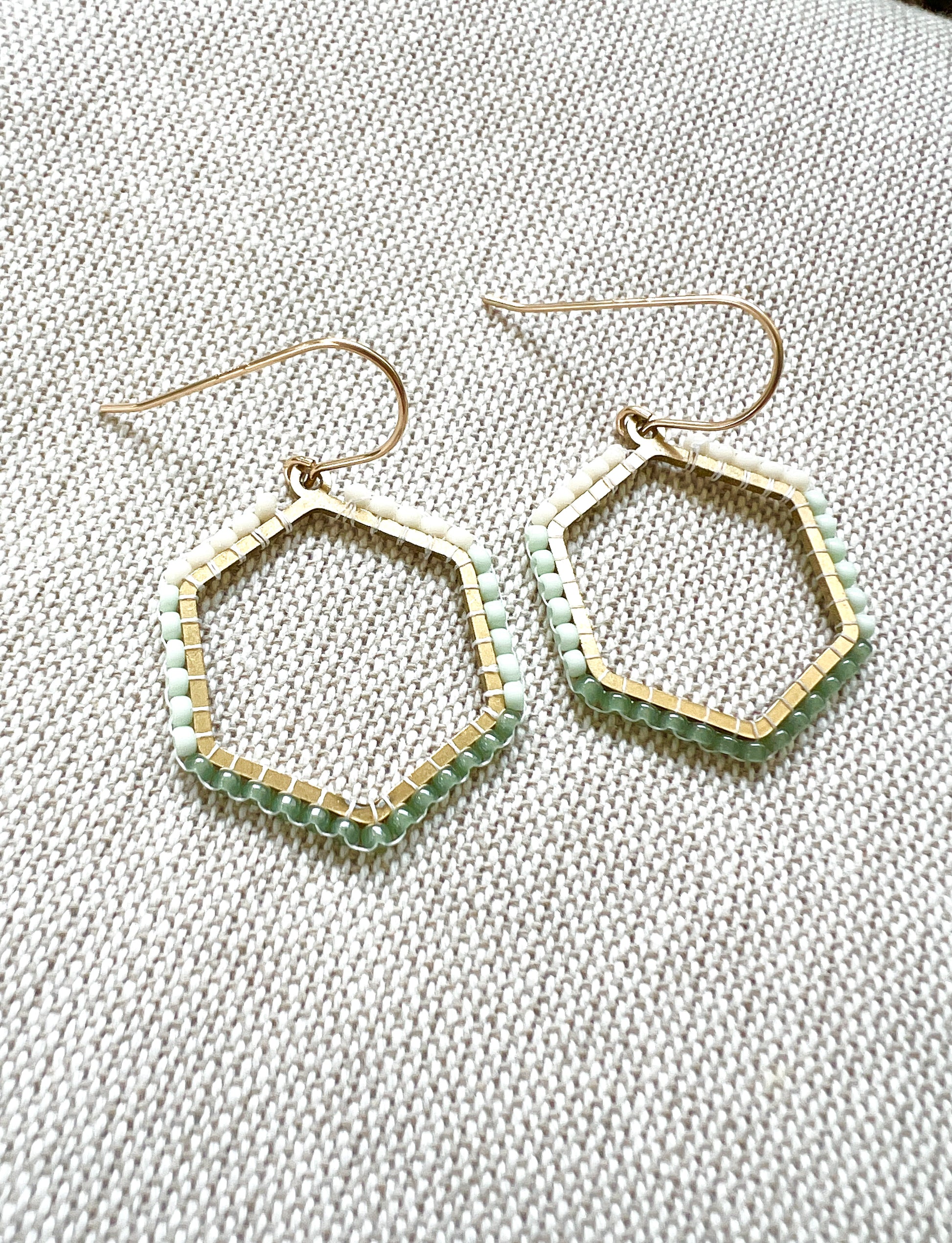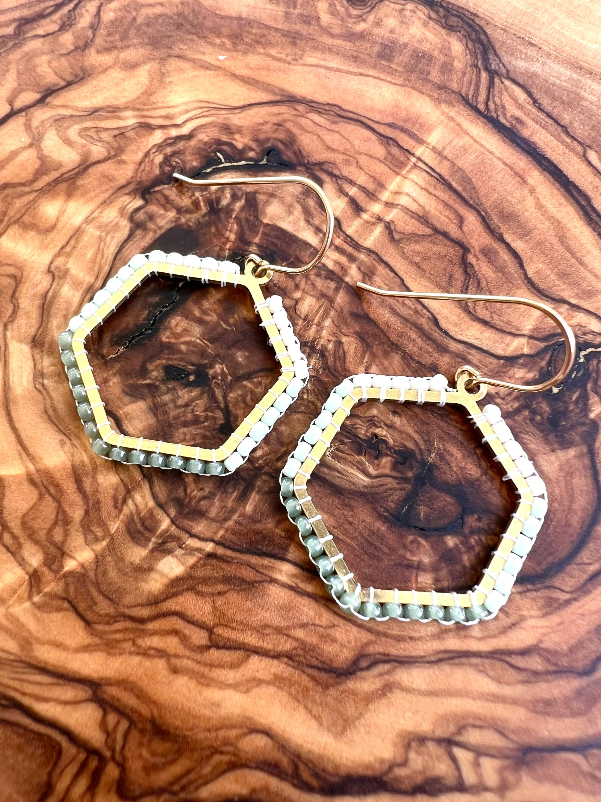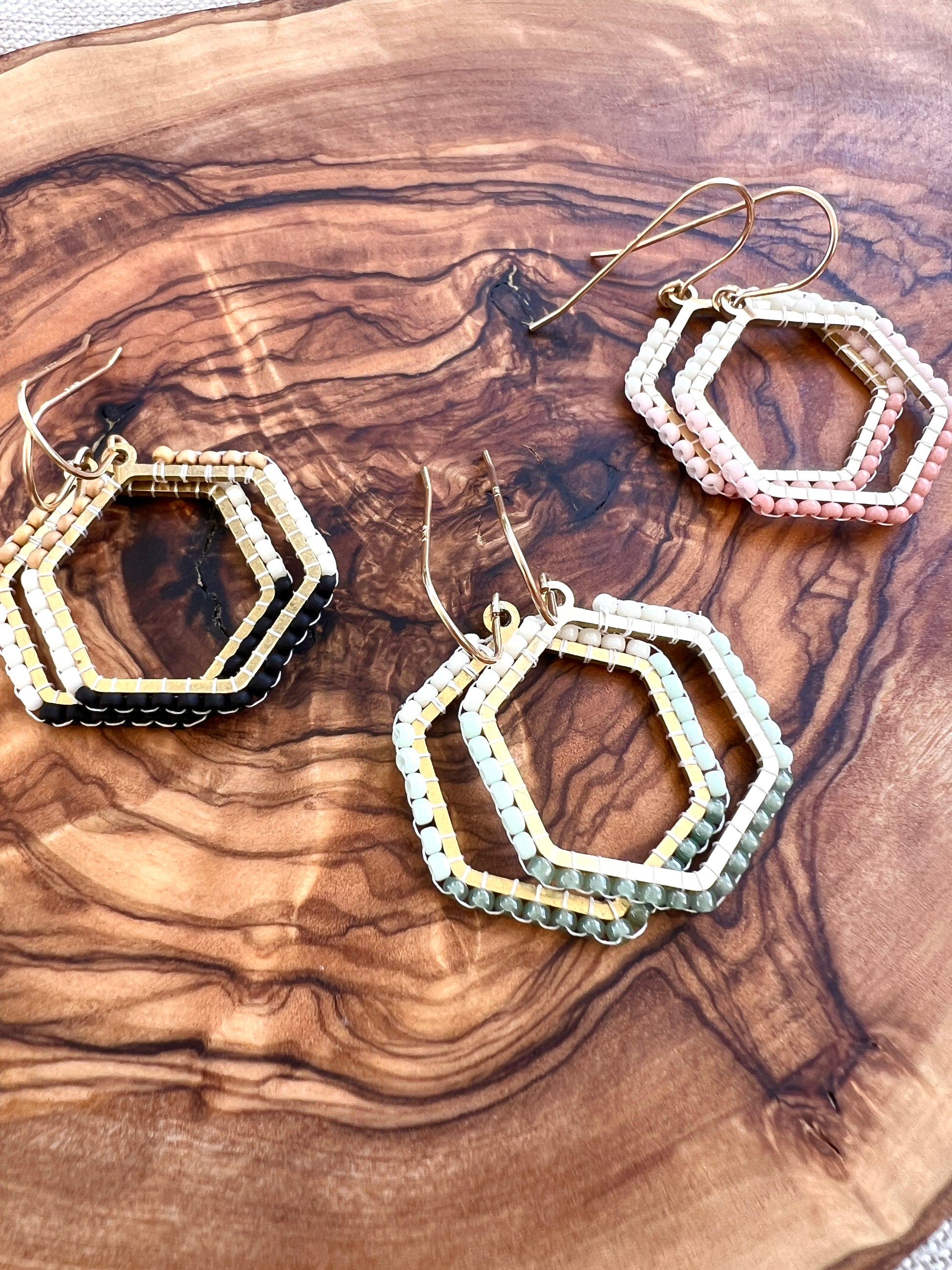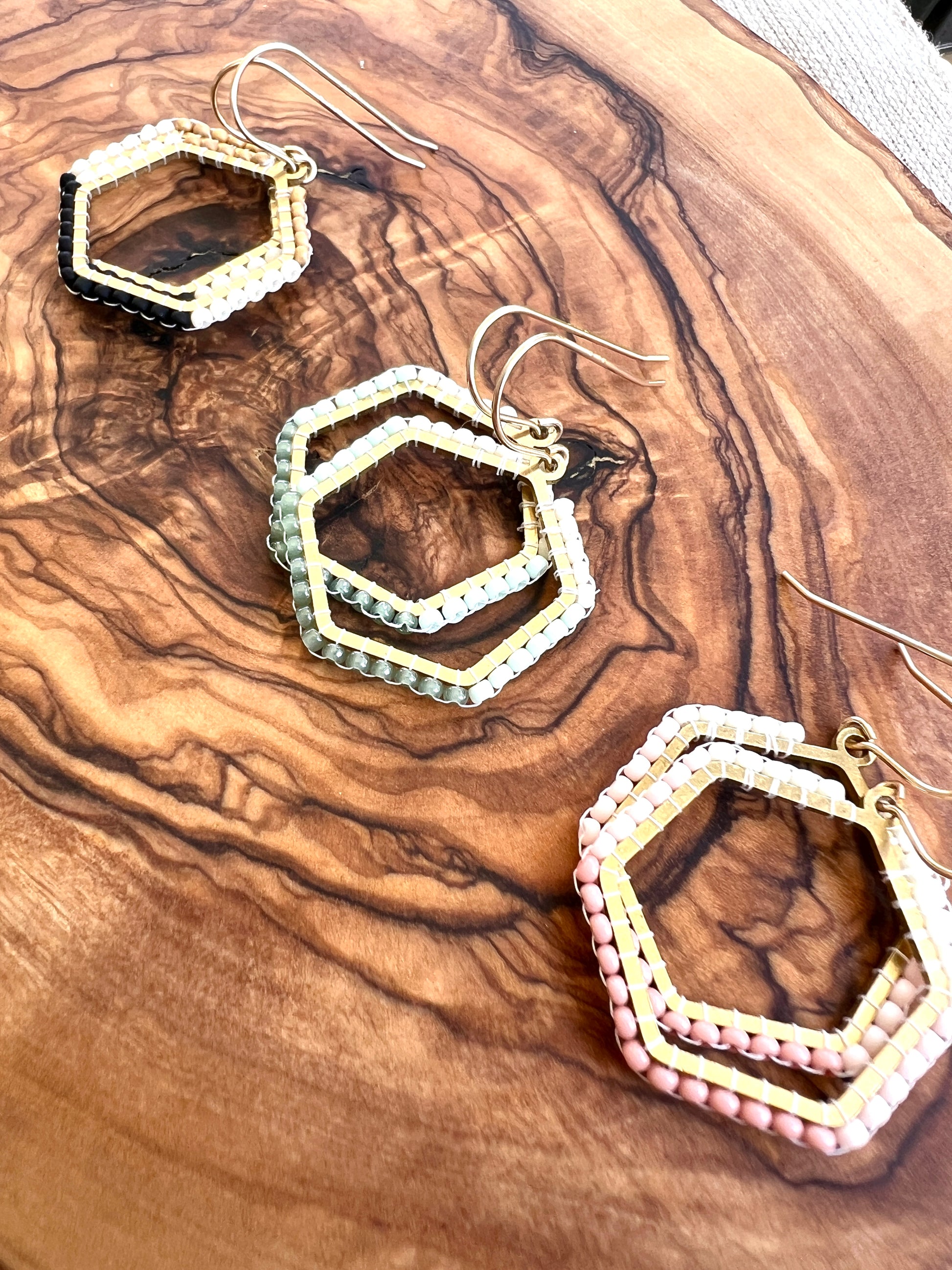 Miyuki beads are hand woven onto a brass hexagon hoop in a color block pattern. Earrings are attached to 14k gold filled wires. These are light weight and modern flair to your wardrobe! Customers have the choice between dusty pink, sage or black.
