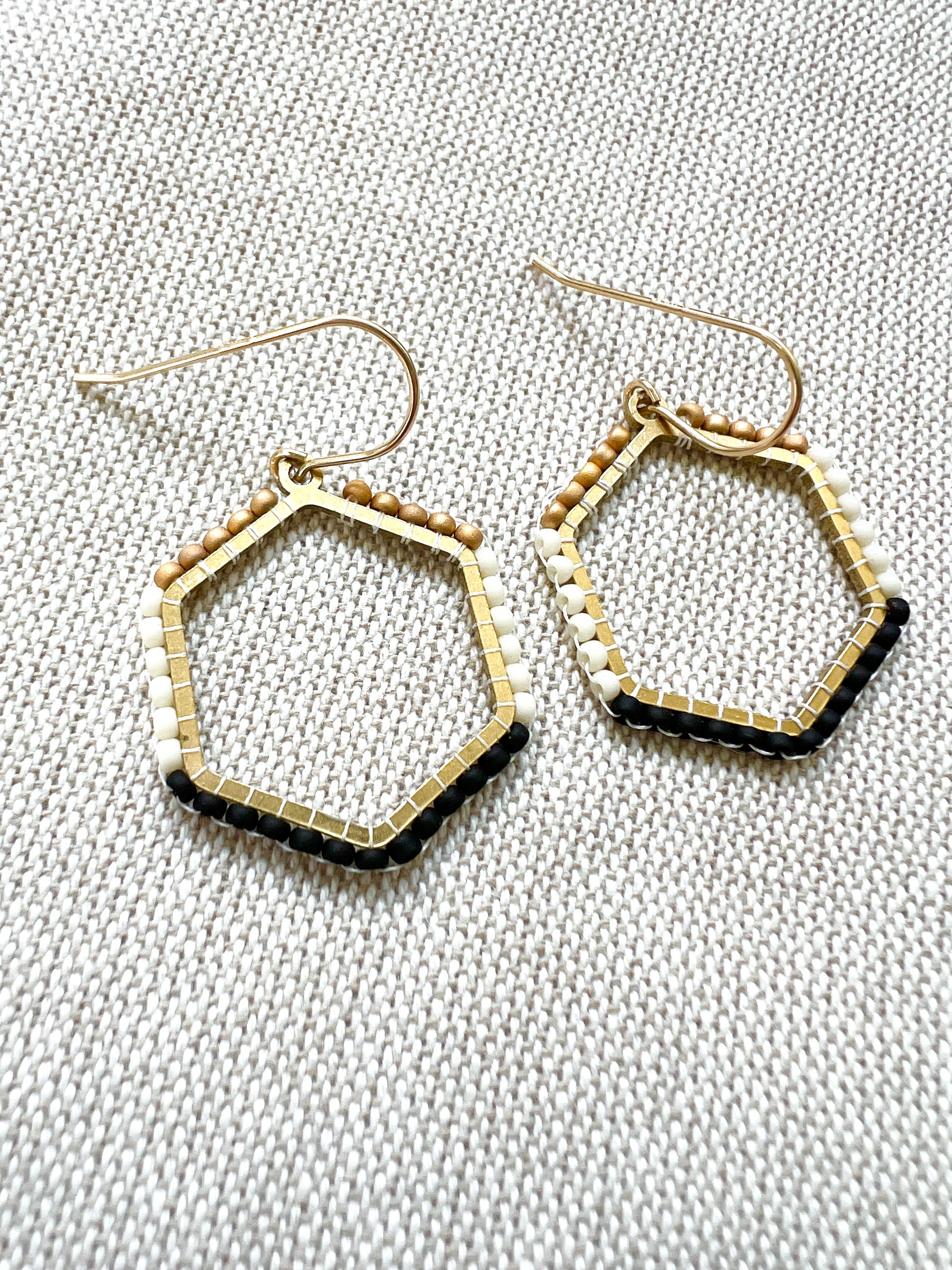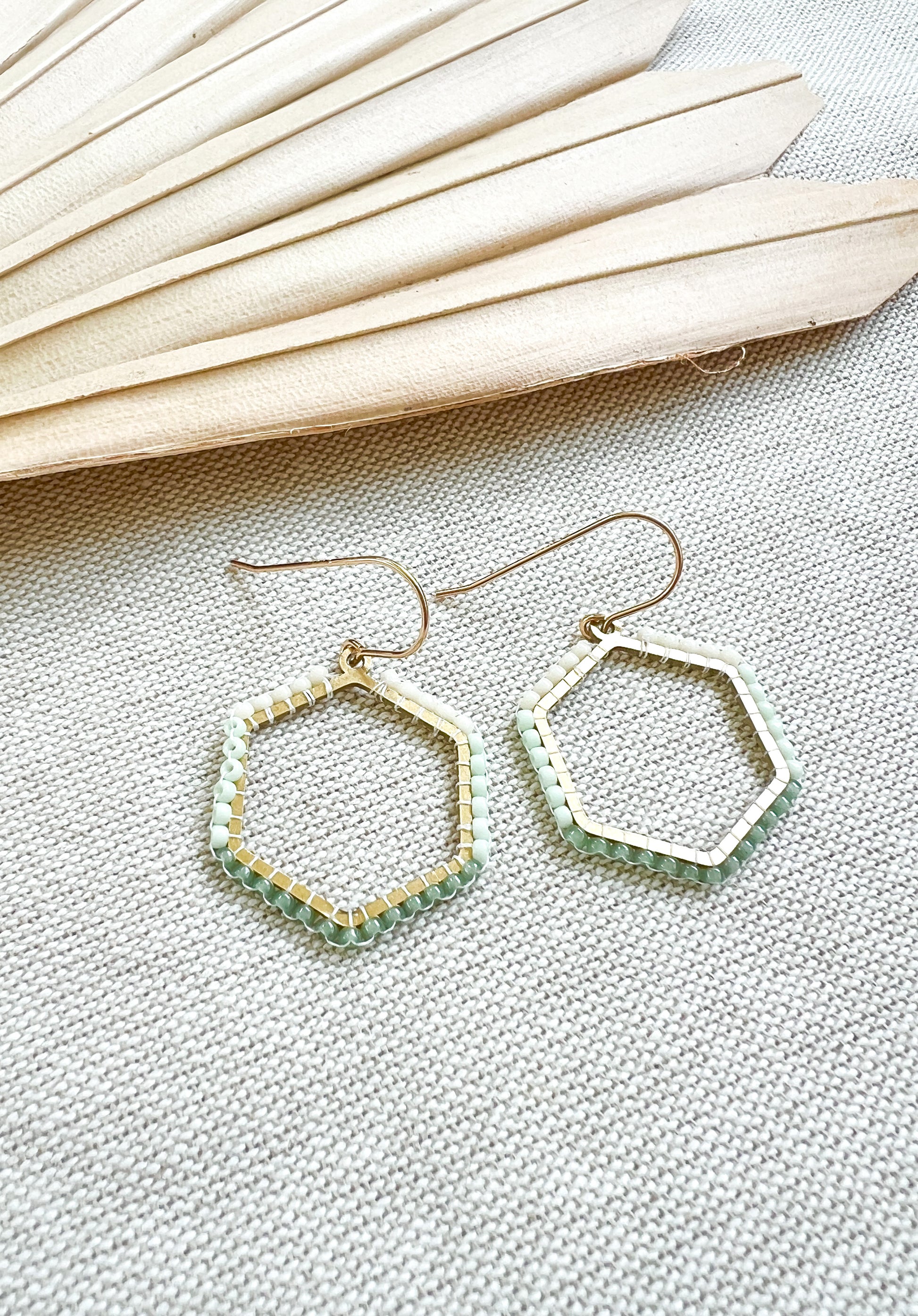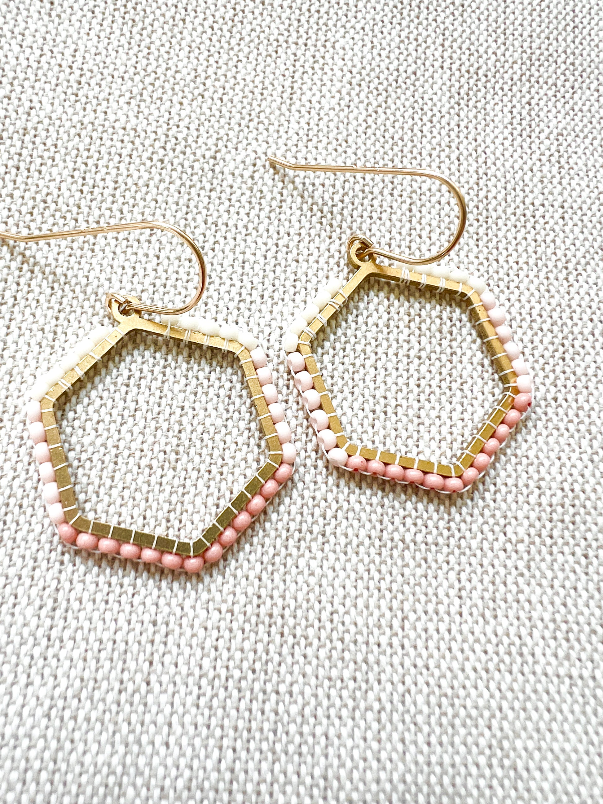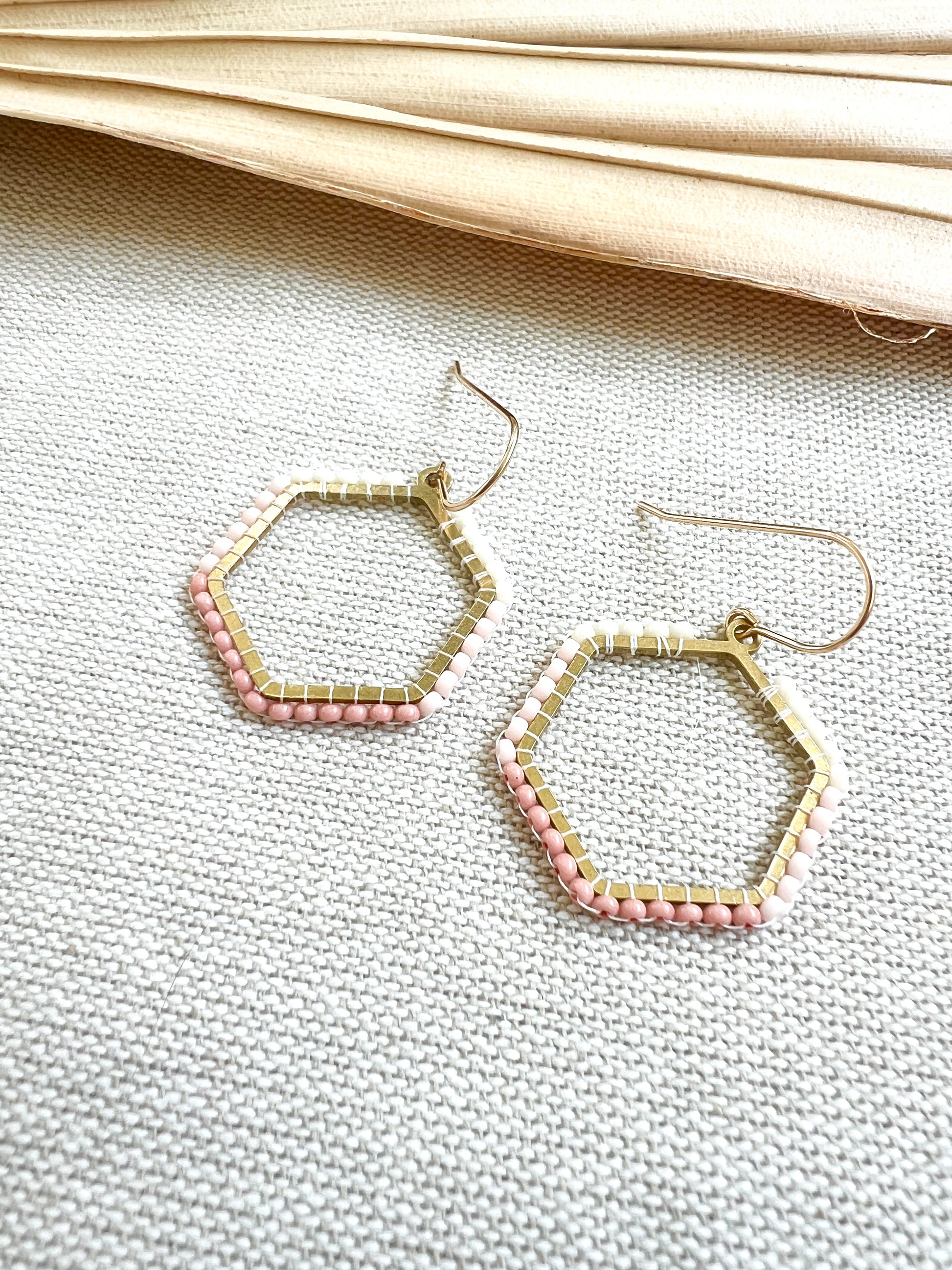 Miyuki beads are hand woven onto a brass hexagon hoop in a color block pattern. Earrings are attached to 14k gold filled wires. These are light weight and modern flair to your wardrobe! Customers have the choice between dusty pink, sage or black.