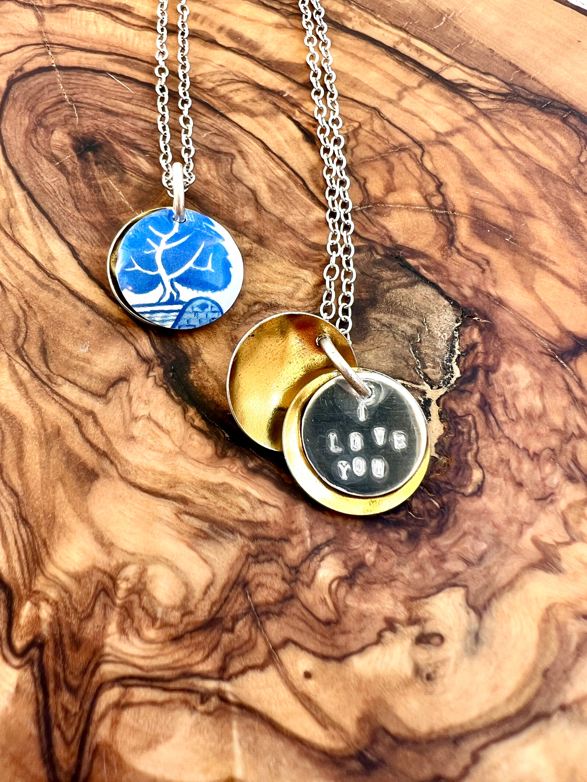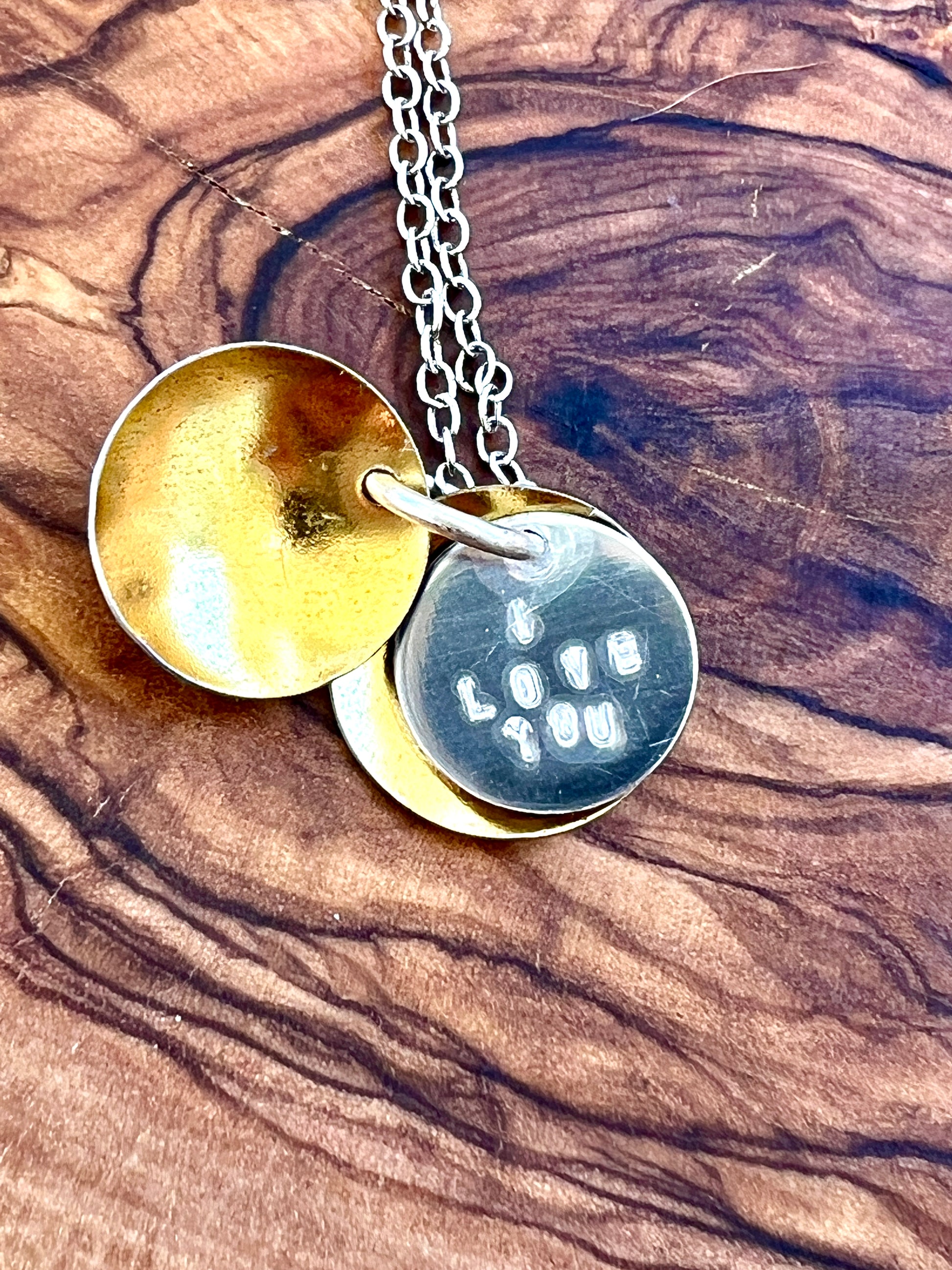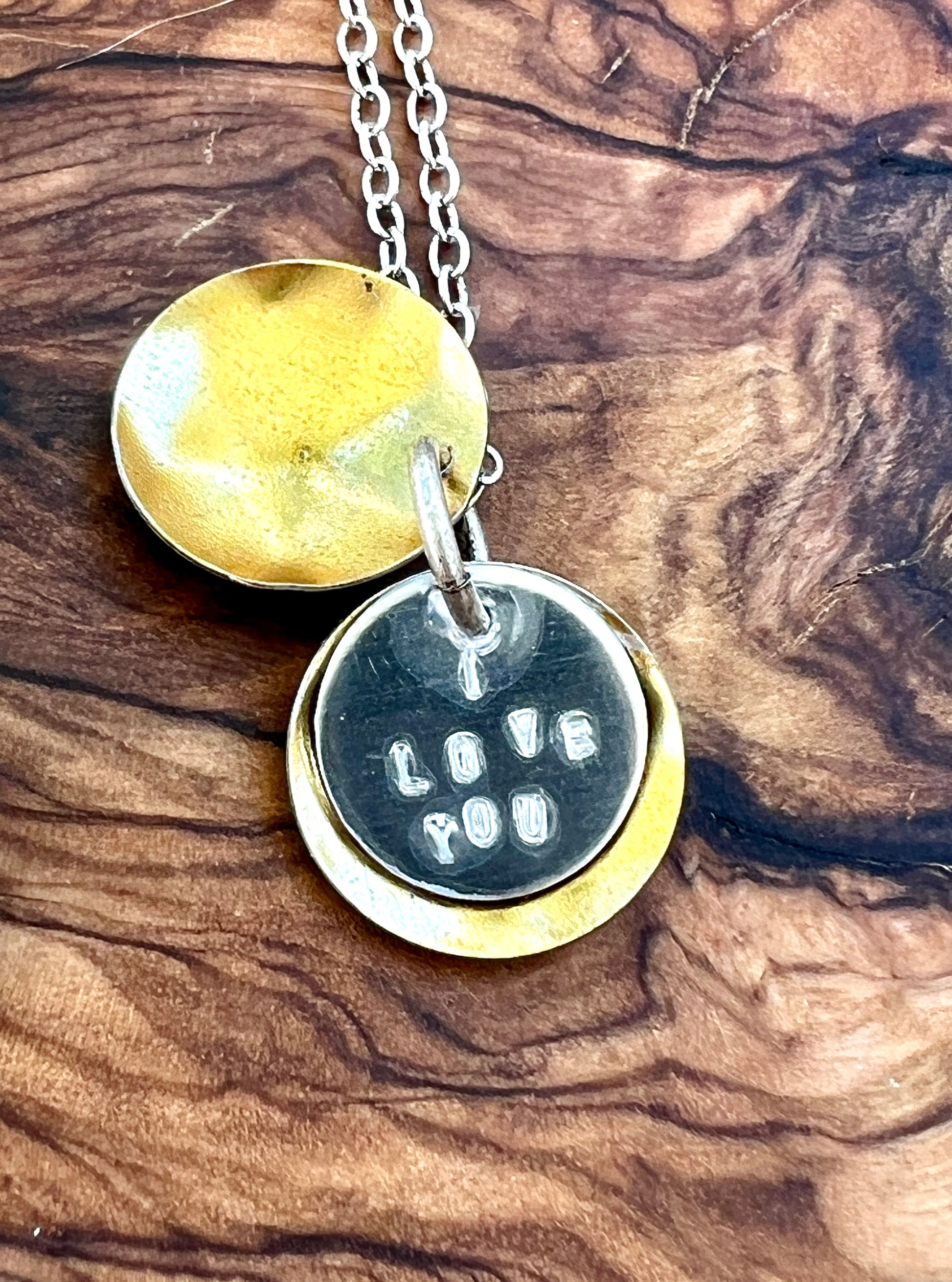 A petite piece that is large on sentiment! Two pieces of a vintage tin container have been cut into circular shapes and hand domed to create a "locket" effect. A hand cut stainless steel disc is hand stamped with the words "I love you" and layered between the two pieces. Pendant measures 5/8" and is attached to a .999 fine silver plated 18" chain that has a sturdy lobster clasp attached. The necklace is light weight. Each necklace is unique, as the tin is cut on different parts of the pattern on the tin. Please see all listing pictures to see samples of the variations in the necklace. Please note due to the vintage nature, the tin may have slight scratches on the tin.
