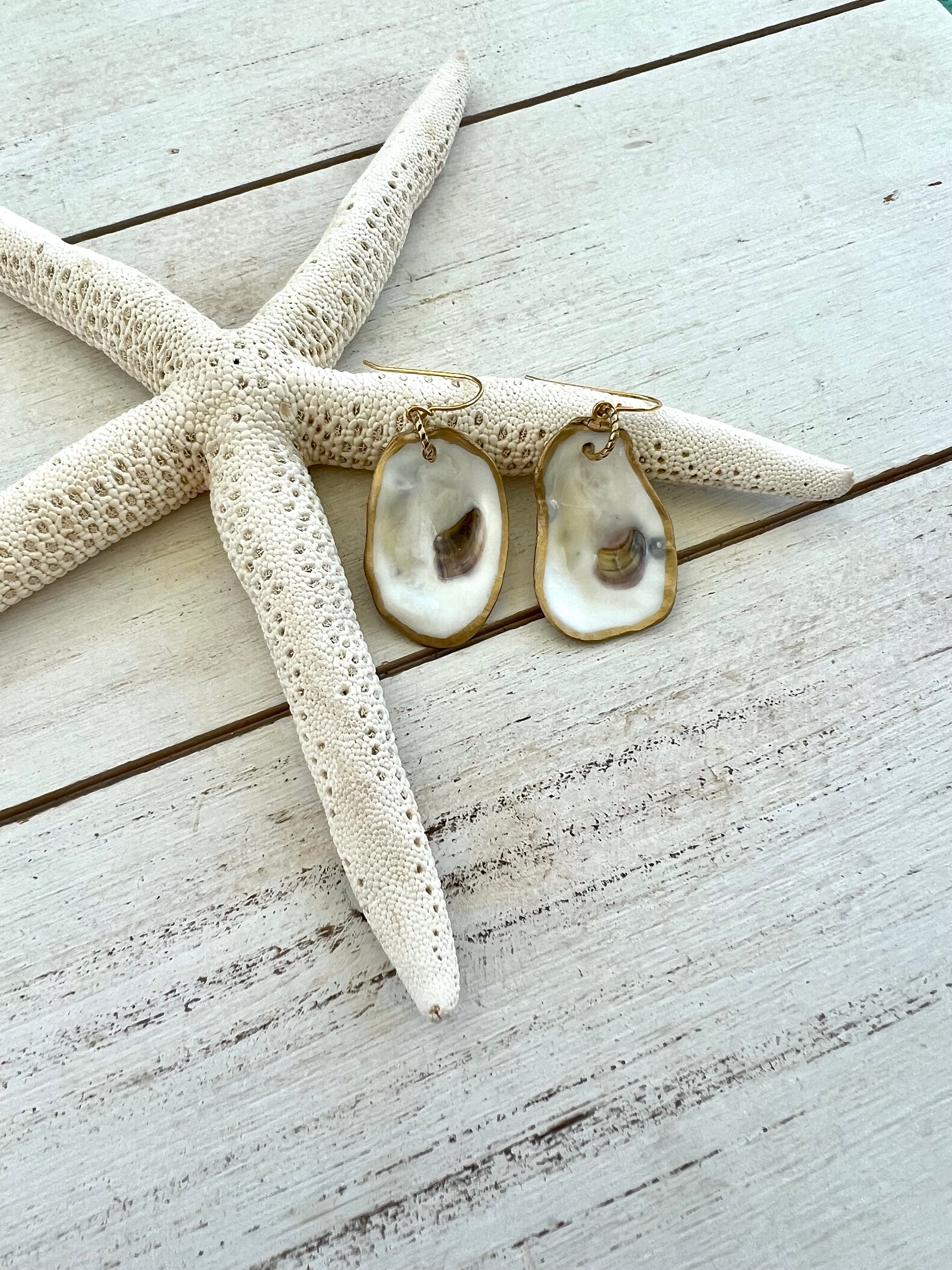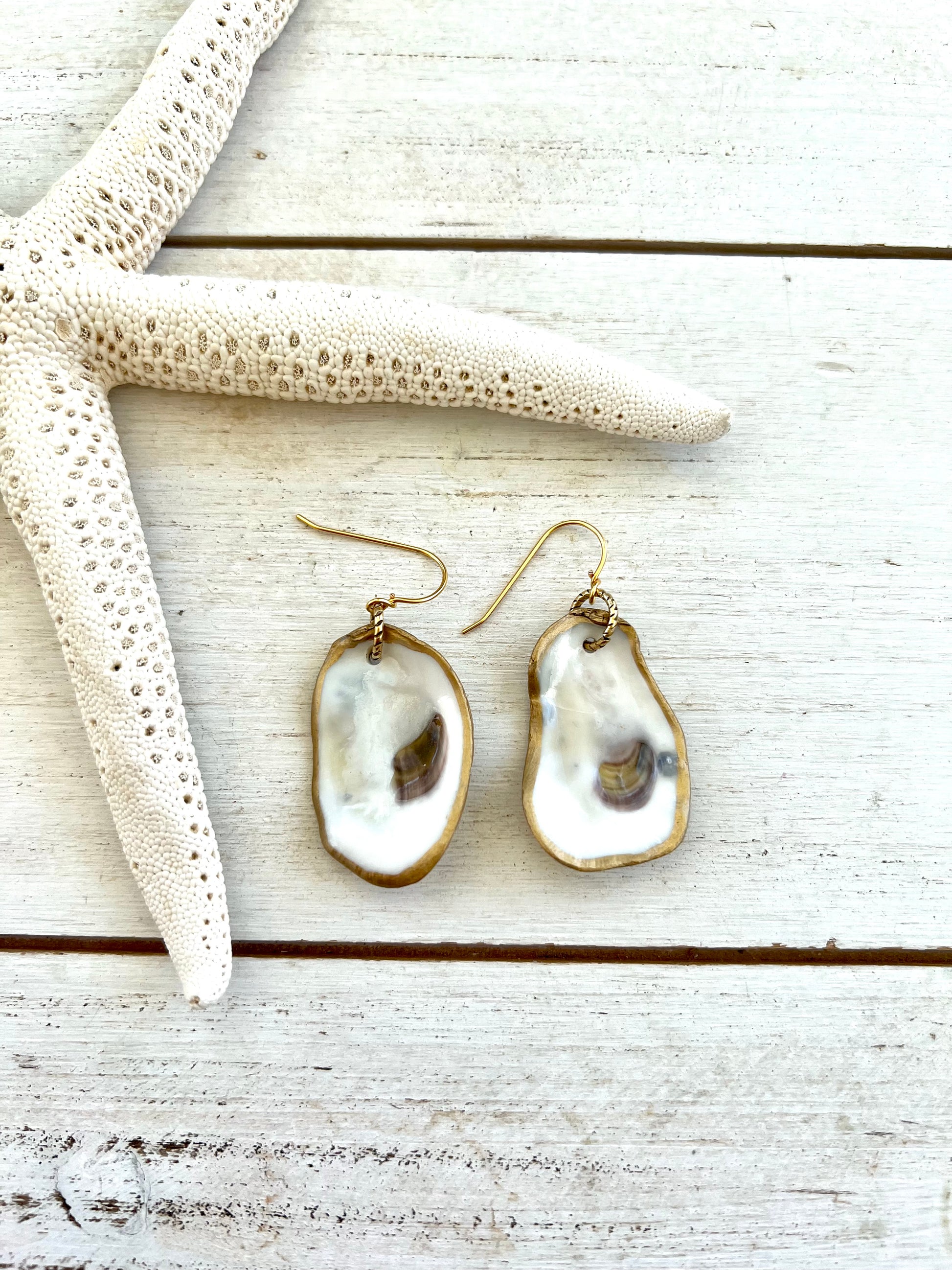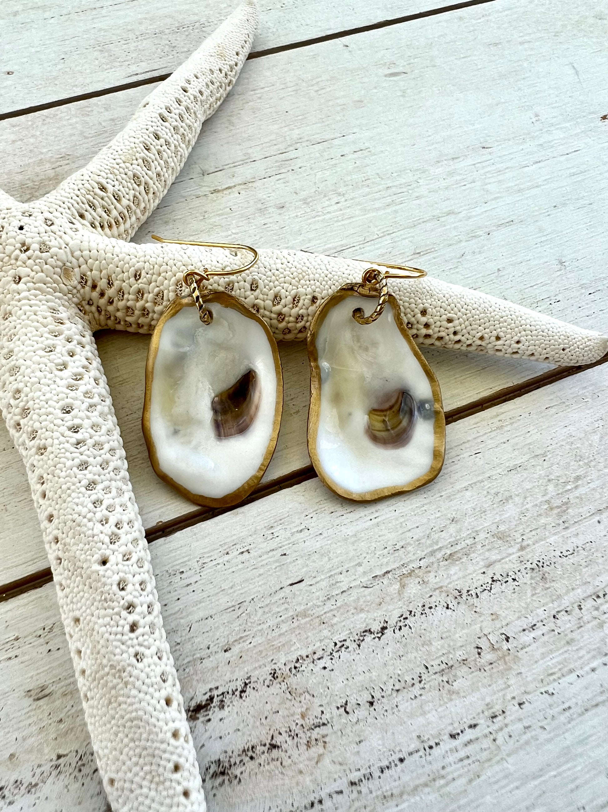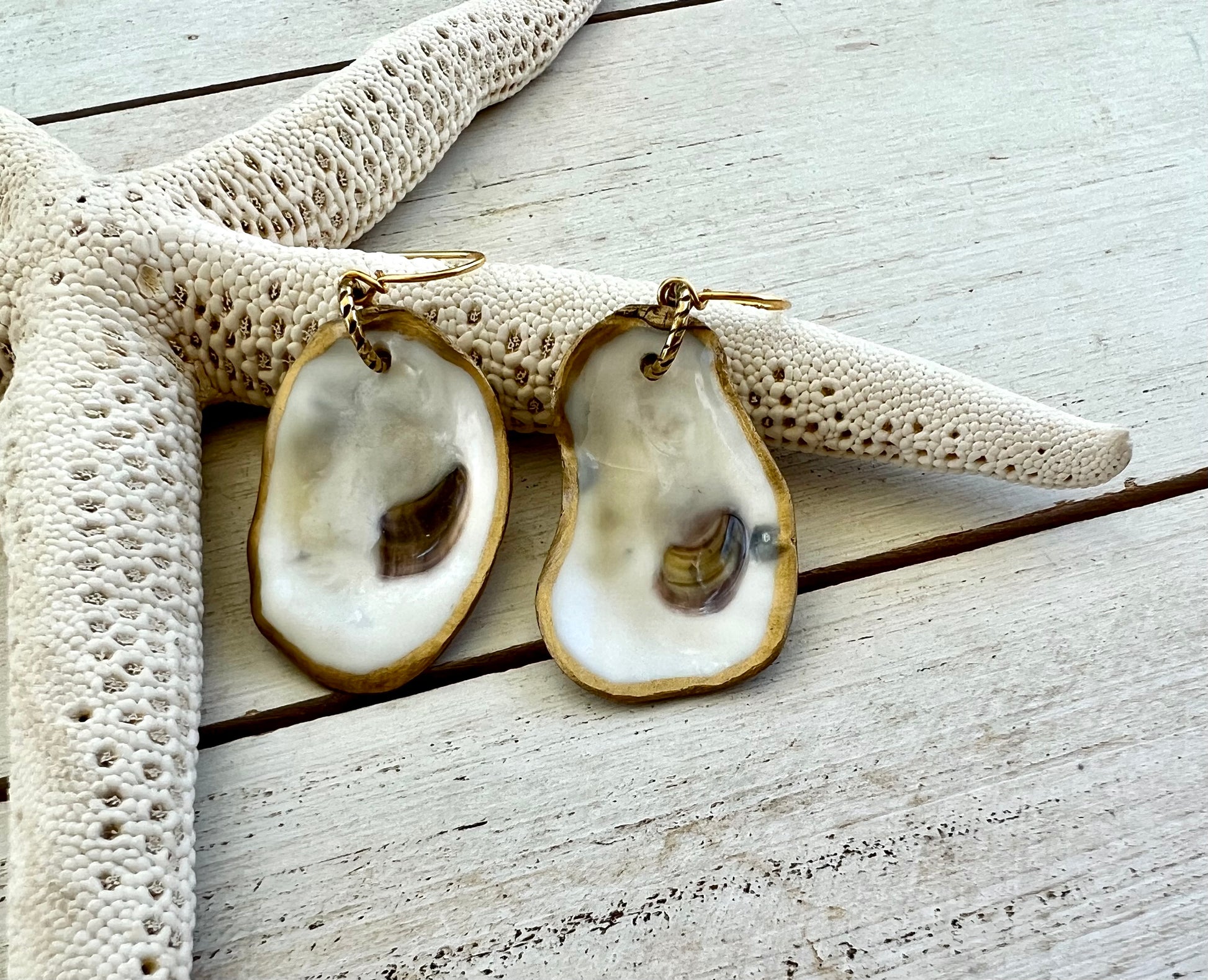 Gold leaf has been carefully applied faming the Hilton Head Oysters. For all my oyster shell jewelry pieces, I carefully sand down the oyster for a smooth finish and hand drill holes to create earrings. Oysters are sealed with an epoxy that gives a slight sheen. Earrings are attached to 24K gold plated ear wires. Oysters vary by size but approximately 1 1/4" to 1 1/2" in length and just shy of 1" in width.