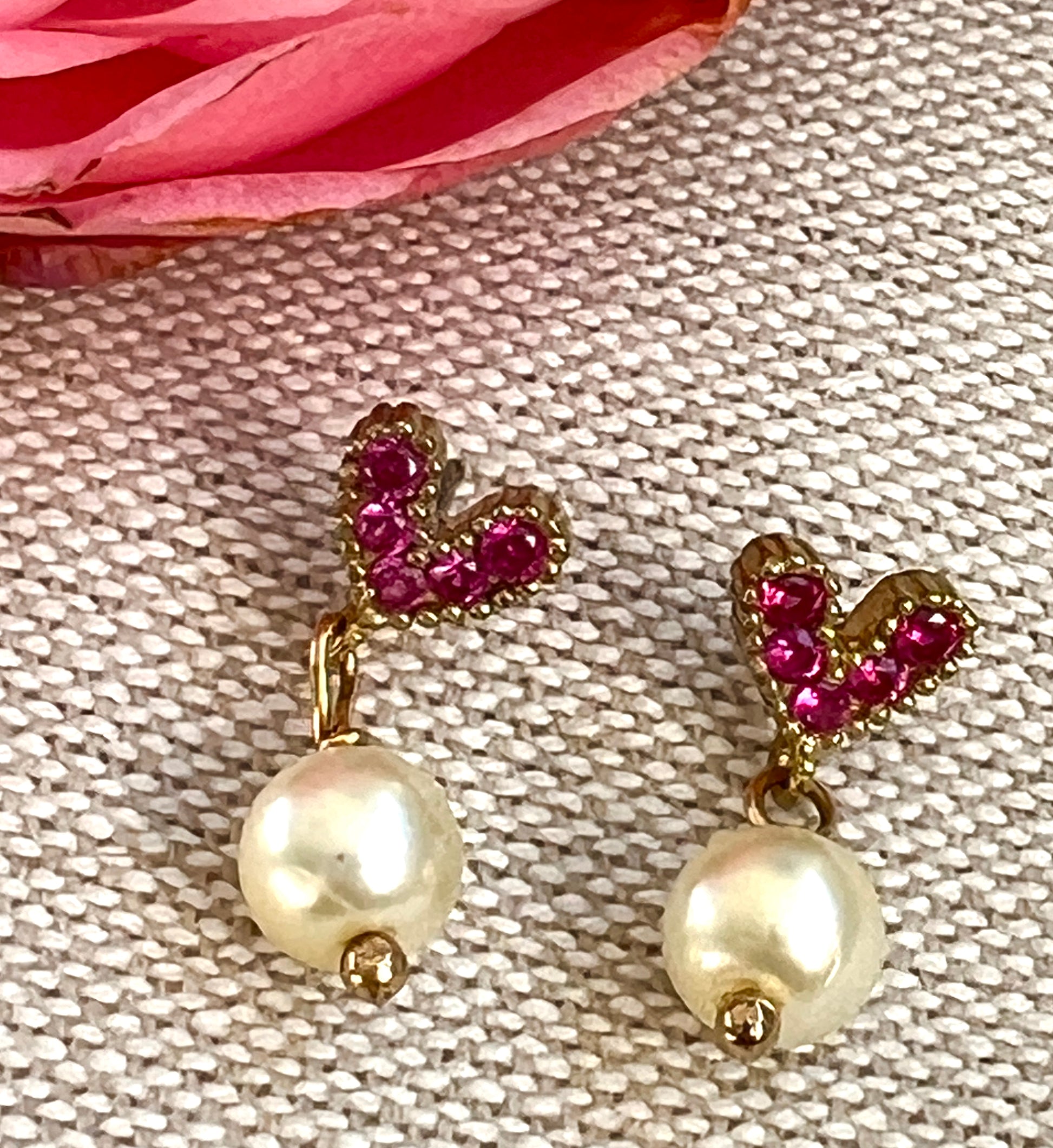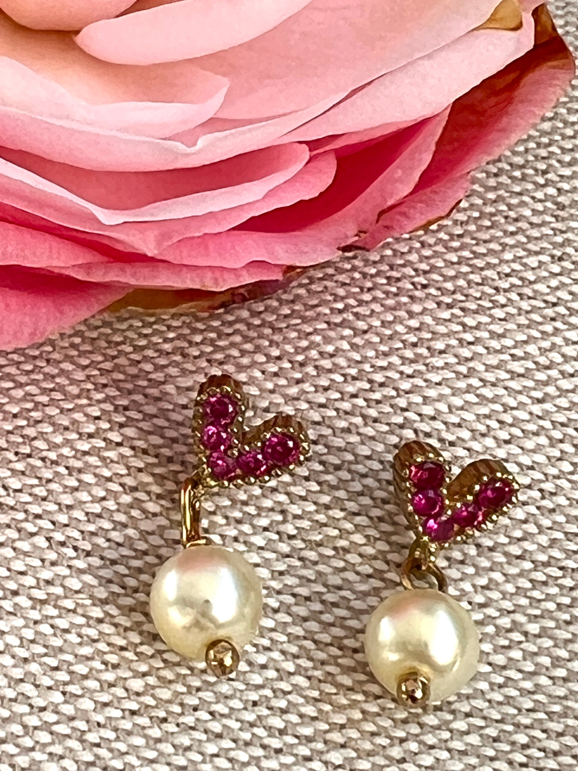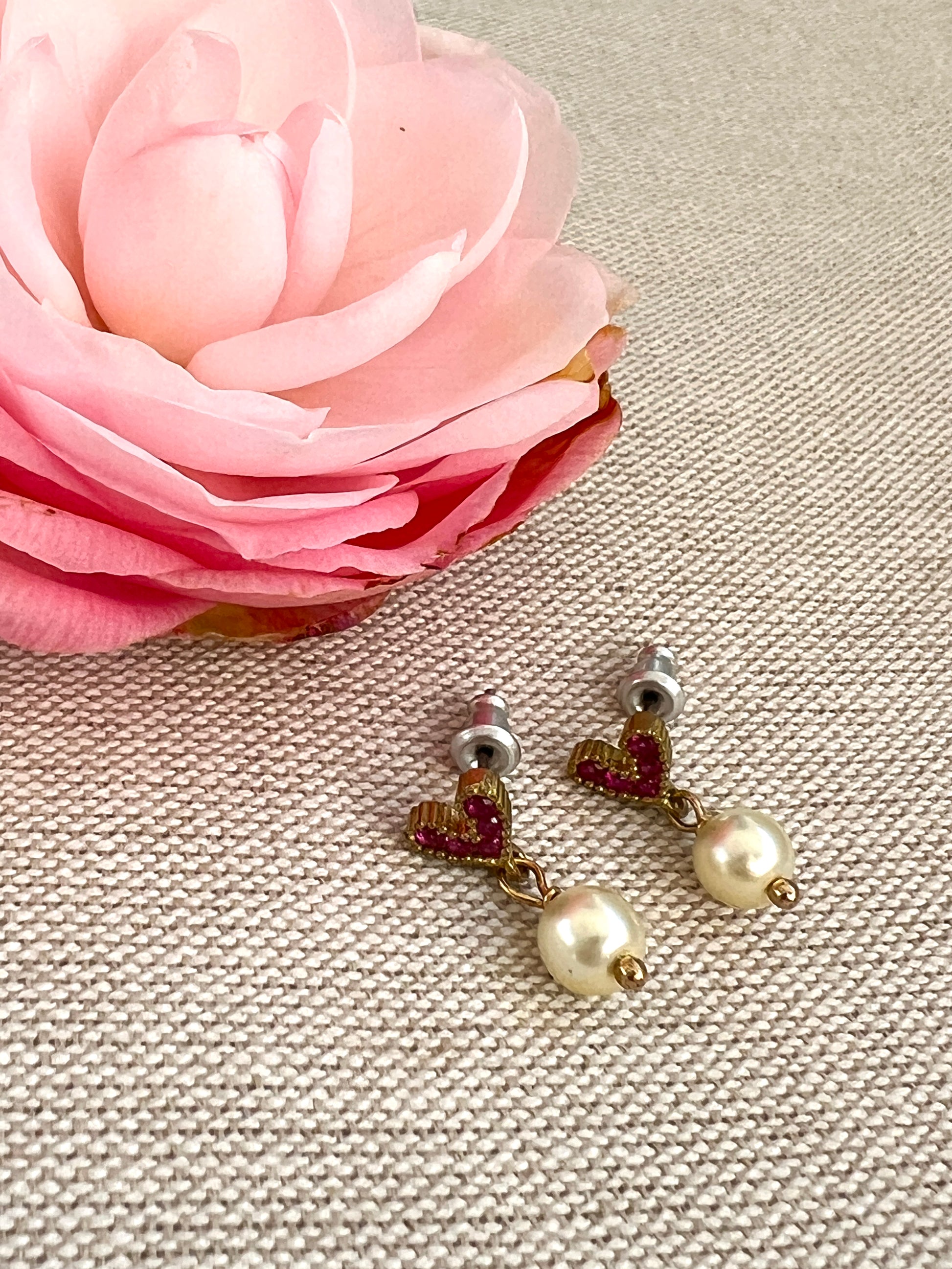 Pink Rhinestone Heart Earrings with Glass Pearls Earrings