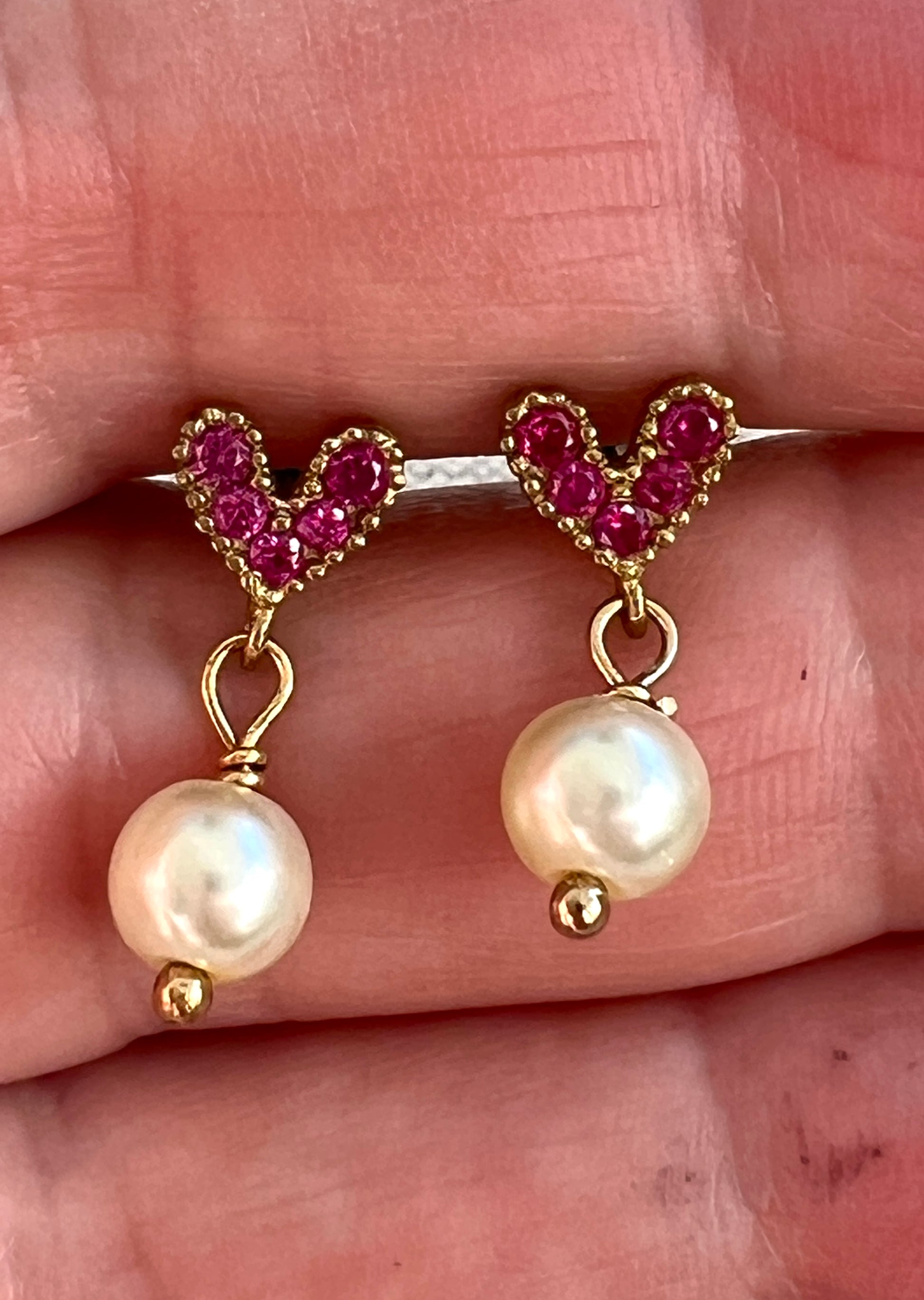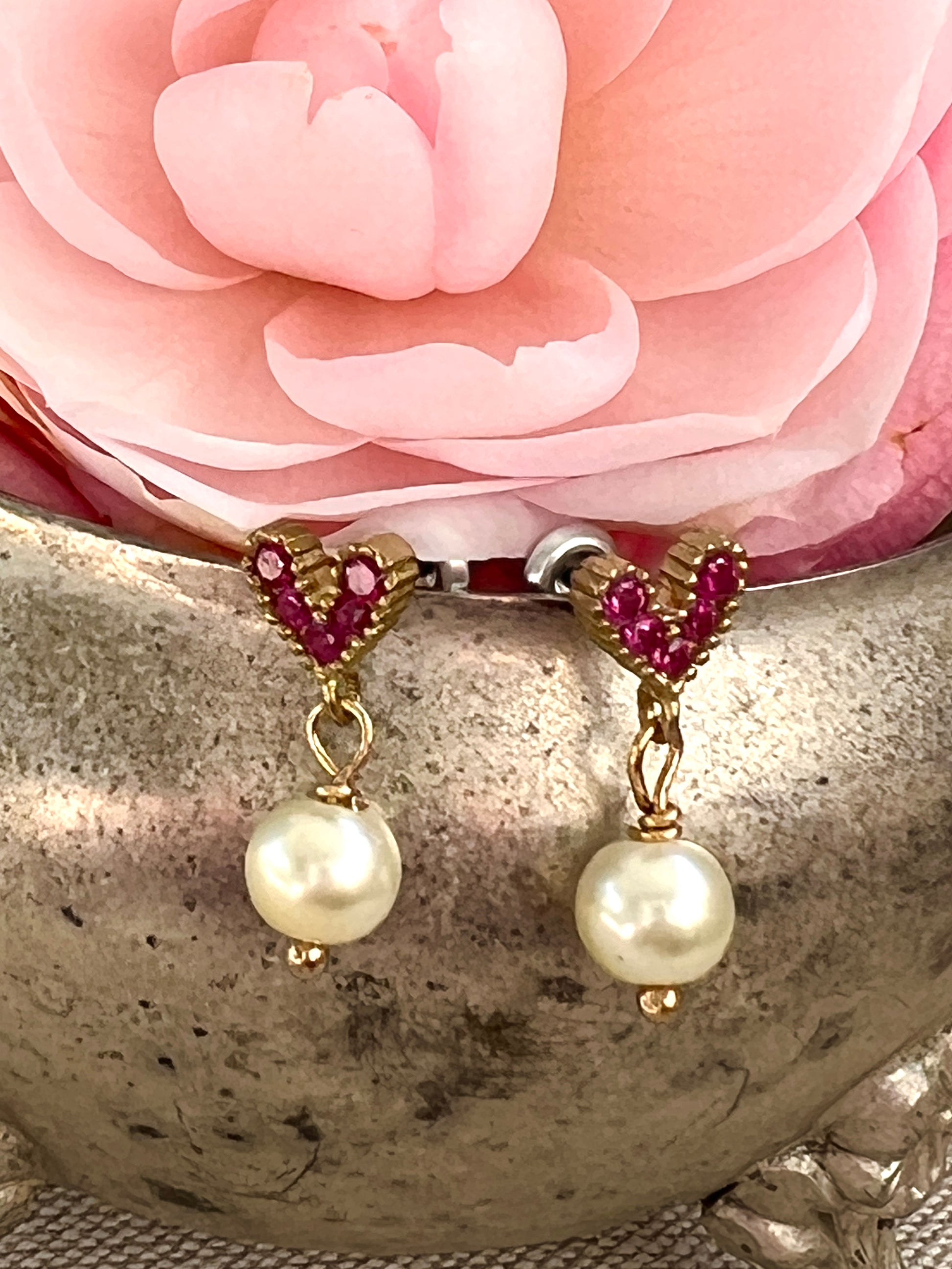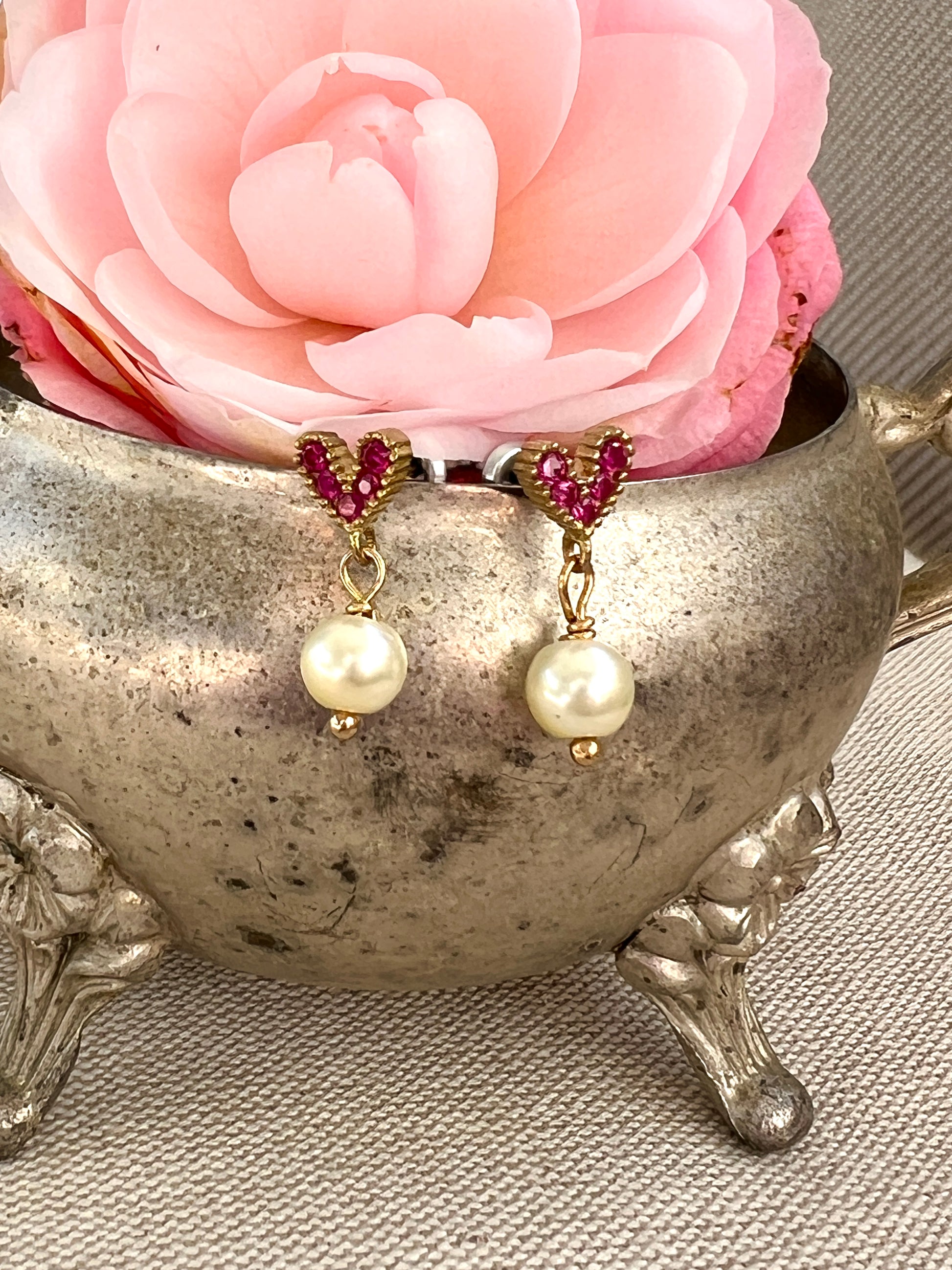 Hot pink rhinestone heart earrings, dangle Swarovski glass pearls. Earrings dangle 3/4" from ear hole to bottom of earring, and are 1/4" at the widest point. All earring components are nickel and lead free.