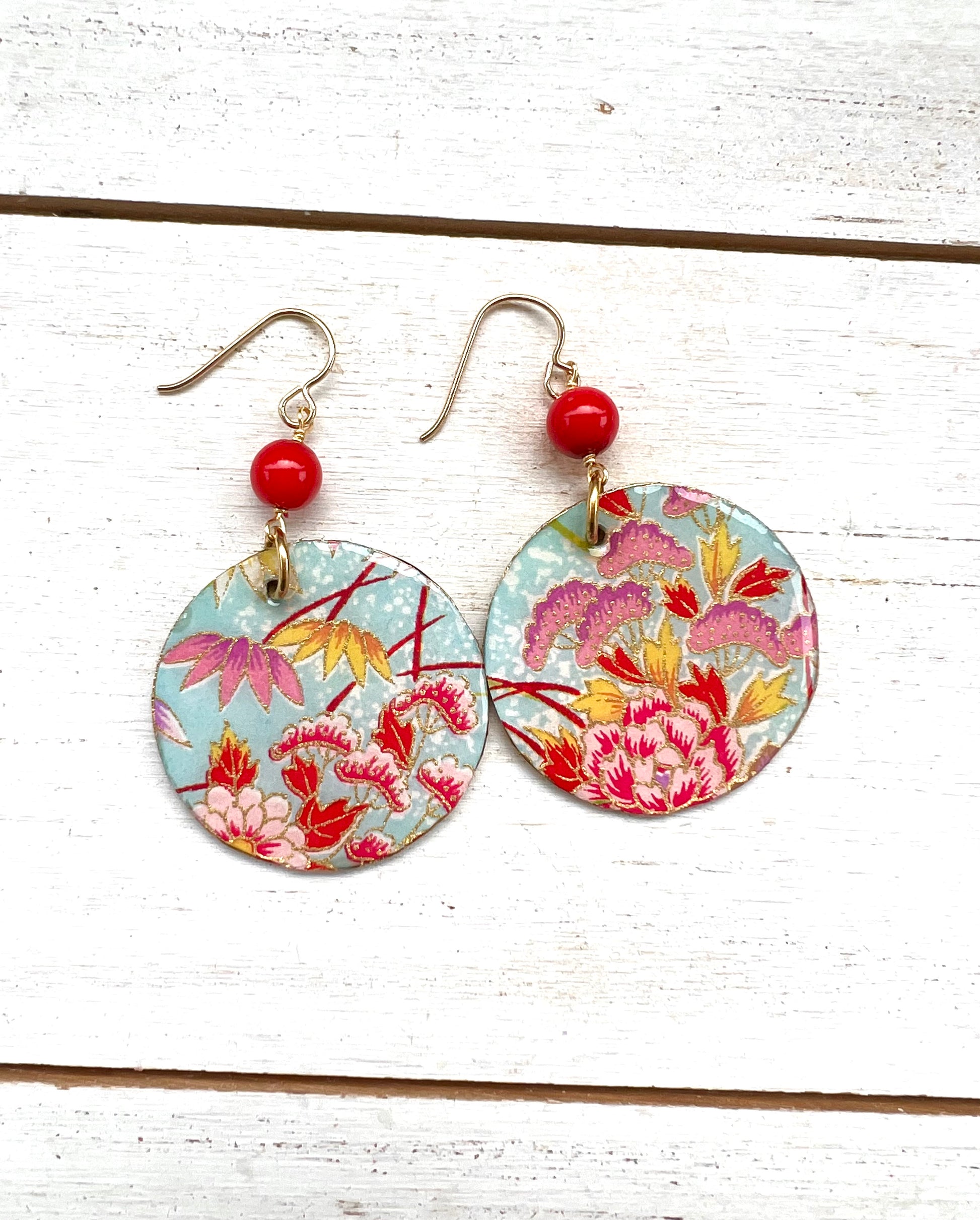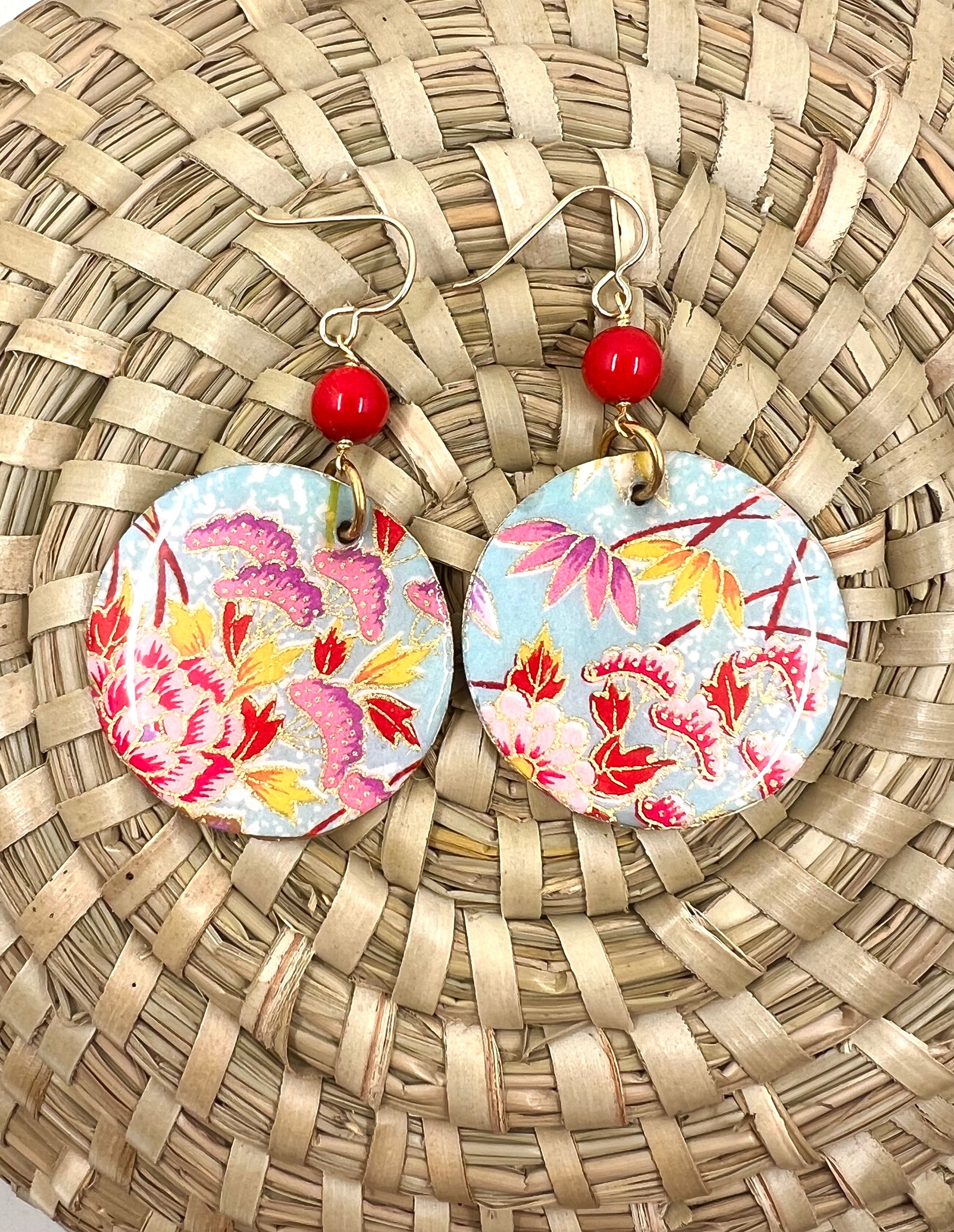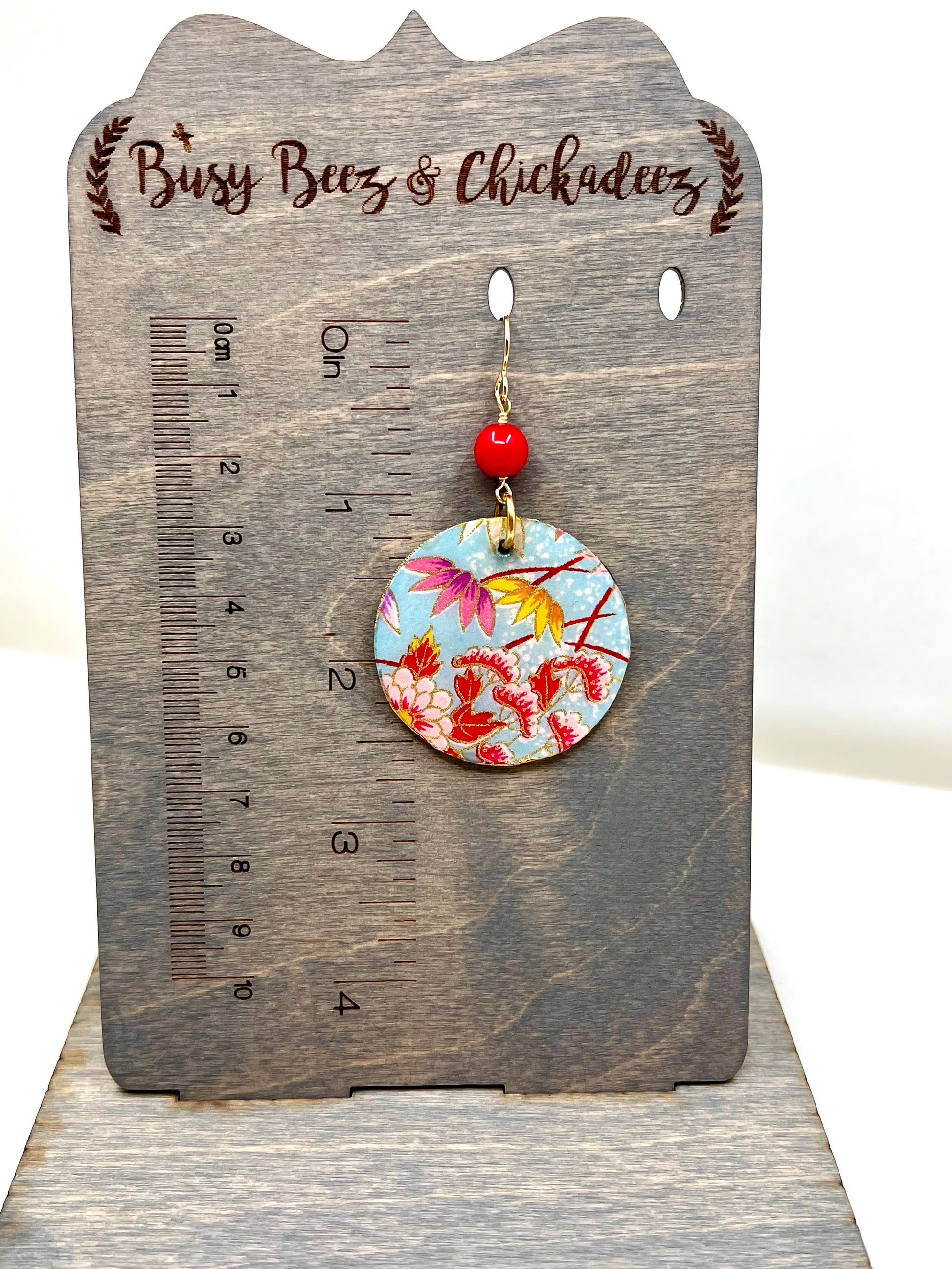Wooden earrings have been embellished with chiyogami paper - paper that has been individually silk screened by artists in Japan. The paper is then sealed in resin. Earrings dangle from red beads that are attached to gold filled earring wires. The back of the wood earrings have been stained. Earrings drop 2 3/4" in length from ear hole and are 1 1/2" at the widest point. French wire hooks are 14k gold filled.