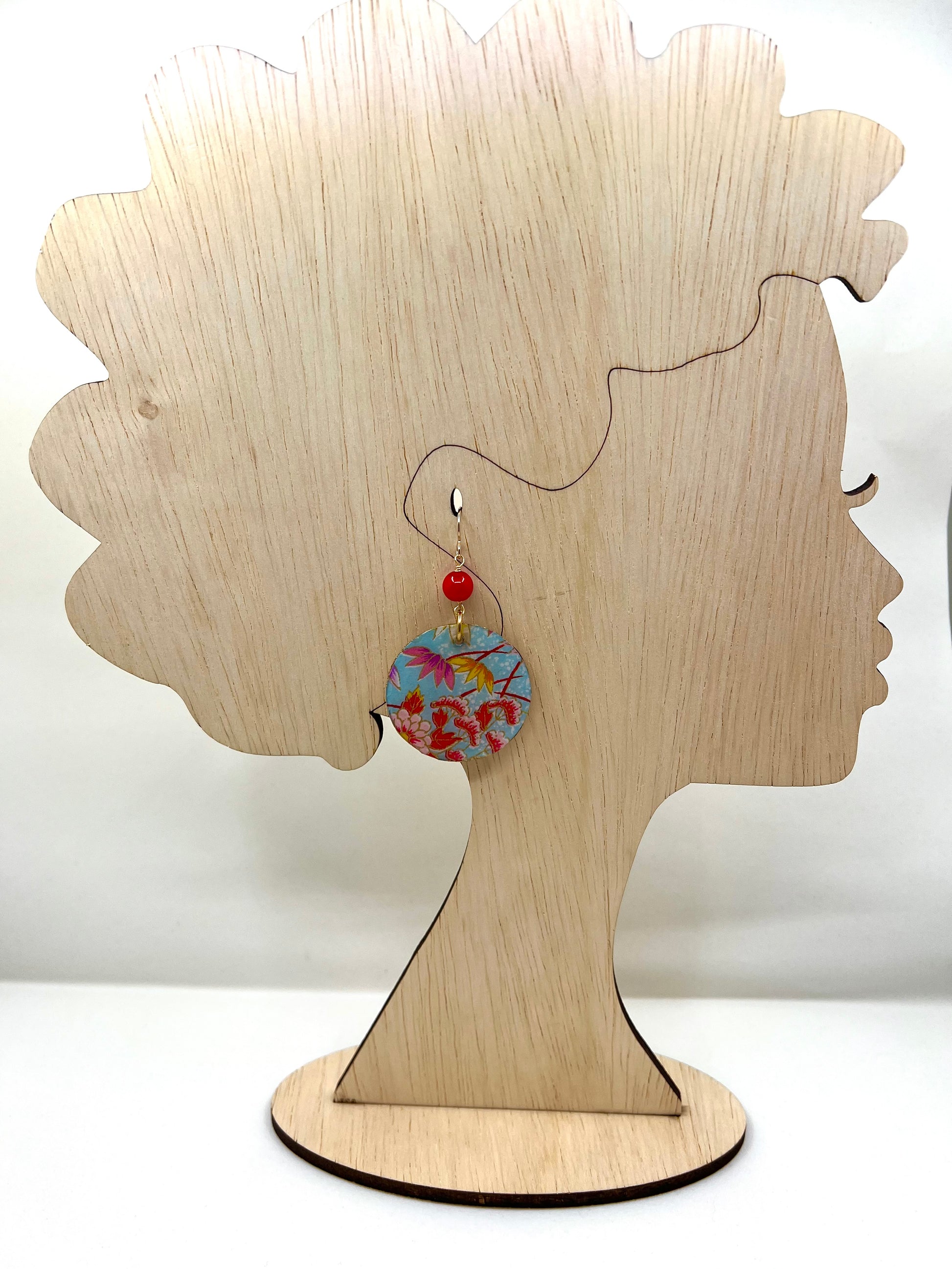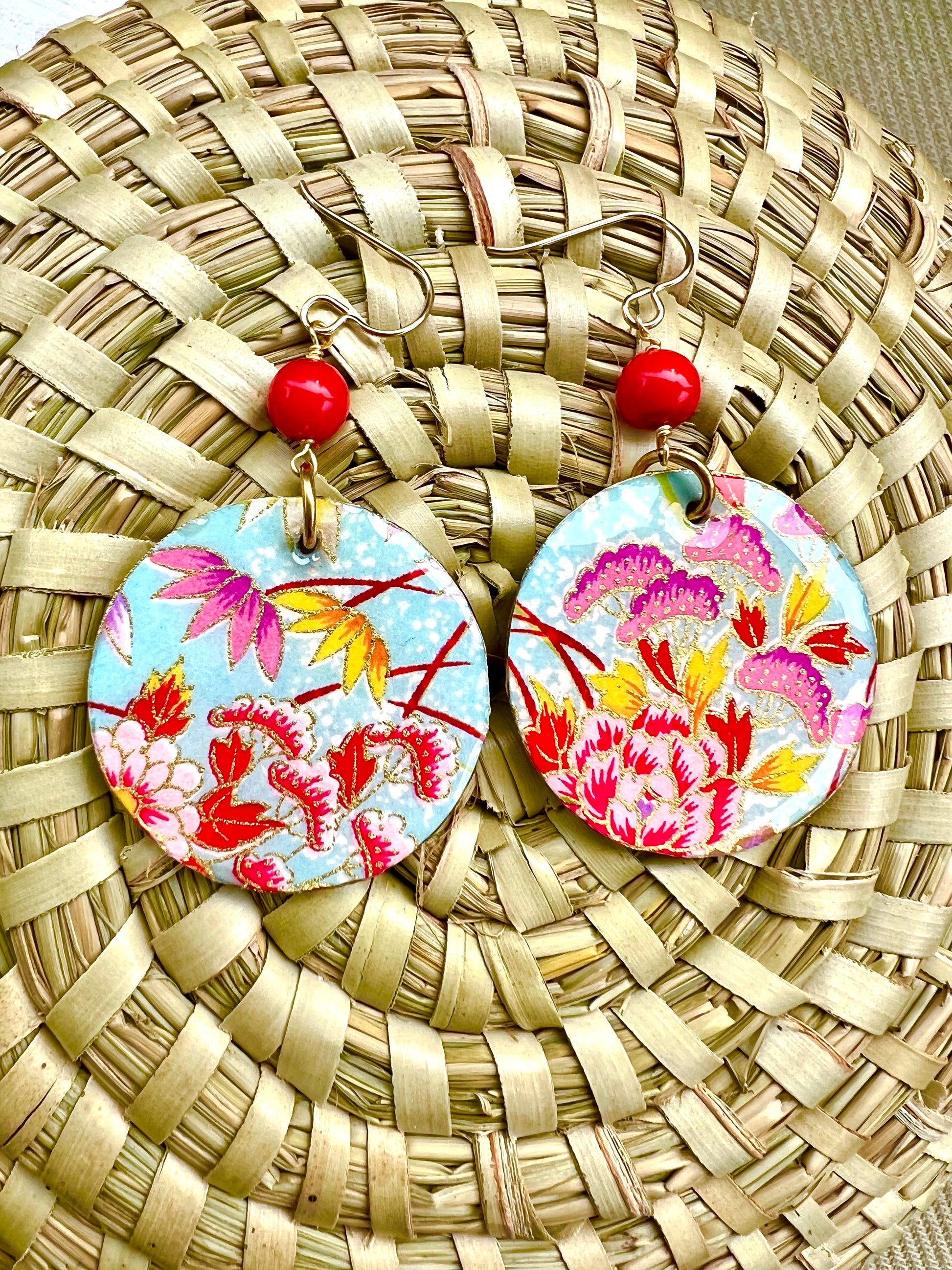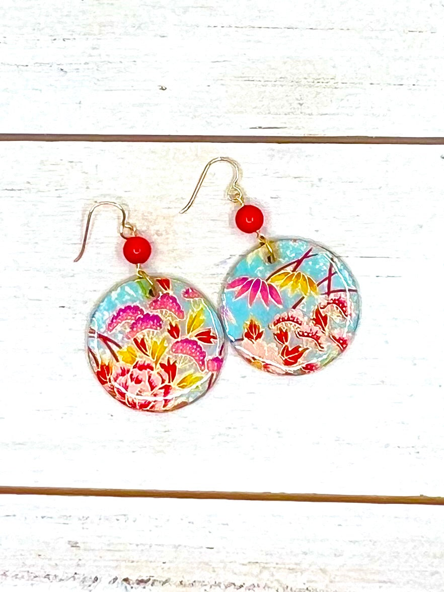 Wooden earrings have been embellished with chiyogami paper - paper that has been individually silk screened by artists in Japan. The paper is then sealed in resin. Earrings dangle from red beads that are attached to gold filled earring wires. The back of the wood earrings have been stained. Earrings drop 2 3/4" in length from ear hole and are 1 1/2" at the widest point. French wire hooks are 14k gold filled.
