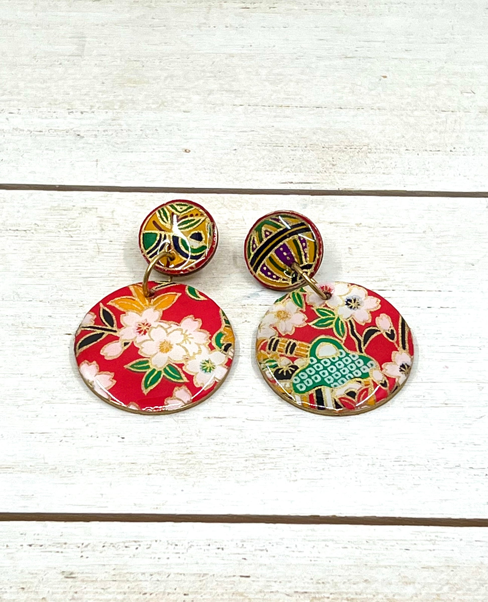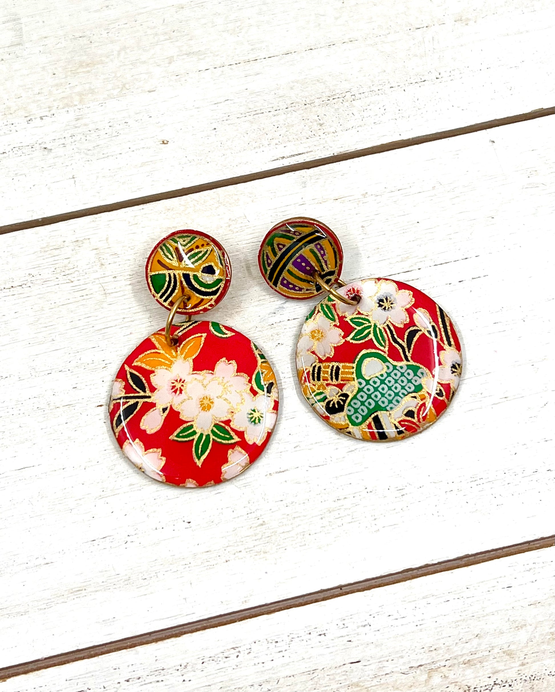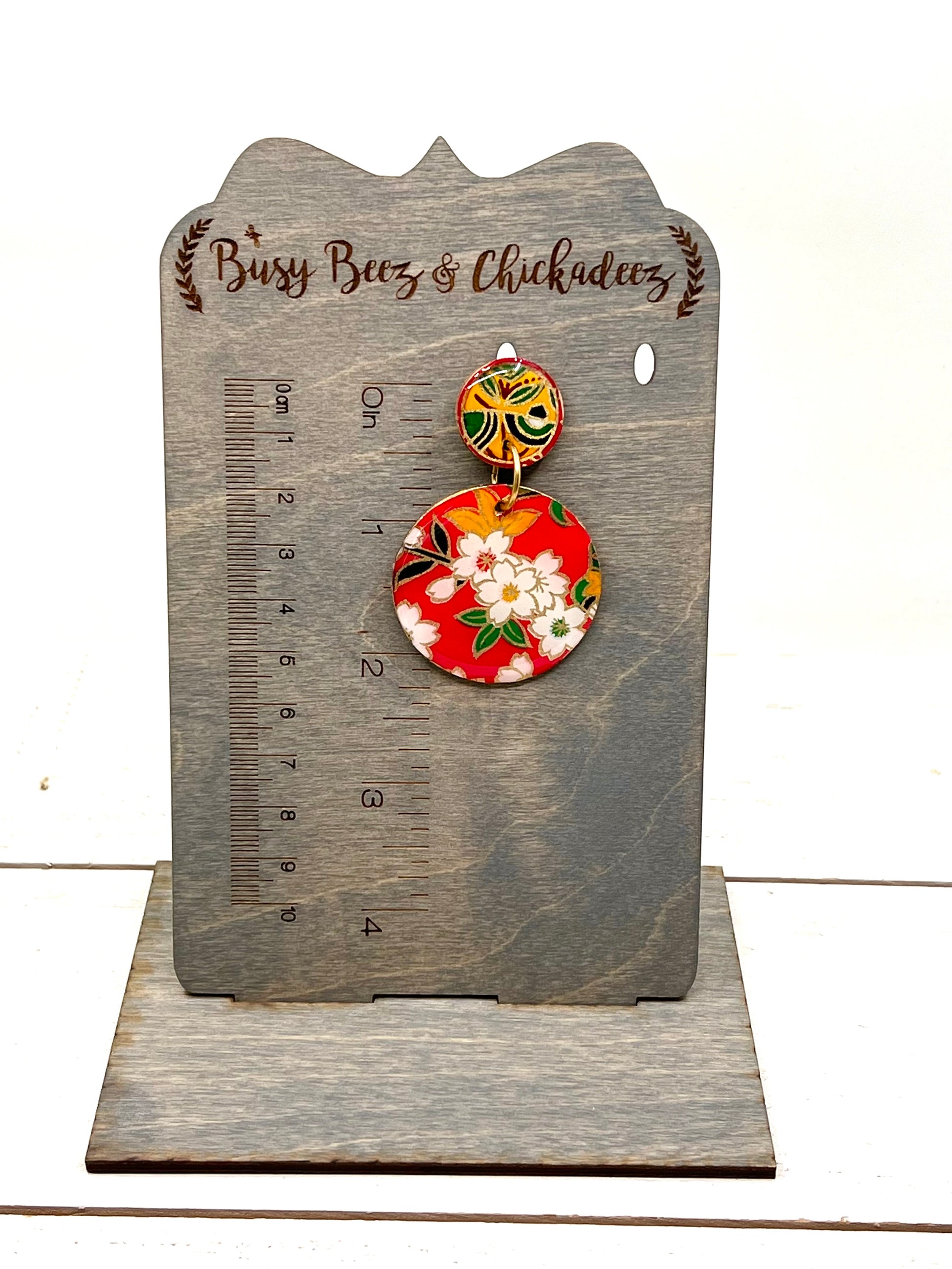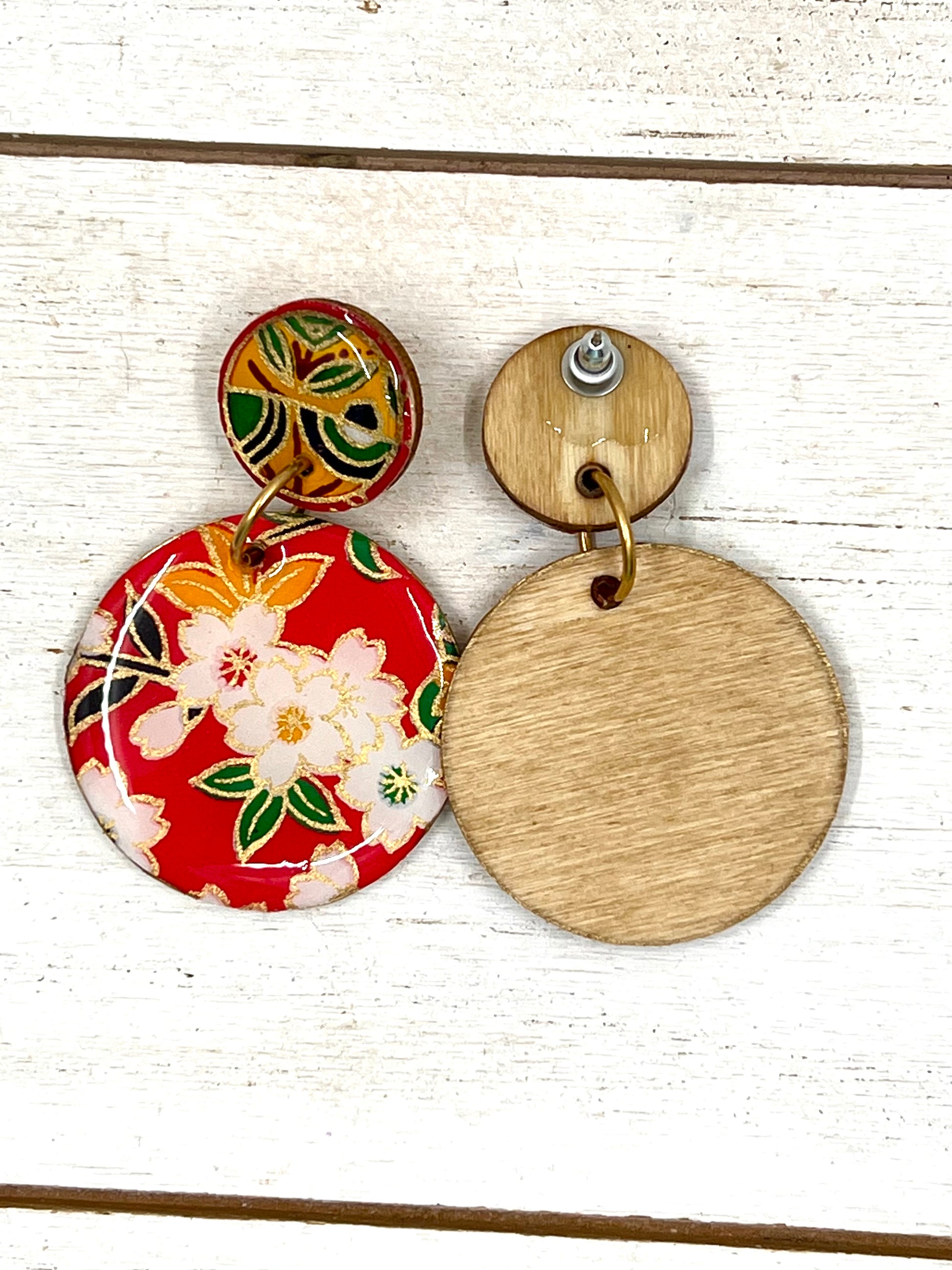 Wooden earrings have been embellished with chiyogami paper - paper that has been individually silk screened by artists in Japan. The paper is then sealed in resin. The back of the wood earrings have been stained and an earring post added by a resin method to ensure longevity of the piece. Earrings drop 2 1/4" in length from ear hole and are 1 1/2" at the widest point.