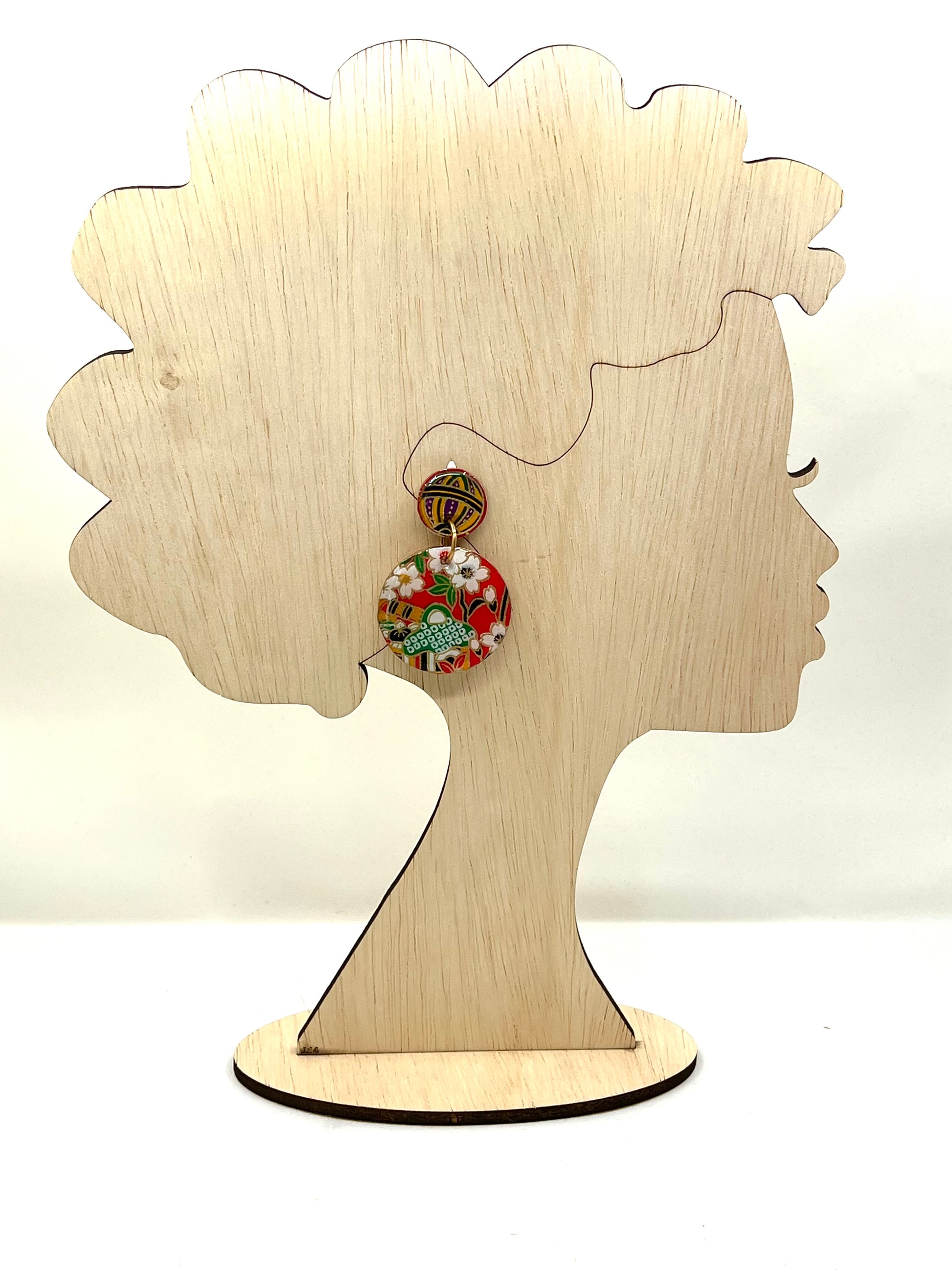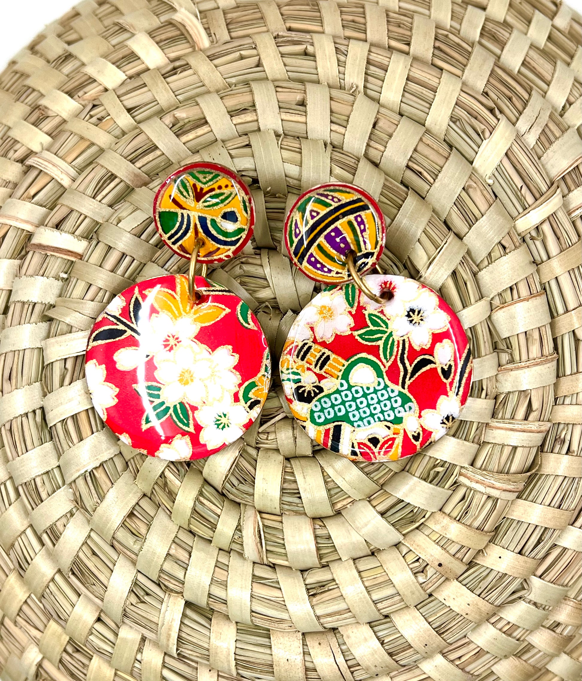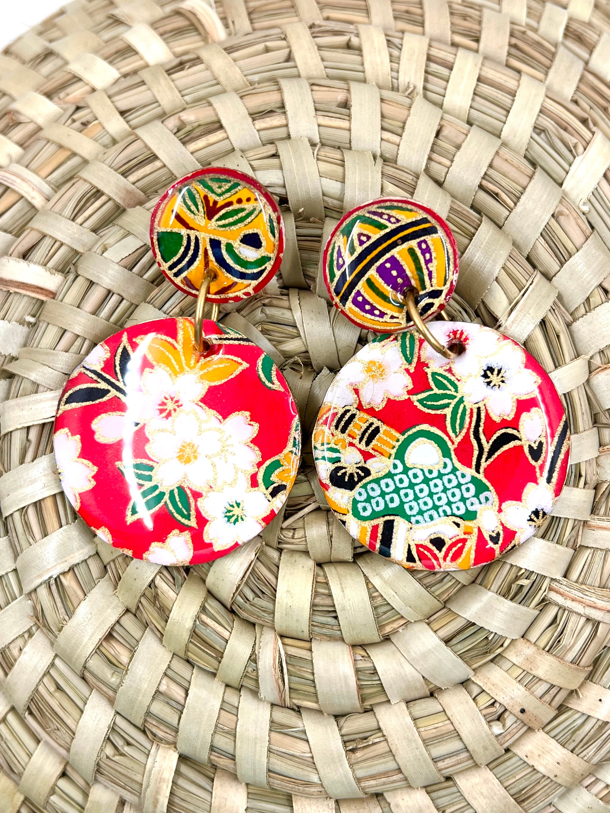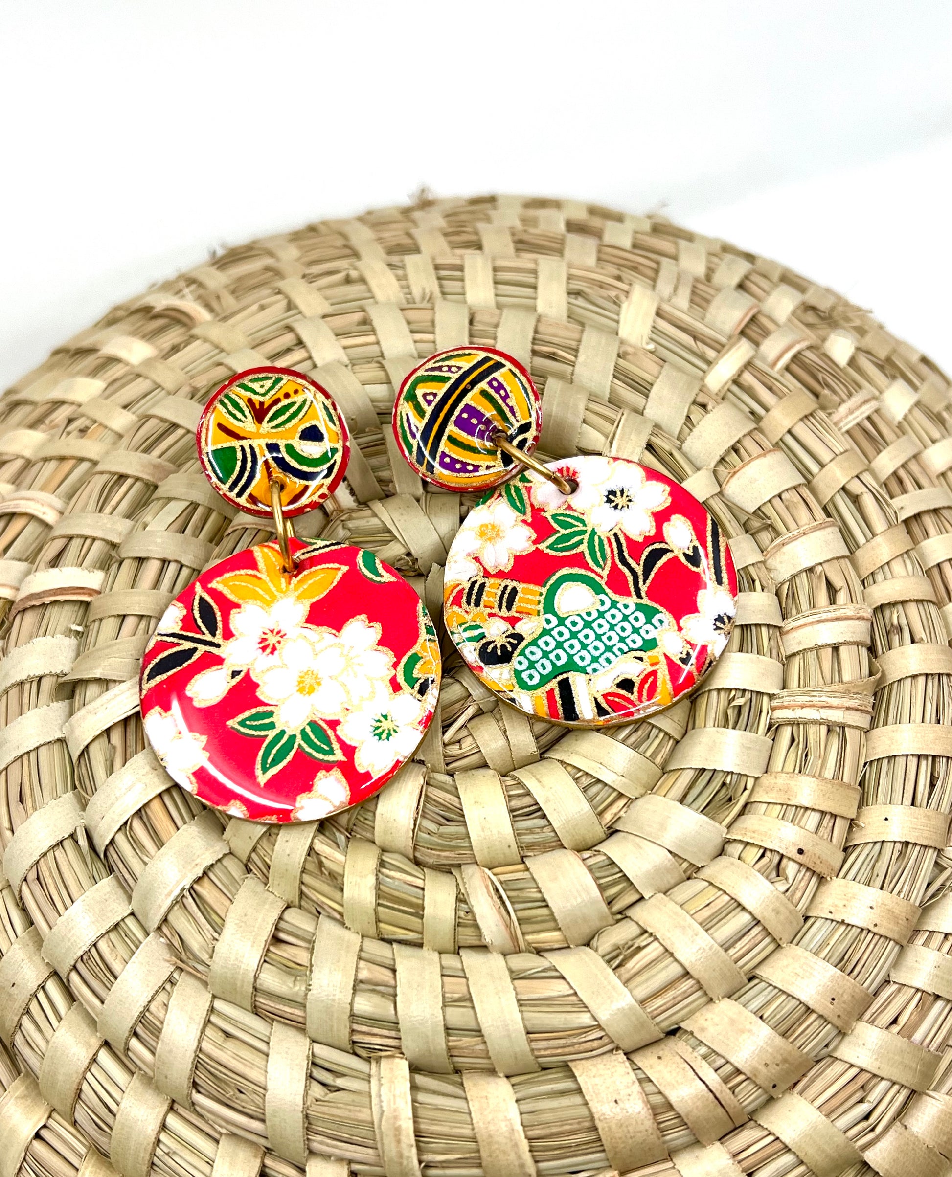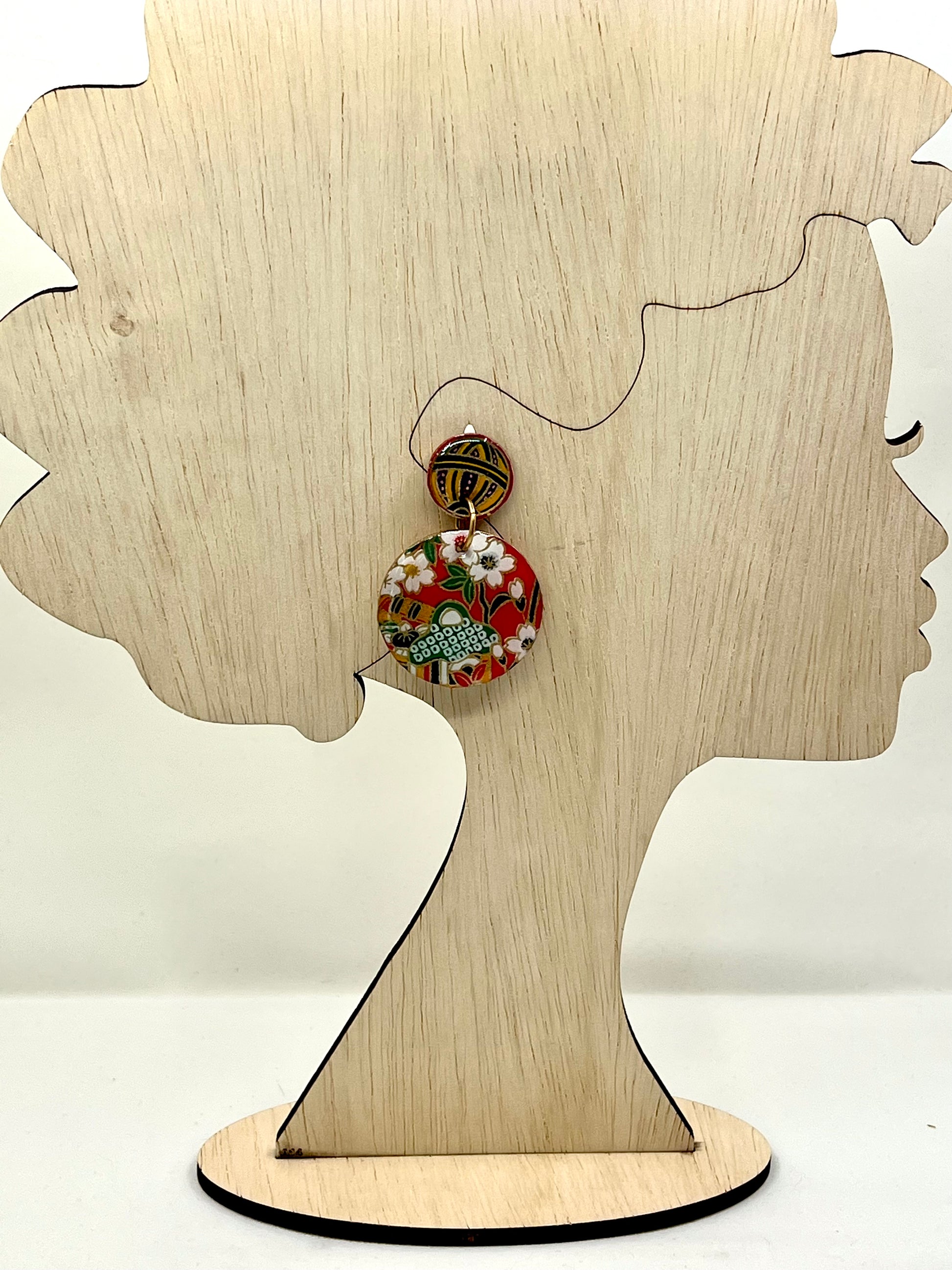 Wooden earrings have been embellished with chiyogami paper - paper that has been individually silk screened by artists in Japan. The paper is then sealed in resin. The back of the wood earrings have been stained and an earring post added by a resin method to ensure longevity of the piece. Earrings drop 2 1/4" in length from ear hole and are 1 1/2" at the widest point.
