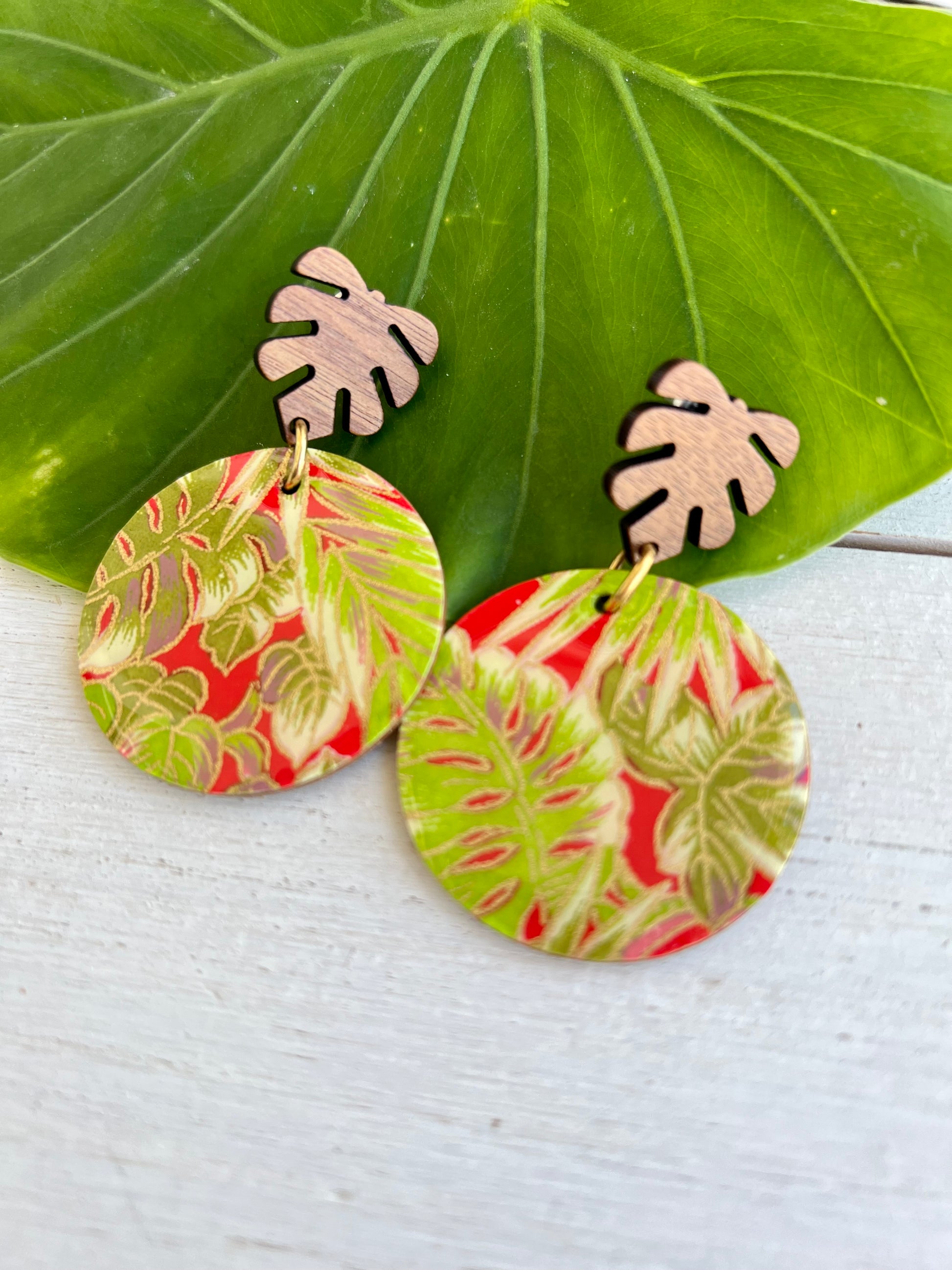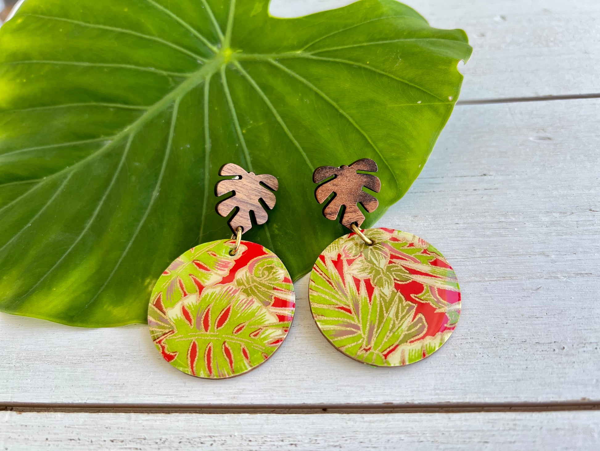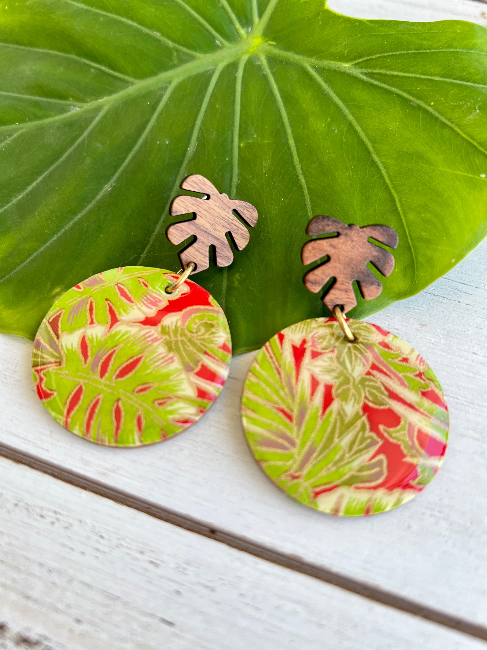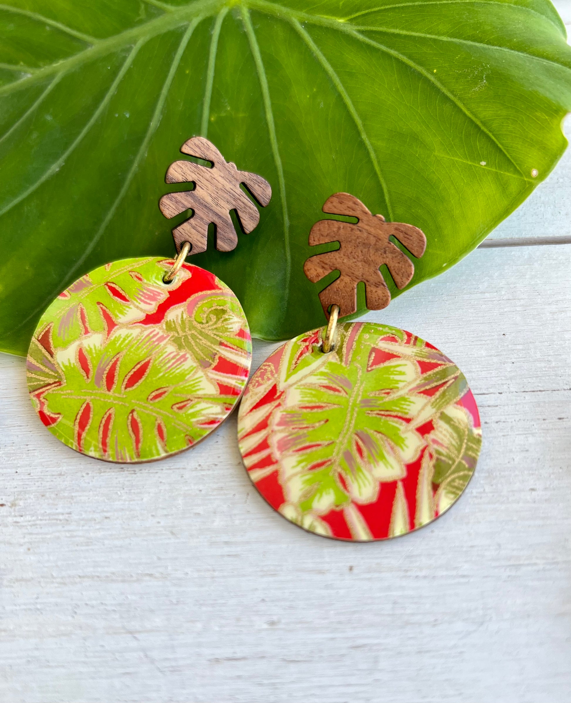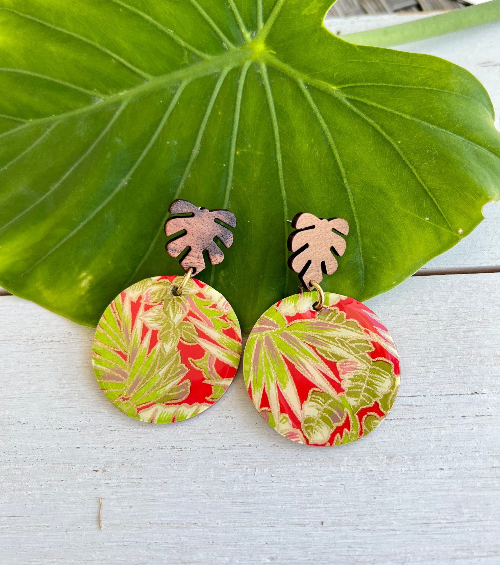 Wooden earrings have been embellished with chiyogami paper - paper that has been individually silk screened by artists in Japan. The paper is then sealed in resin. The earrings are attached to stained palm leaf posts. The back of the wood earrings have been stained. Earrings drop 2 1/8" in length from ear hole and are 1 9/16" at the widest point.