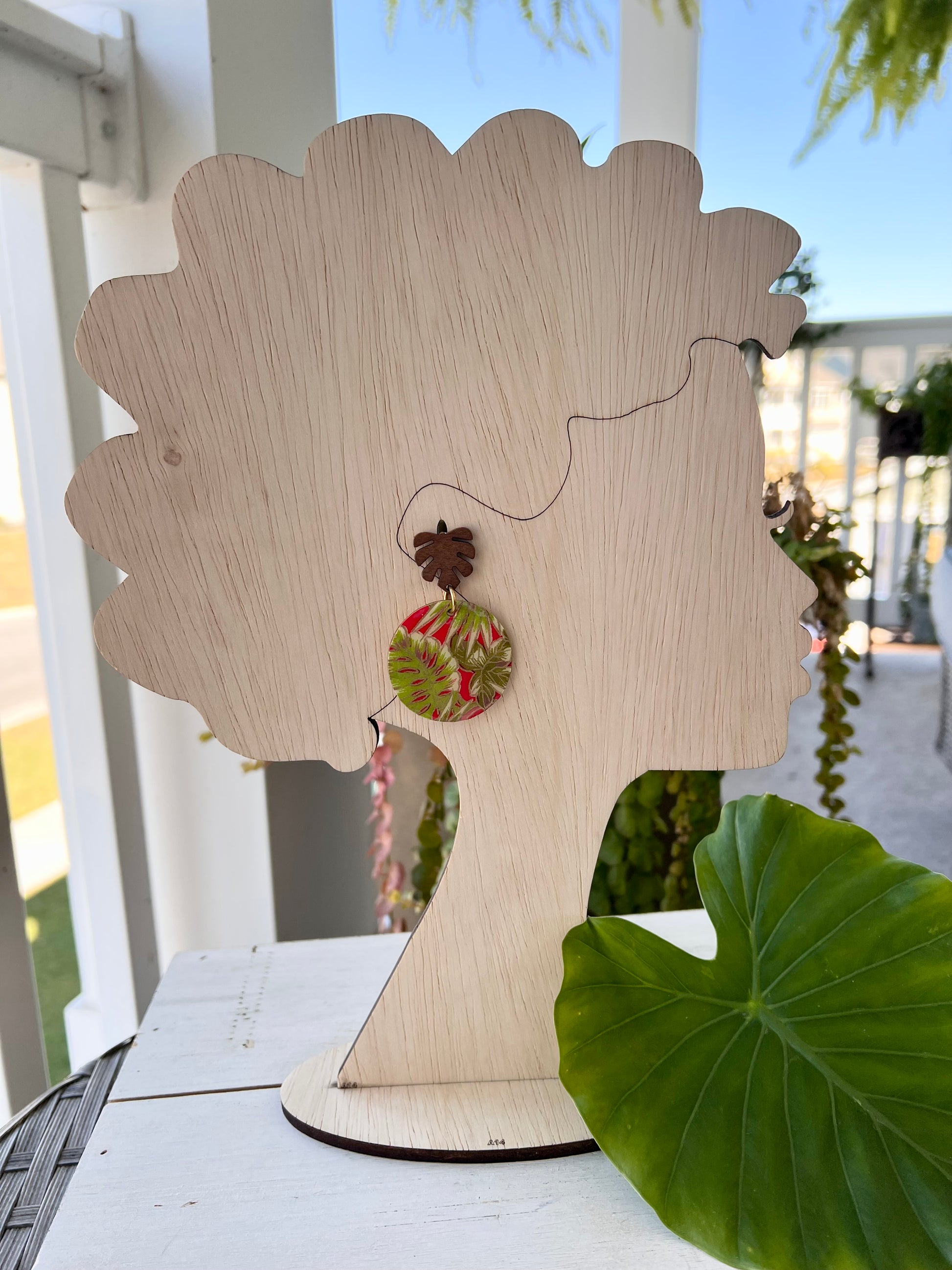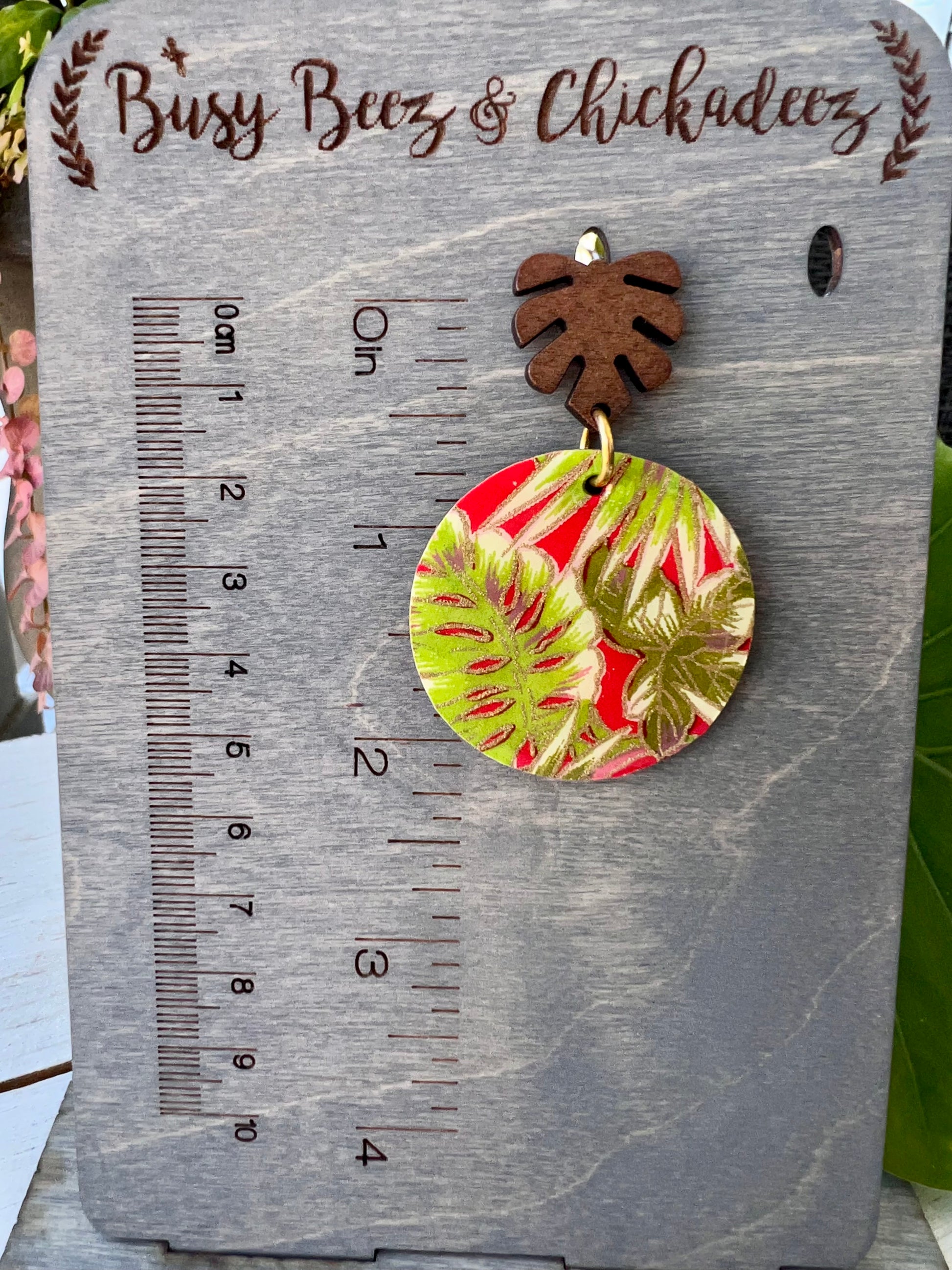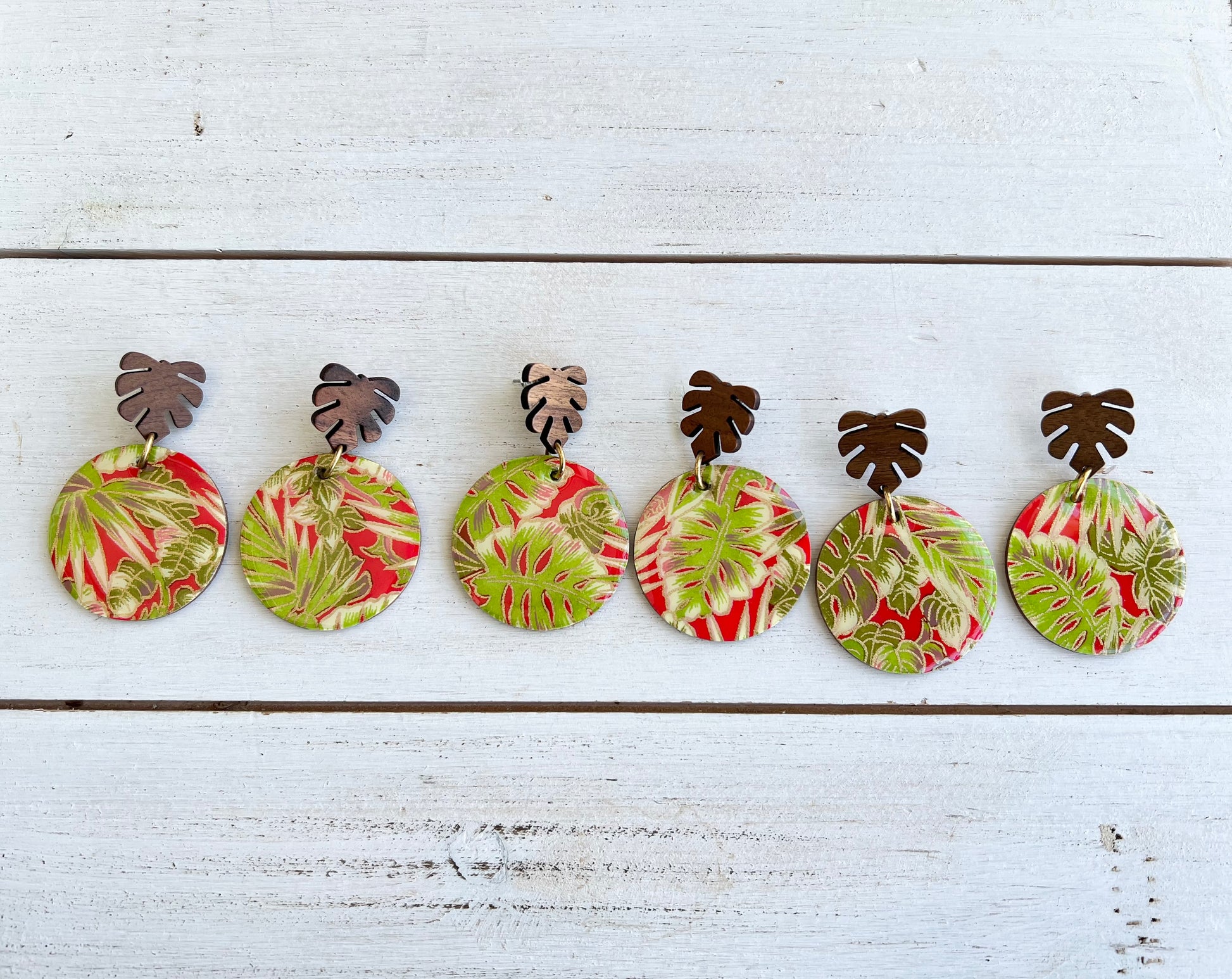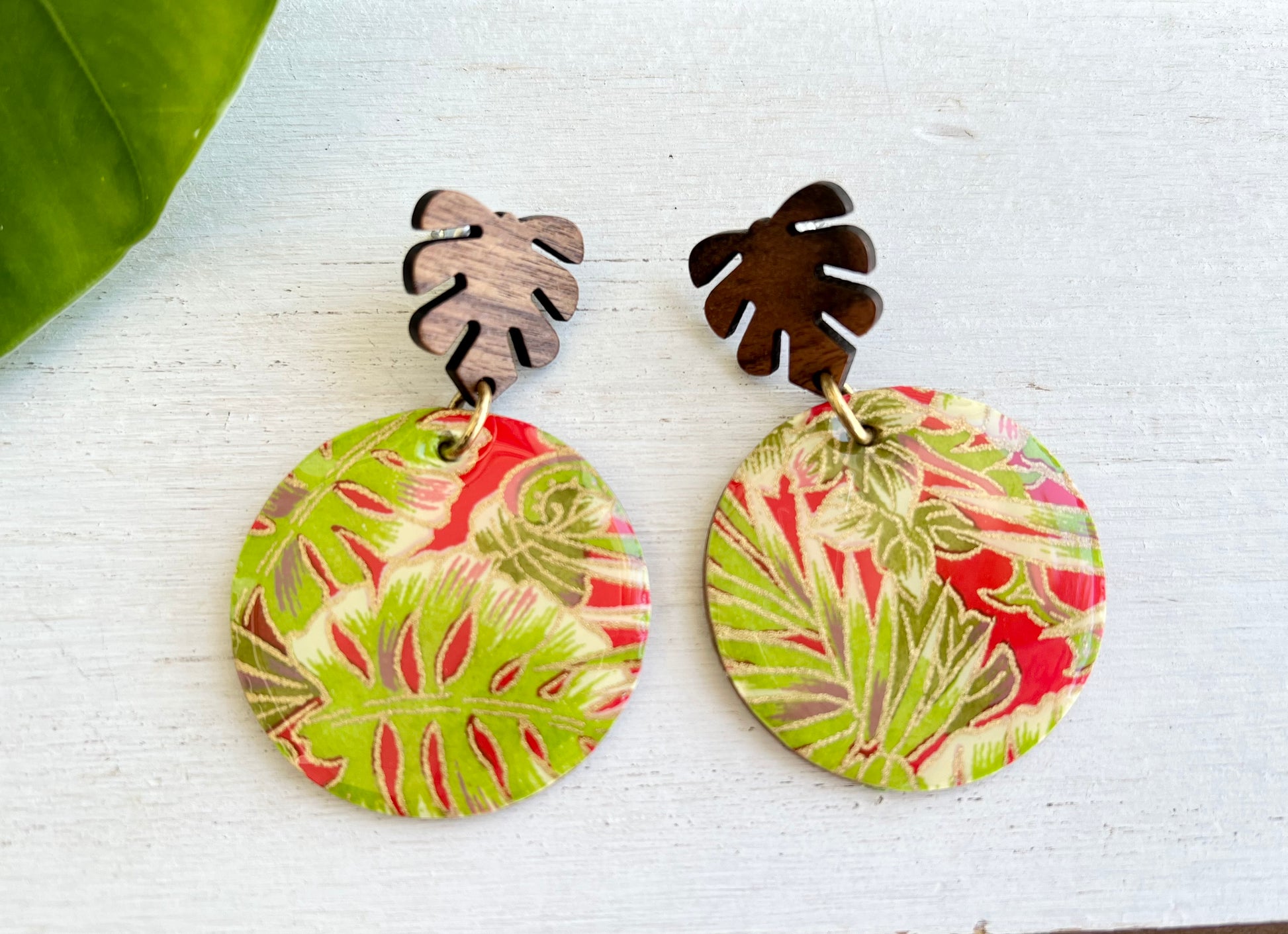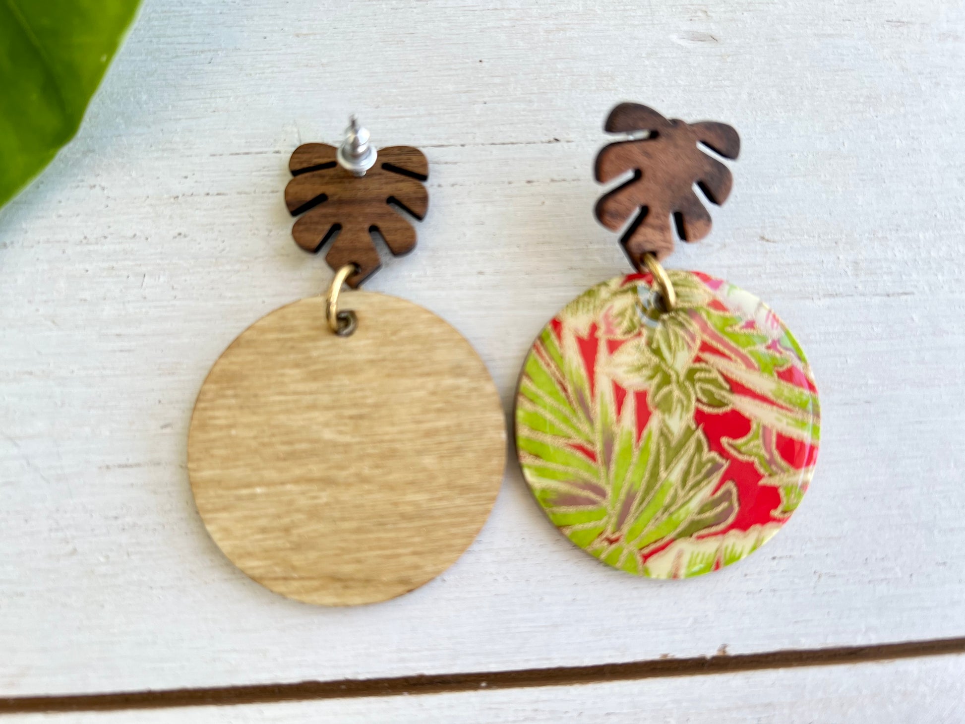 Wooden earrings have been embellished with chiyogami paper - paper that has been individually silk screened by artists in Japan. The paper is then sealed in resin. The earrings are attached to stained palm leaf posts. The back of the wood earrings have been stained. Earrings drop 2 1/8" in length from ear hole and are 1 9/16" at the widest point.