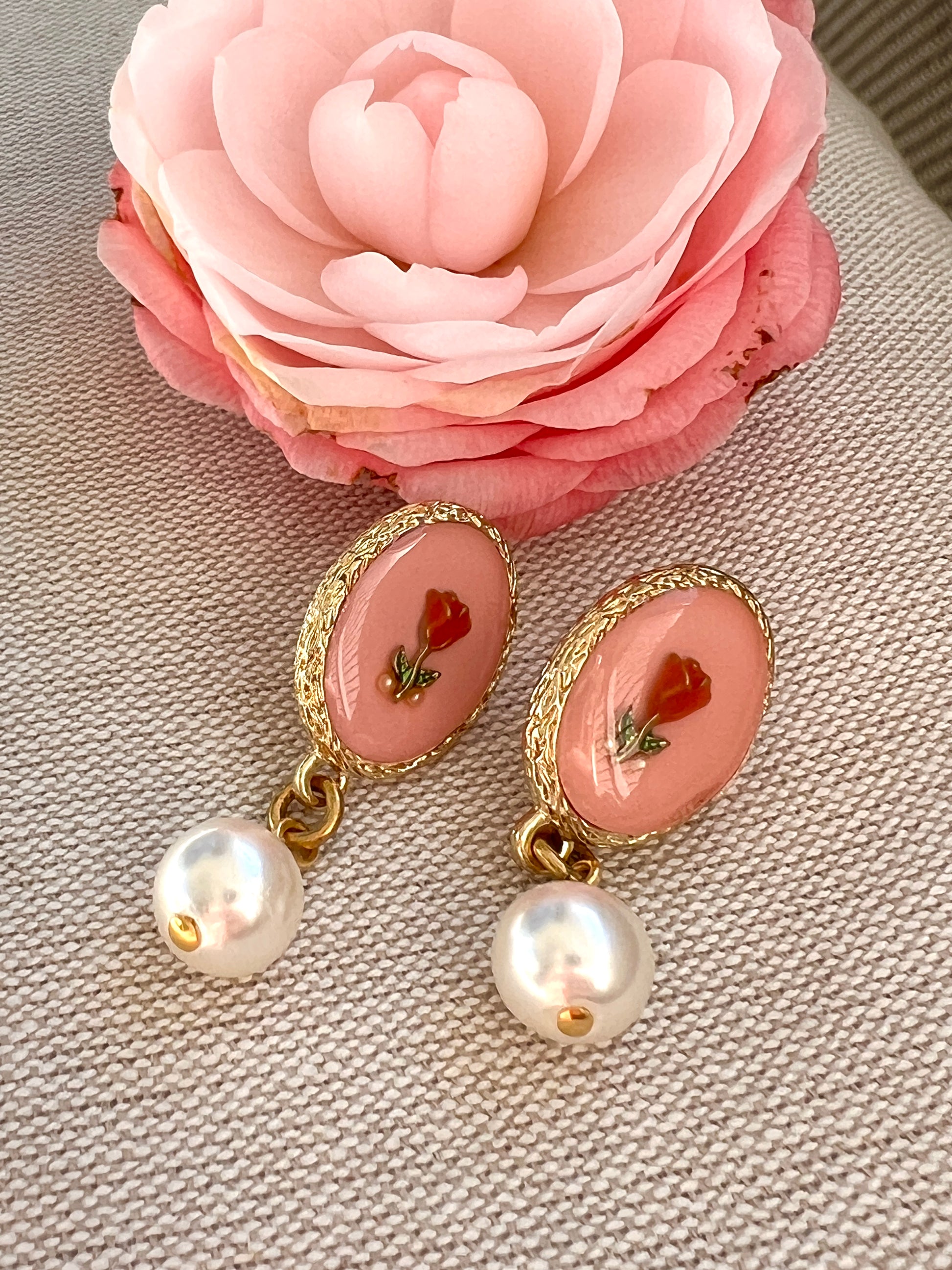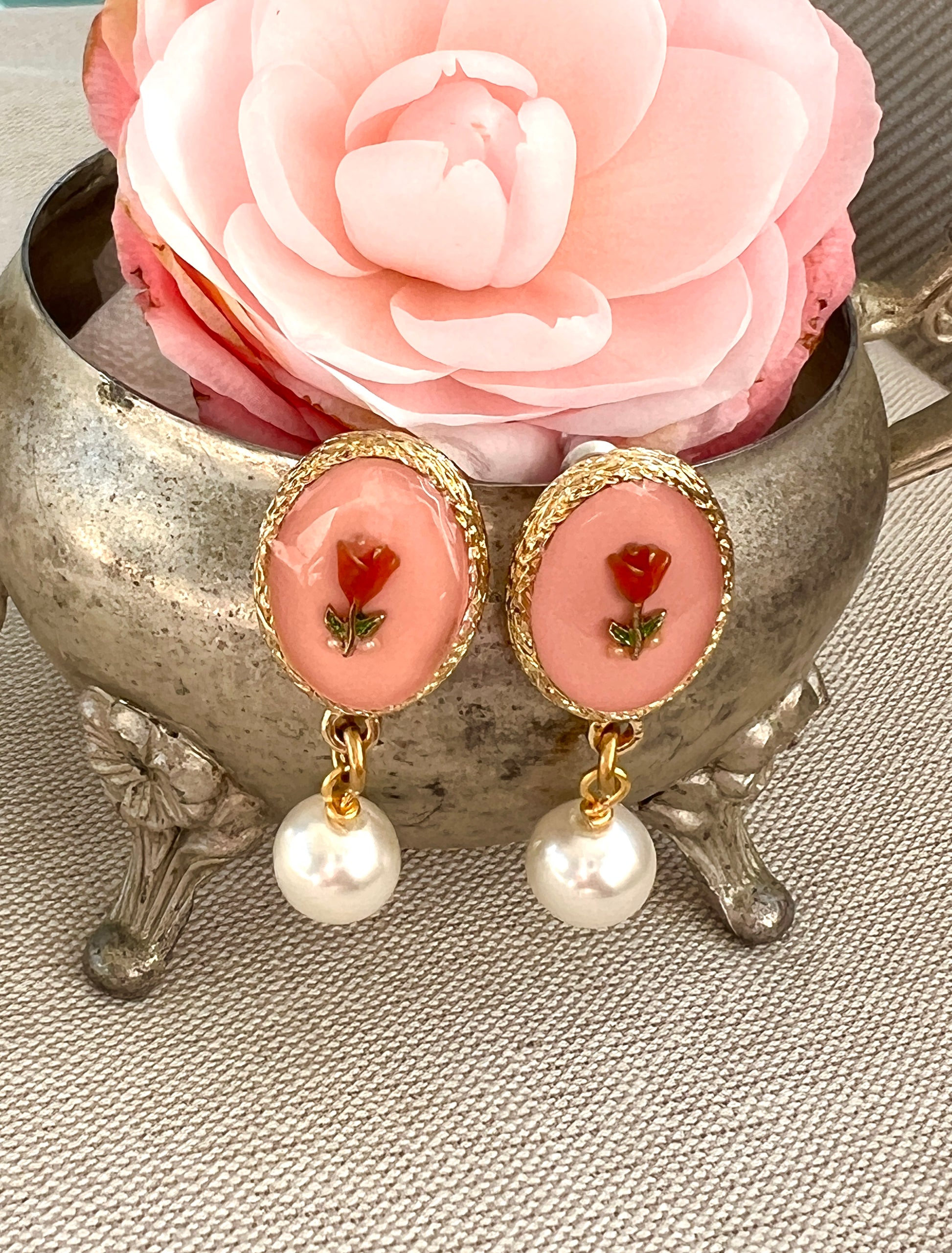 Red Rose and Pink Vintage Glass Pearl Earrings
