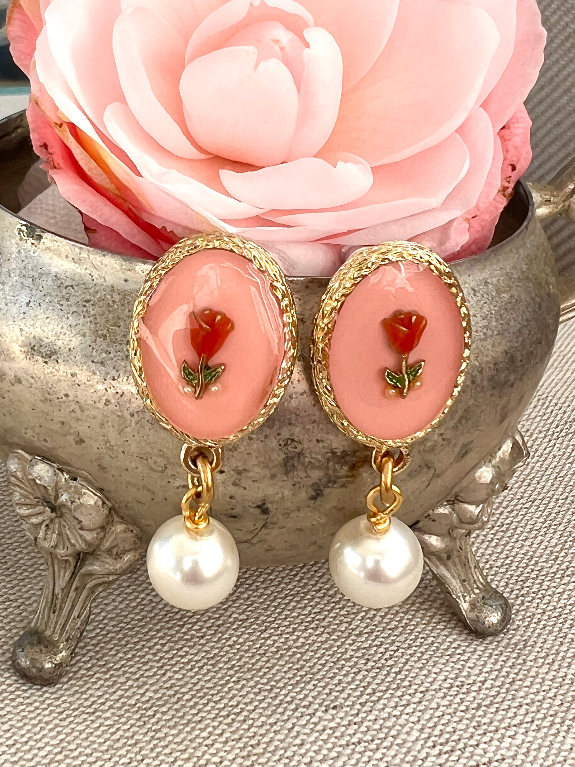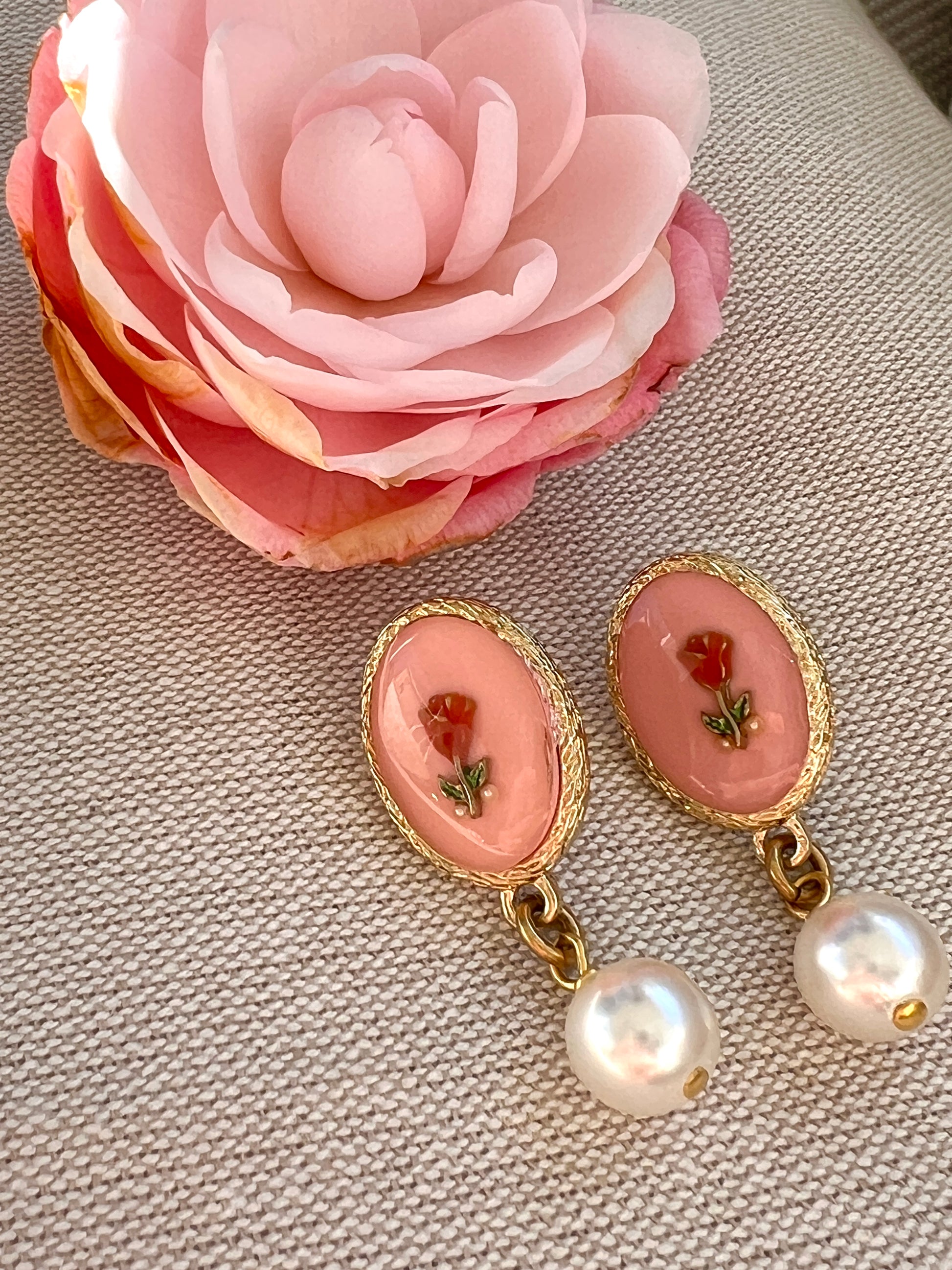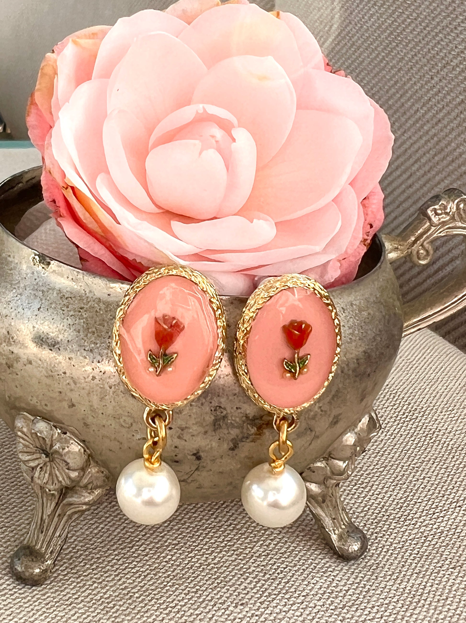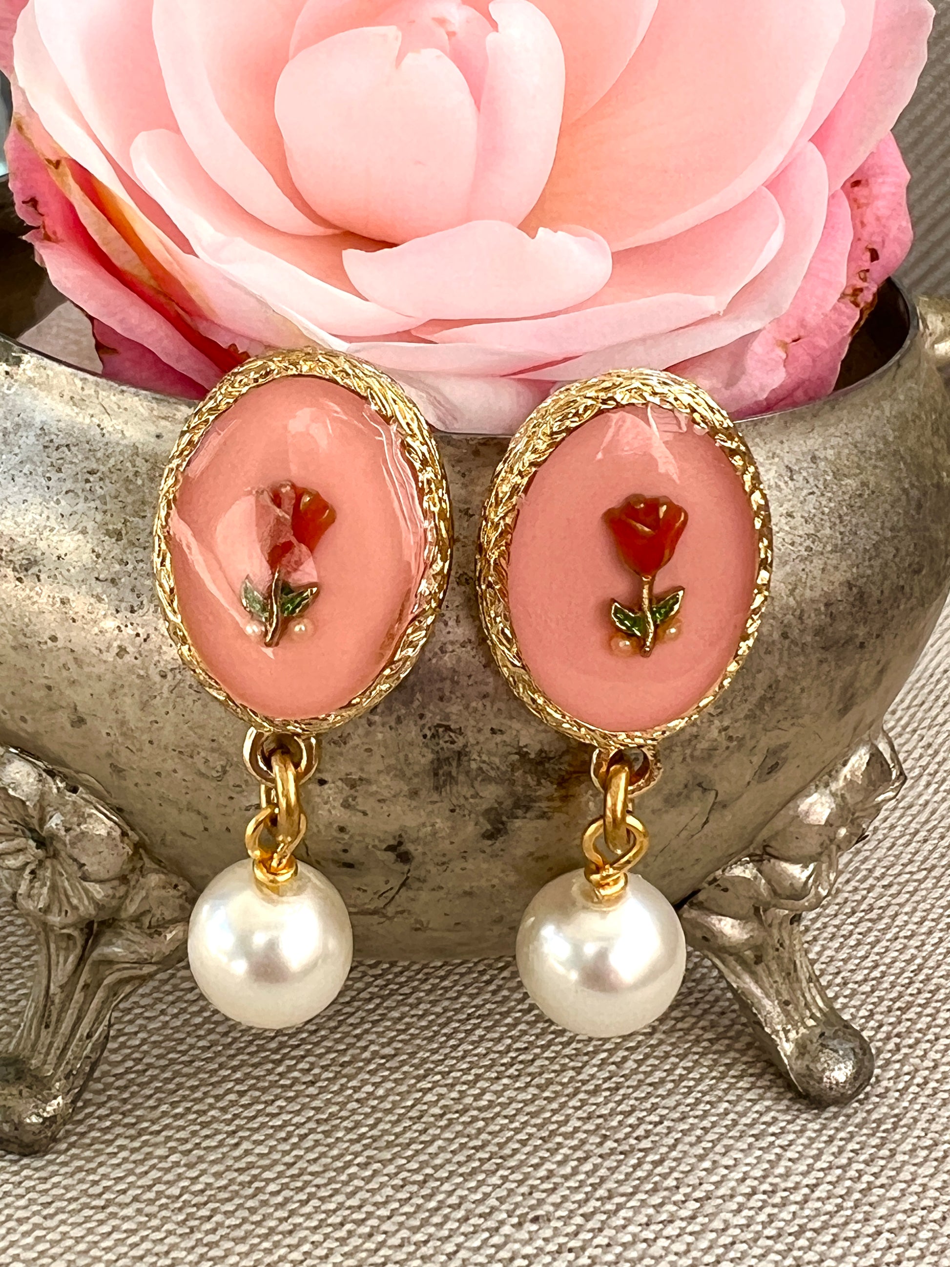 A red rose sealed on a pink backdrop earring base, dangle large glass pearls from a deconstructed vintage necklace. Earrings dangle 1 9/16" from ear hole to bottom of earring, and are 5/8" at the widest point. All earring components are nickel and lead free.