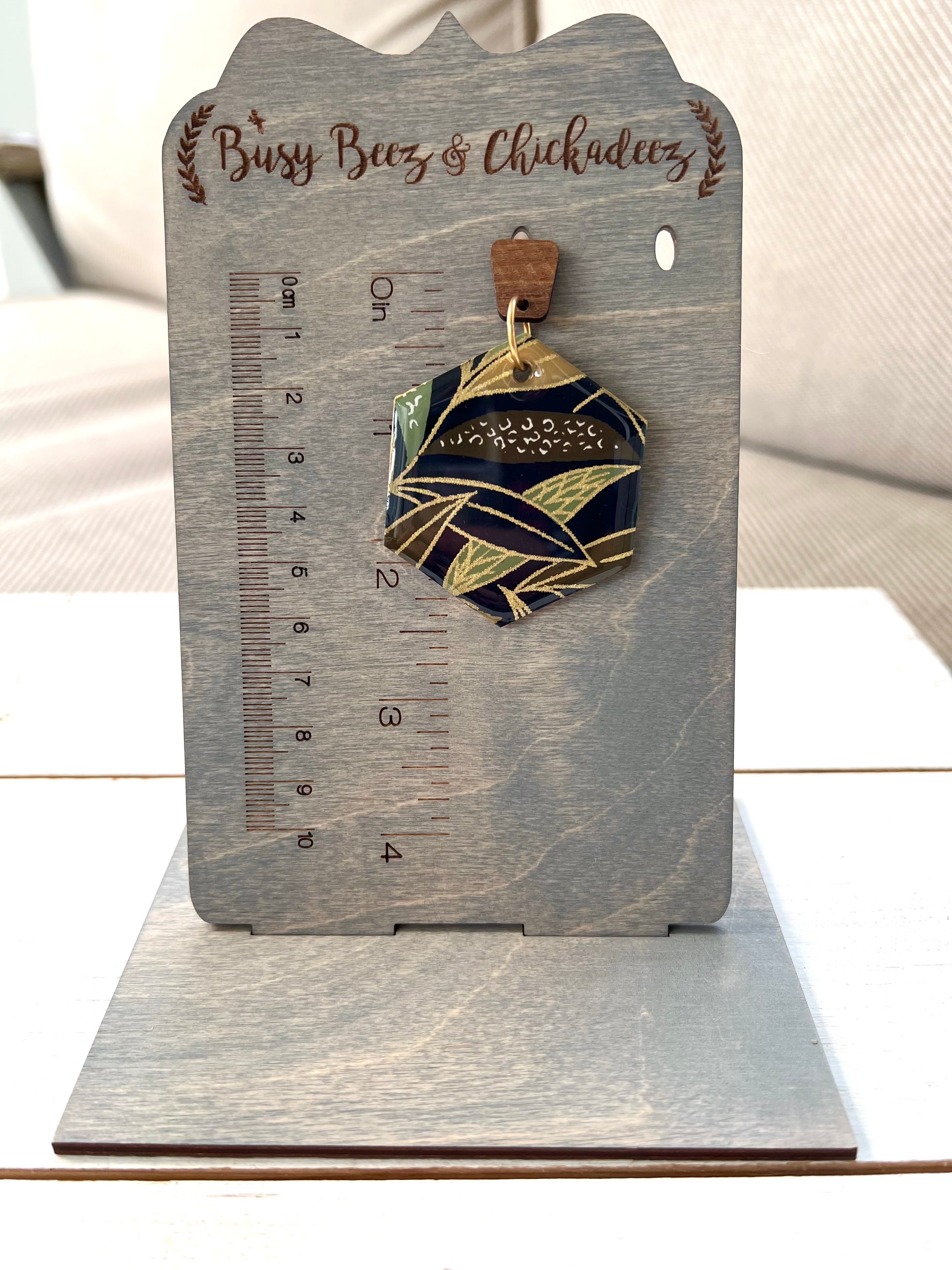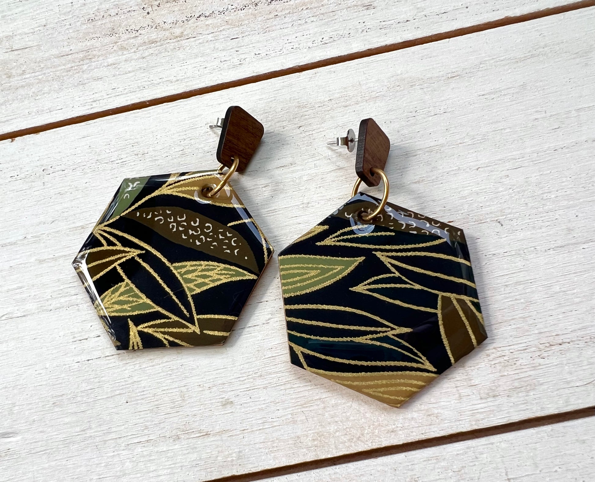 Wooden earrings have been embellished with chiyogami paper - paper that has been individually silk screened by artists in Japan. The paper is then sealed in resin. The earrings are attached to wooden stained trapezoid posts. The back of the wood earrings have also been stained. Earrings drop 2 1/2" in length from ear hole and are 1 3/4" at the widest point.