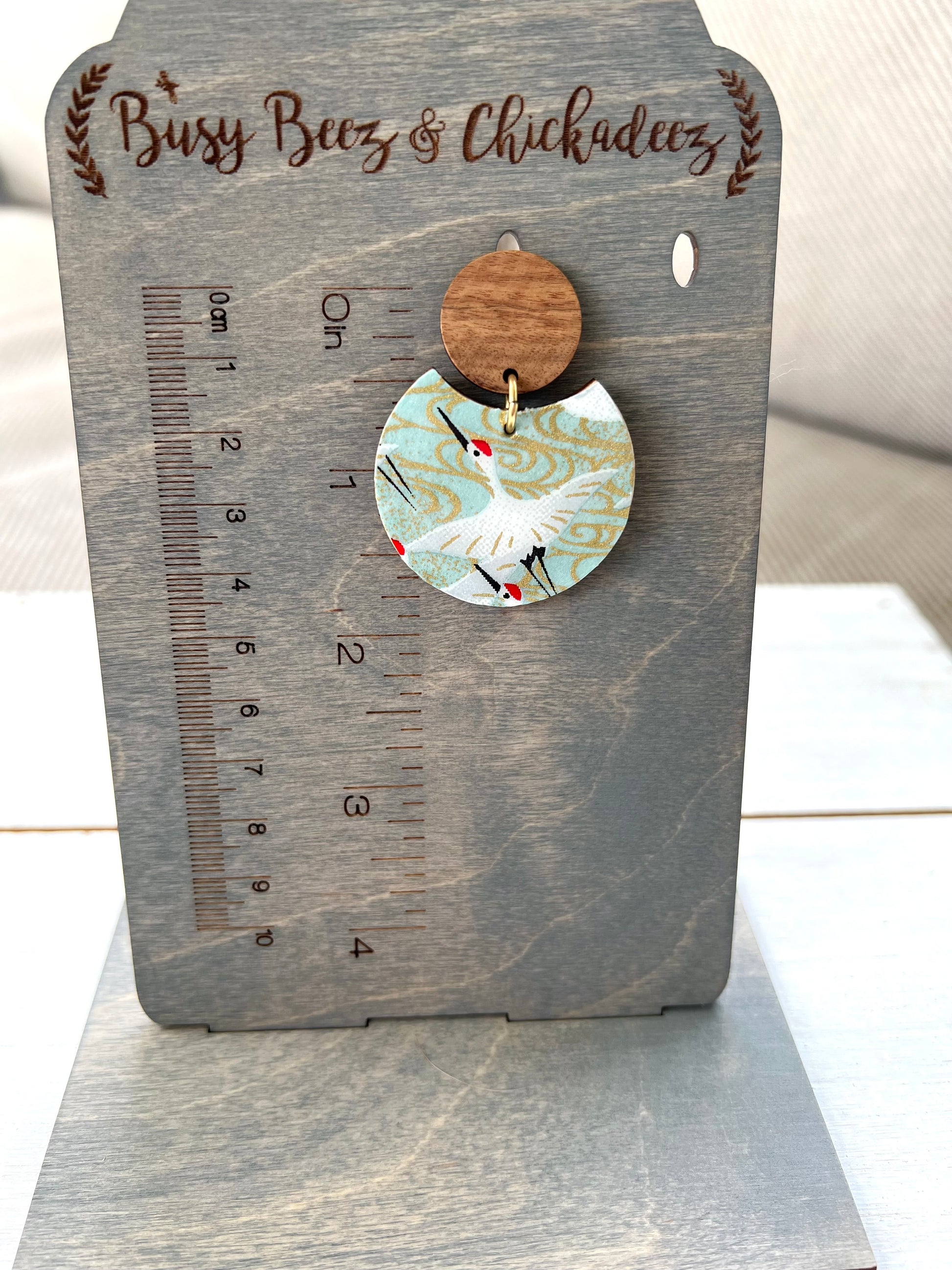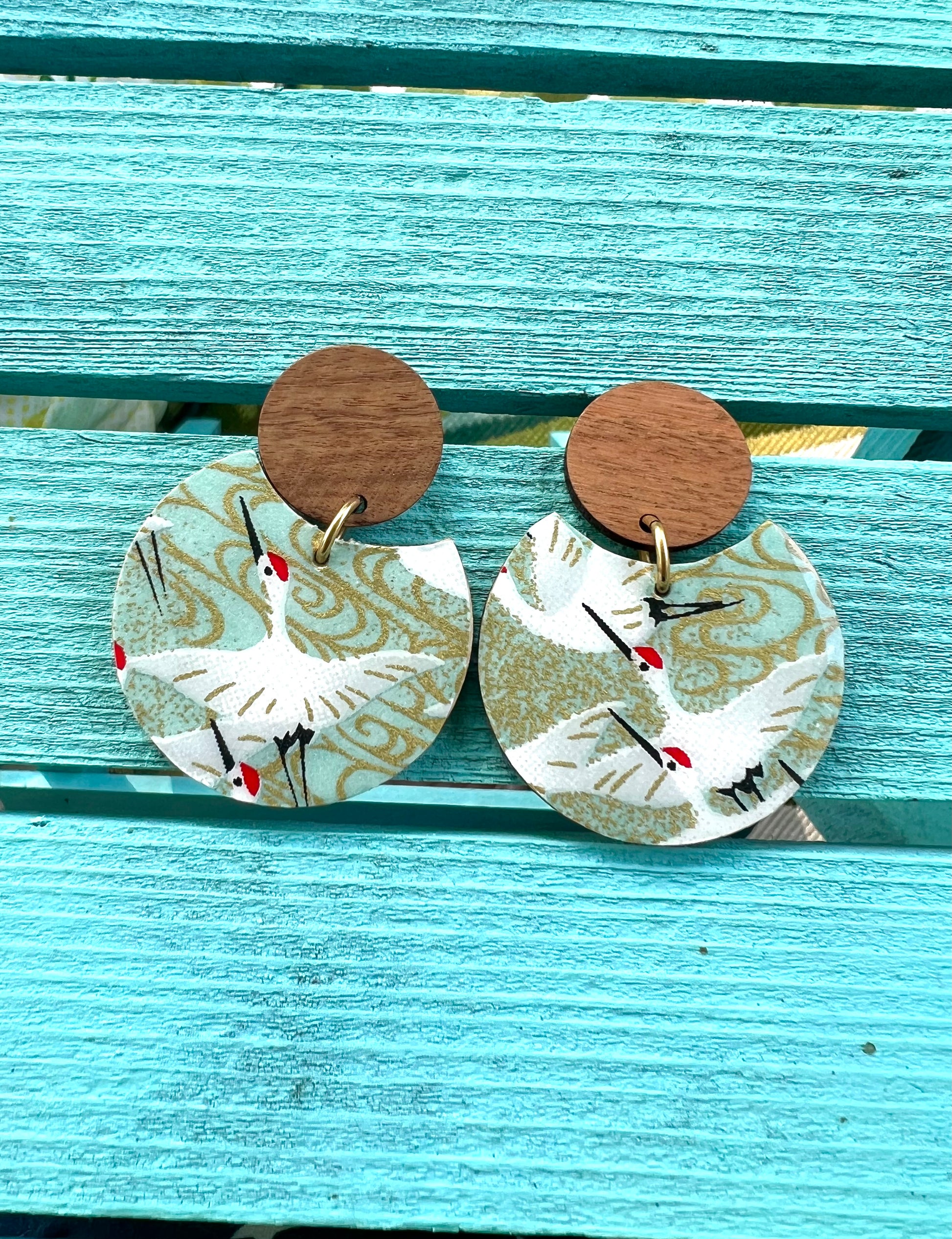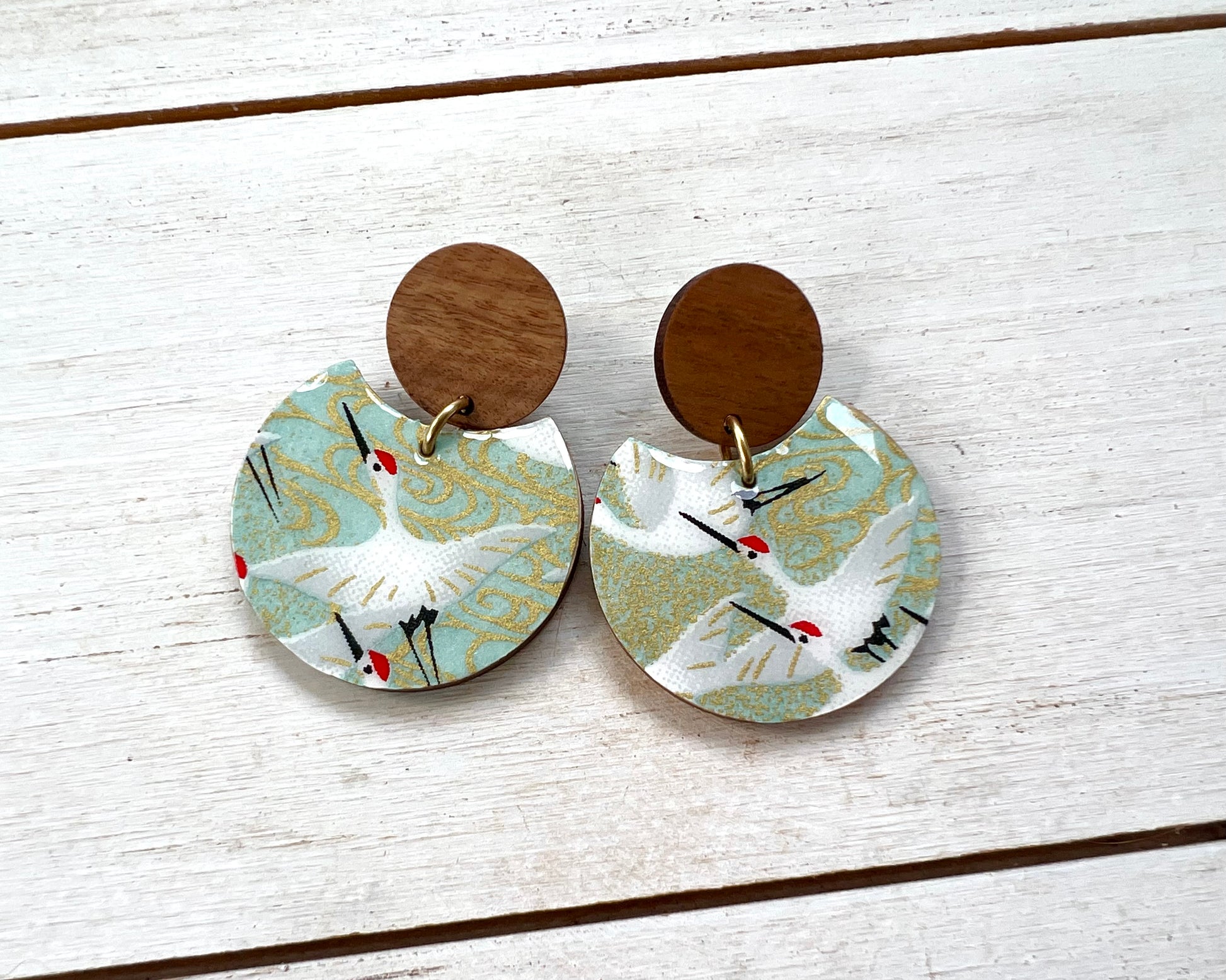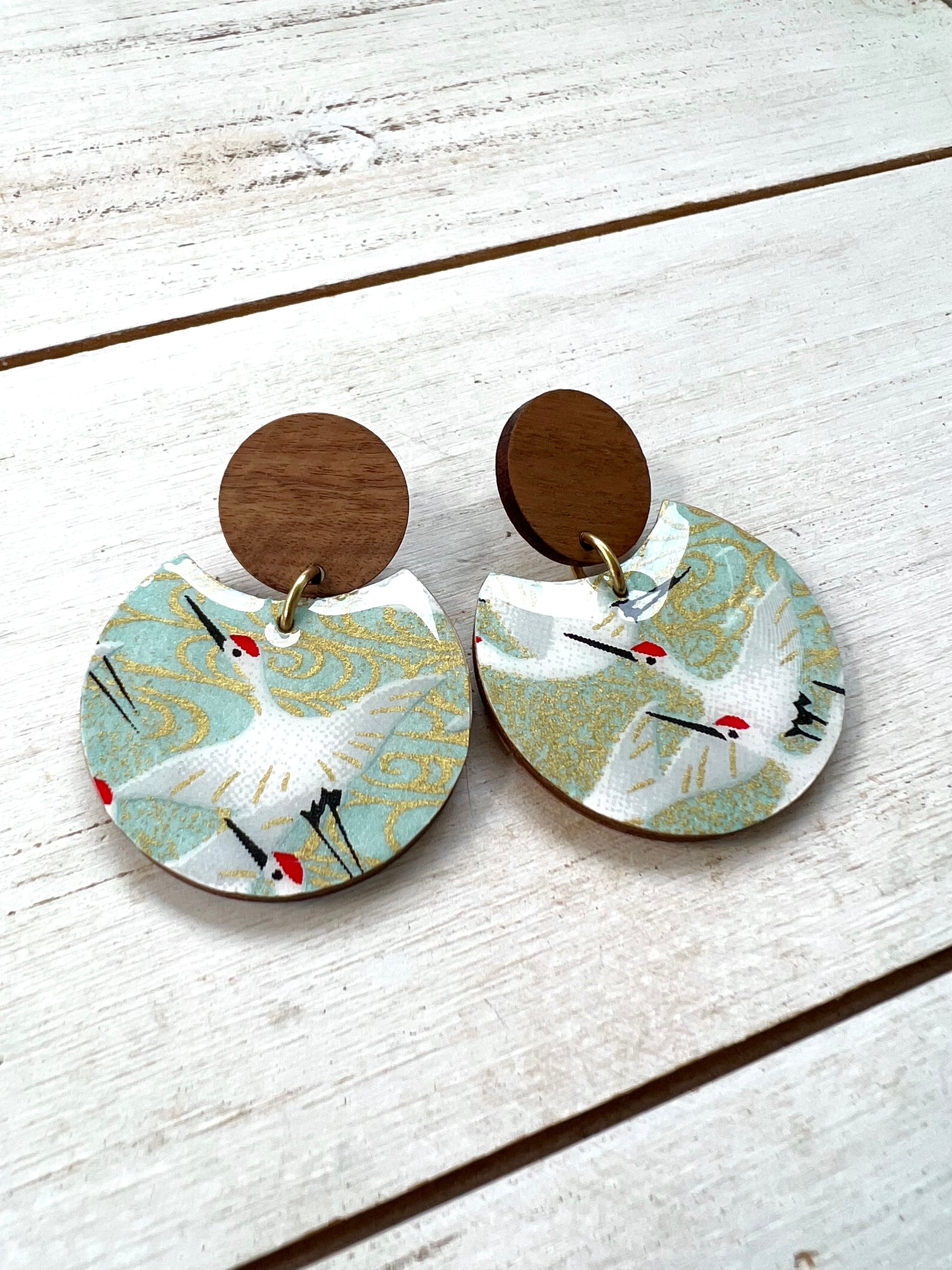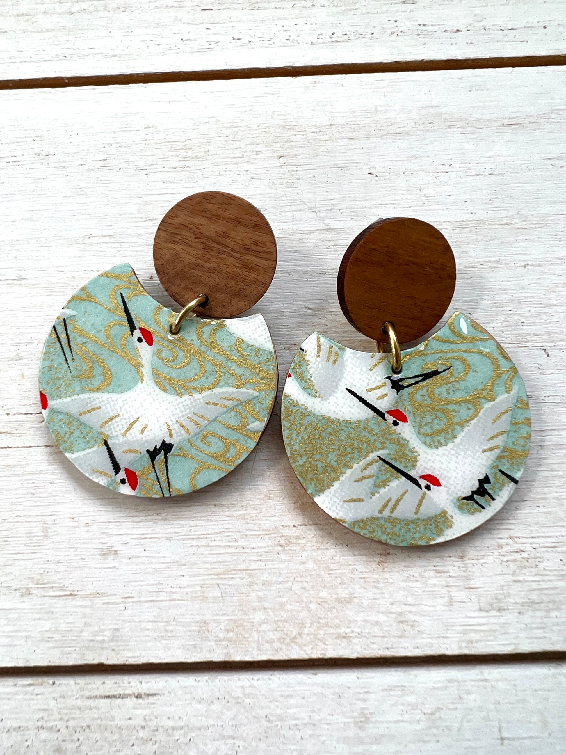 Wooden earrings have been embellished with chiyogami paper - paper that has been individually silk screened by artists in Japan. The paper is then sealed in resin. The earrings are attached to stained round posts. The back of the wood earrings have also been stained. Earrings drop 1 3/4" in length from ear hole and are 1 1/2" at the widest point.