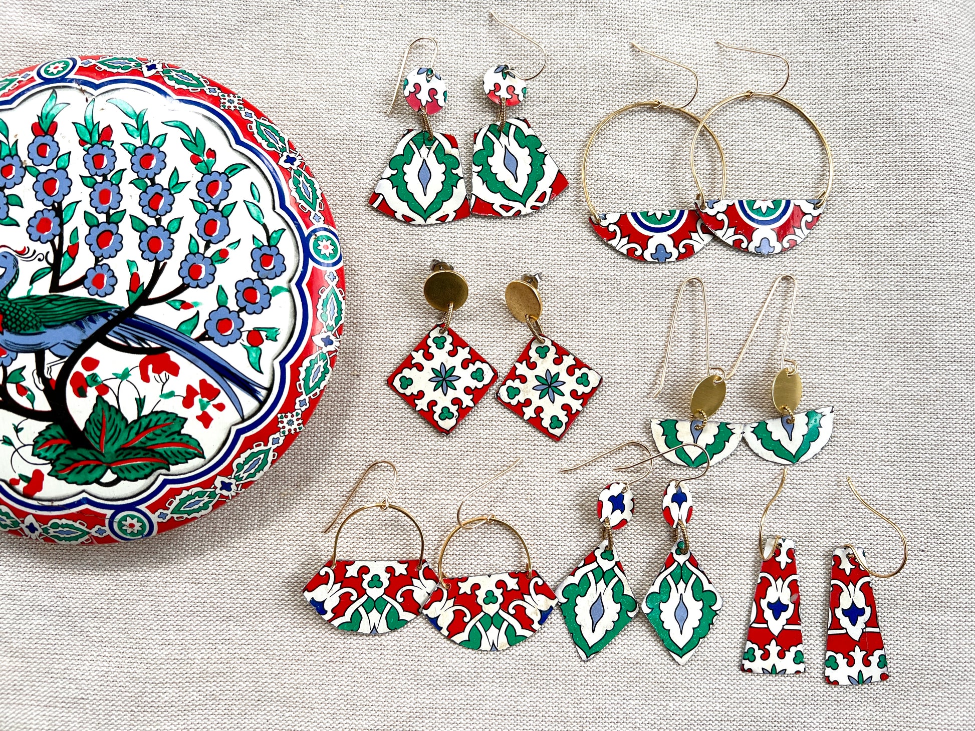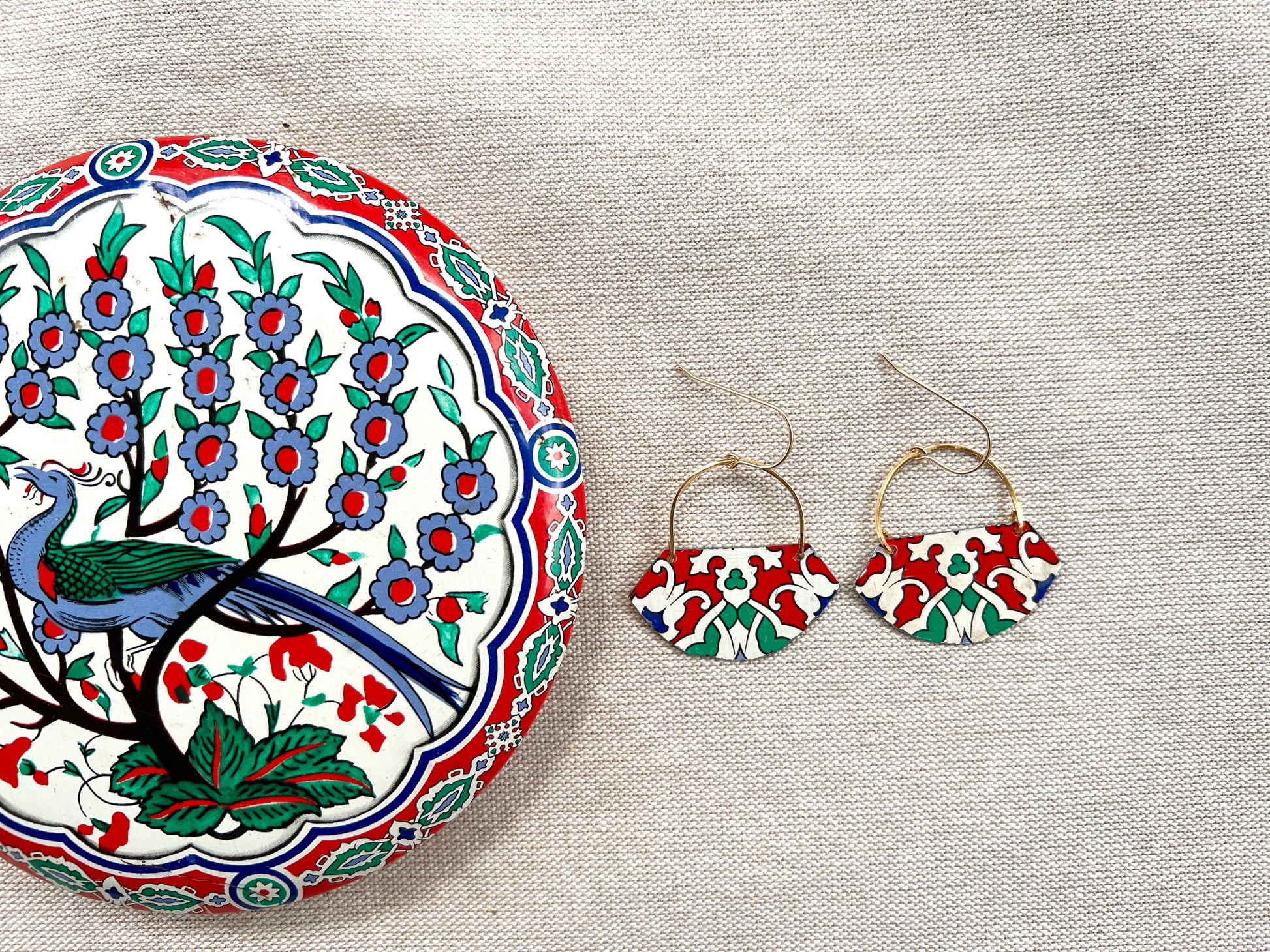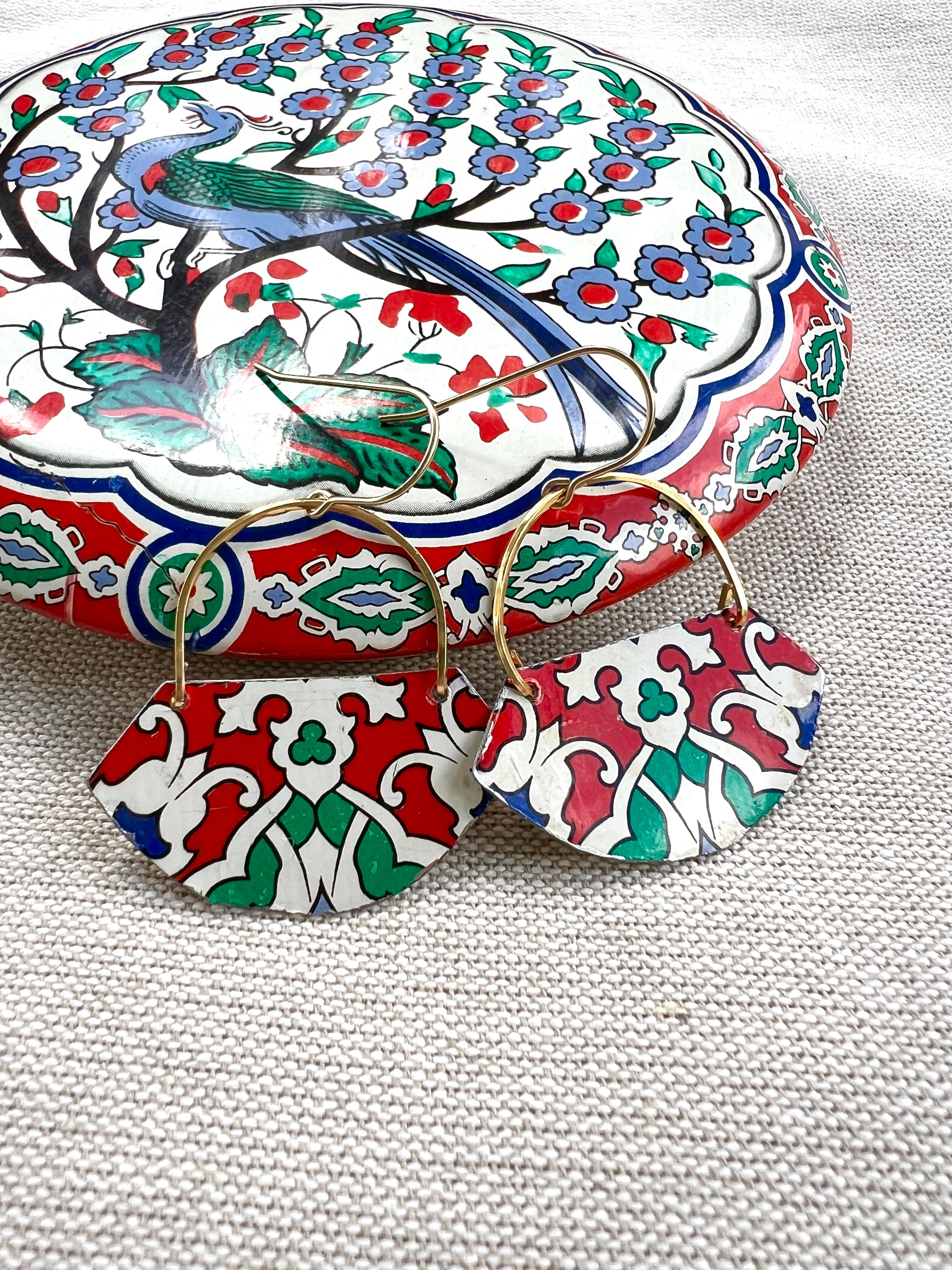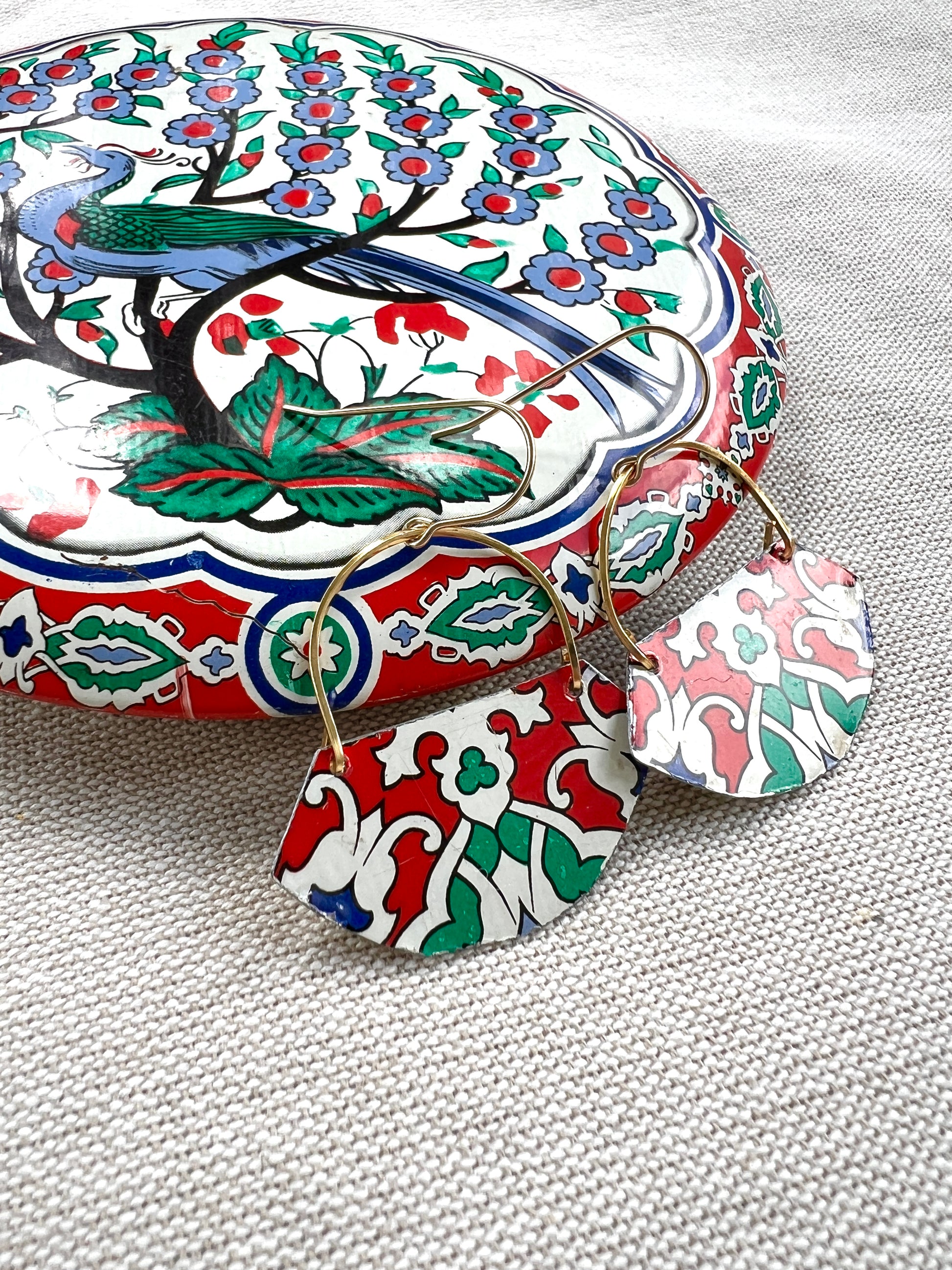 The earrings are made by repurposing a vintage tin container with a colorful print. The vintage tin piece is carefully hand cut with snips, filed and attached to a hand shaped, hand forged wire, which is then attached to a 24k gold plated ear wire.