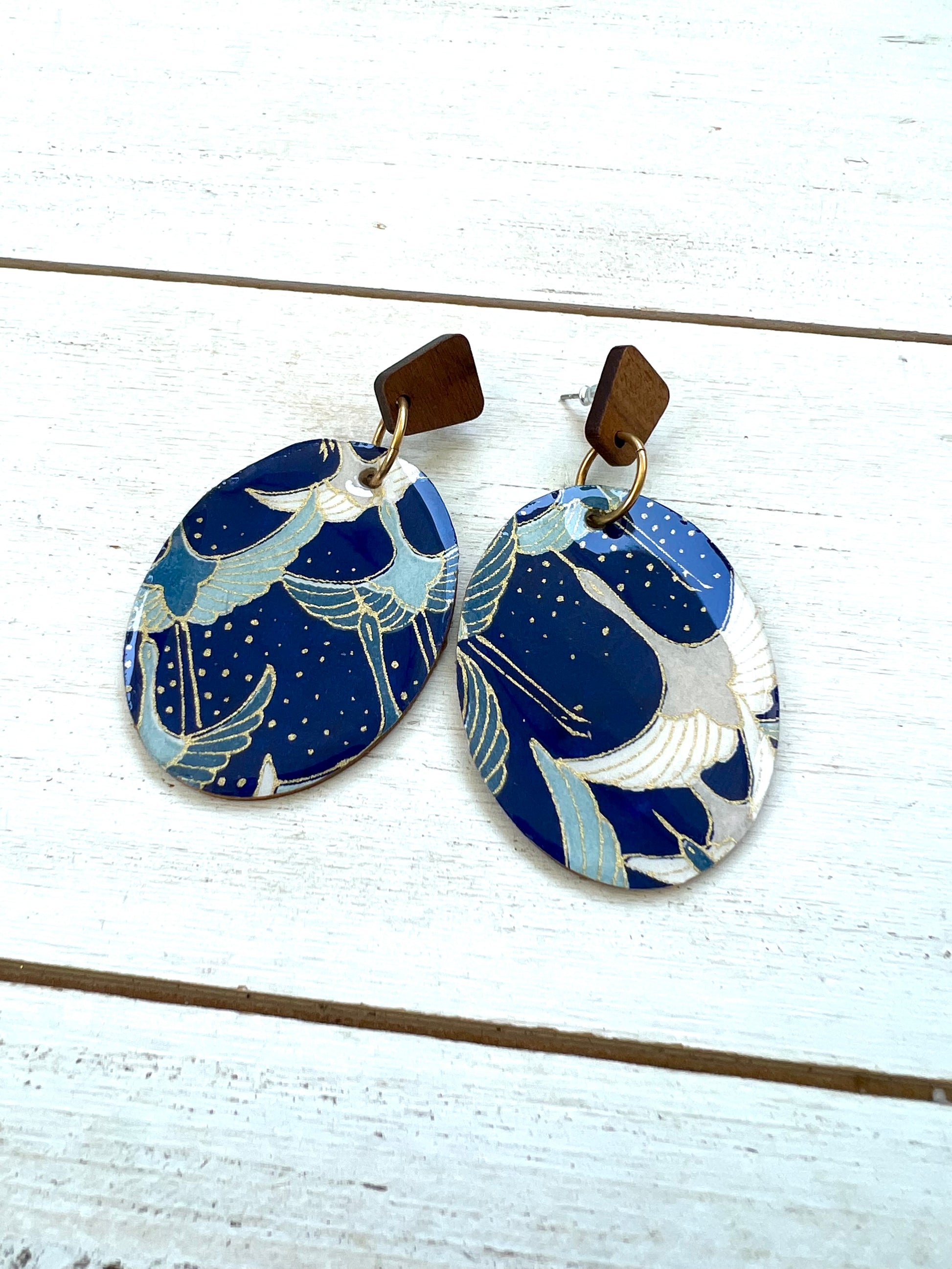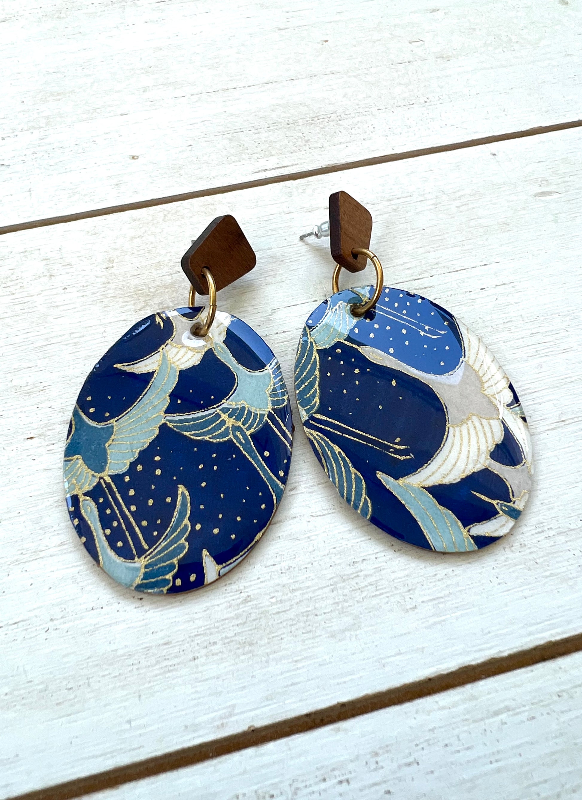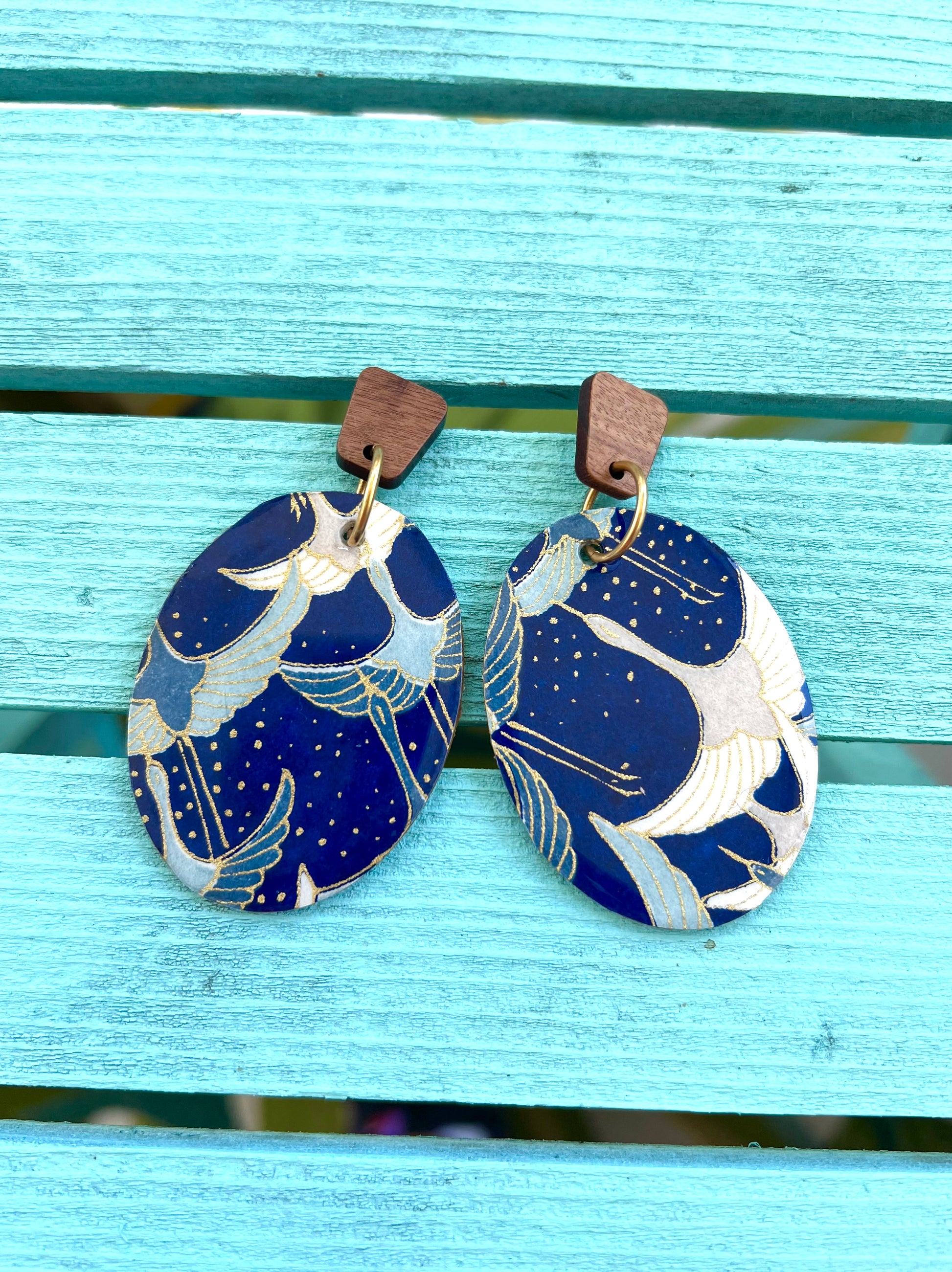 Wooden earrings have been embellished with chiyogami paper - paper that has been individually silk screened by artists in Japan. The paper is then sealed in resin. The earrings are attached to stained trapezoid posts. The back of the wood earrings have also been stained. Earrings drop 2 11/16" in length from ear hole and are 1 1/2" at the widest point.