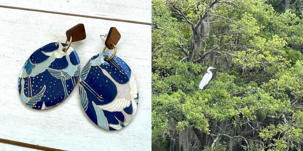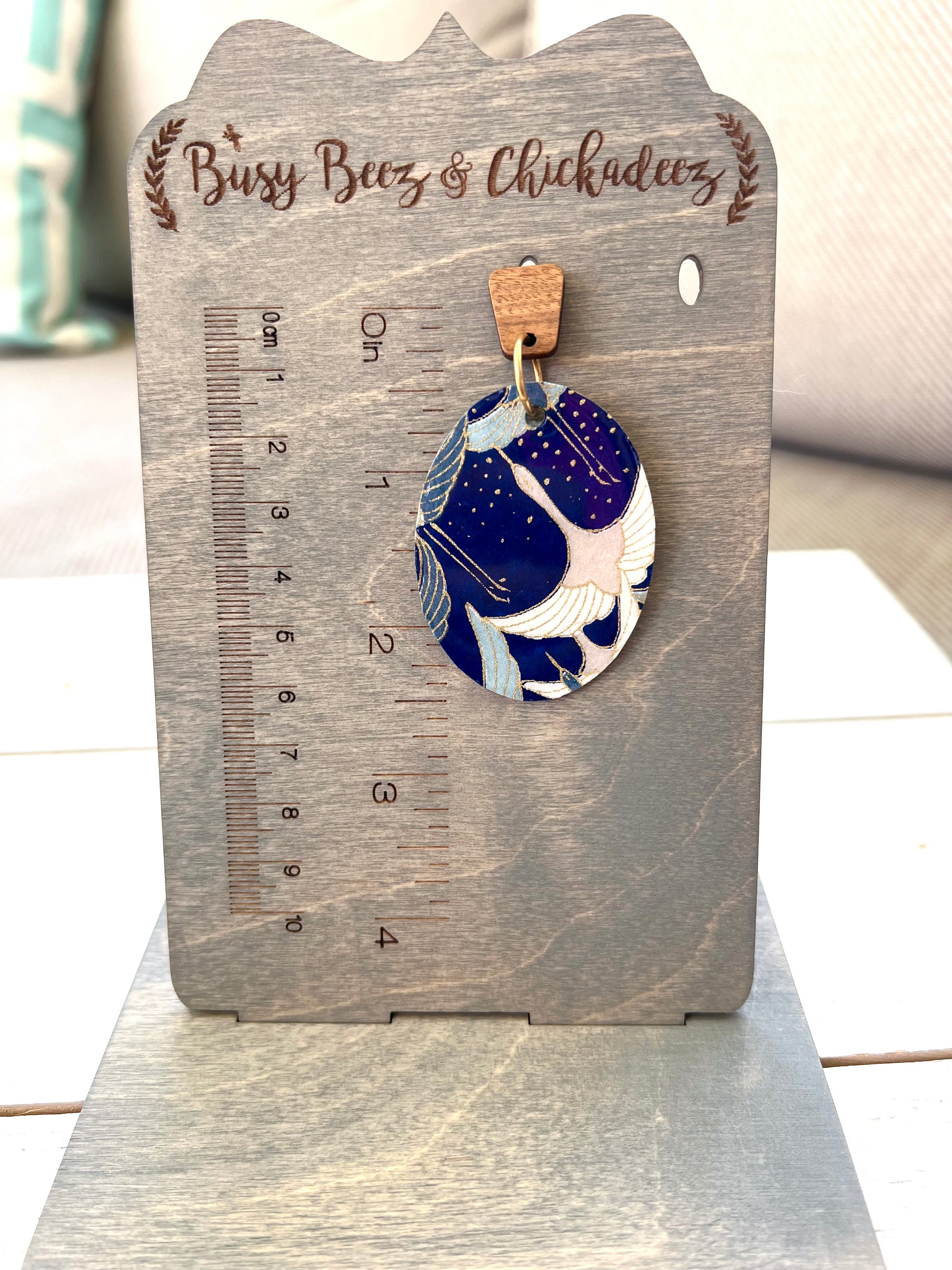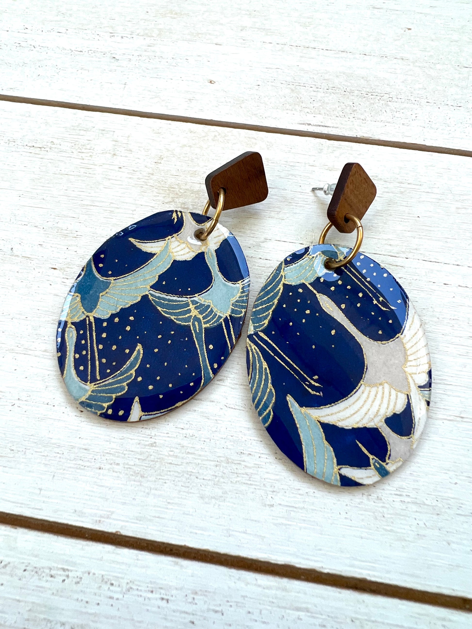 Wooden earrings have been embellished with chiyogami paper - paper that has been individually silk screened by artists in Japan. The paper is then sealed in resin. The earrings are attached to stained trapezoid posts. The back of the wood earrings have also been stained. Earrings drop 2 11/16" in length from ear hole and are 1 1/2" at the widest point.