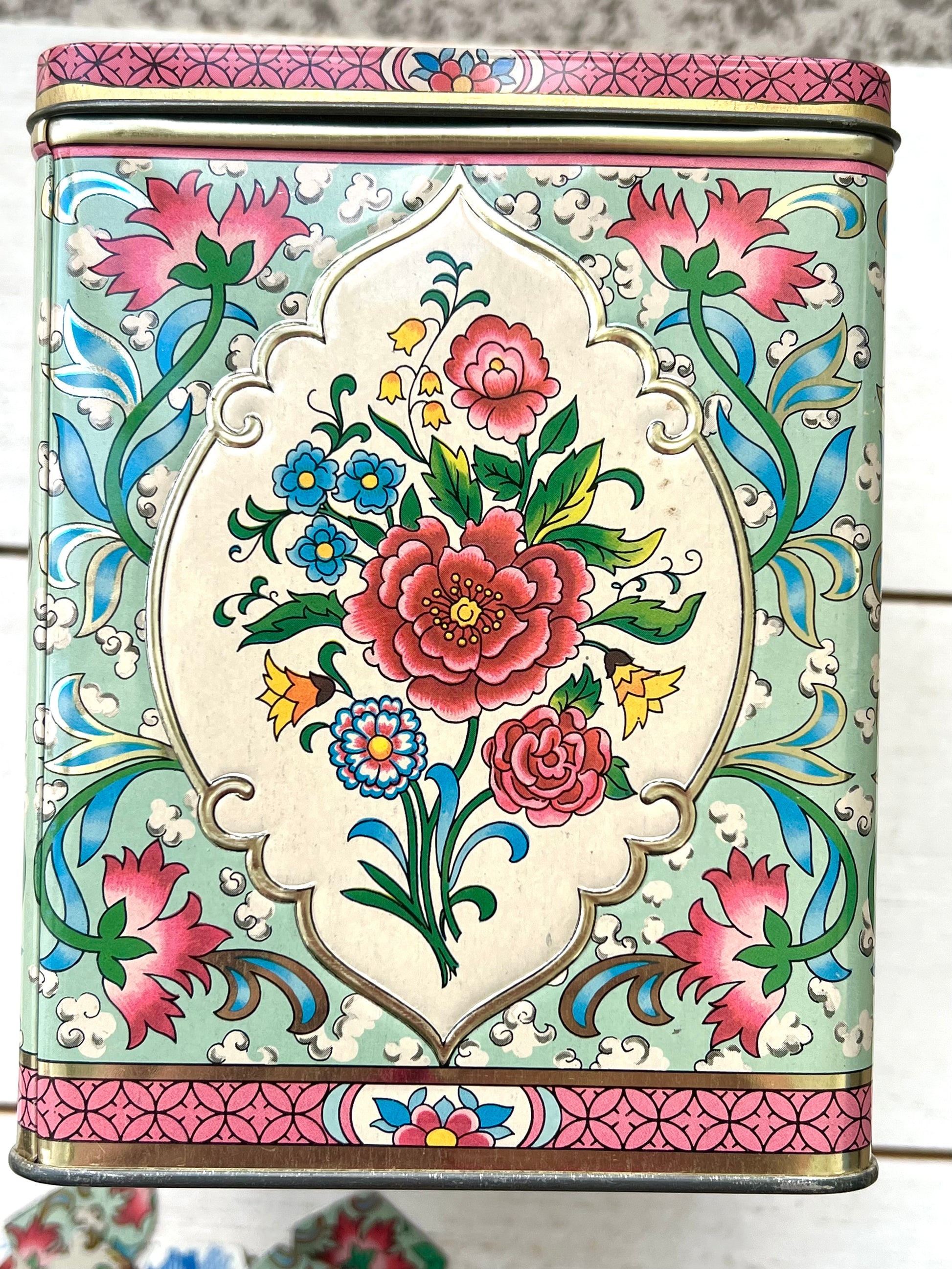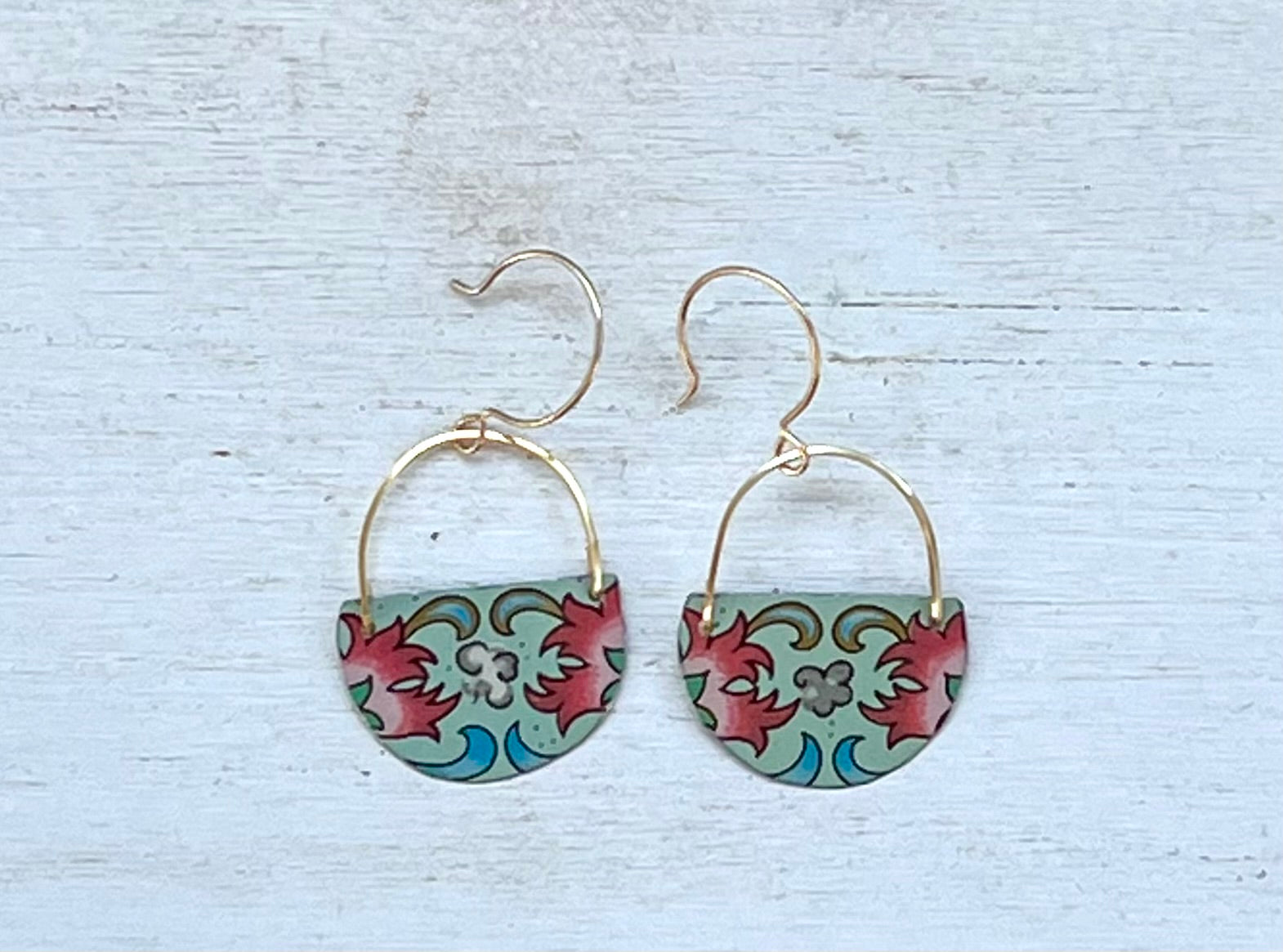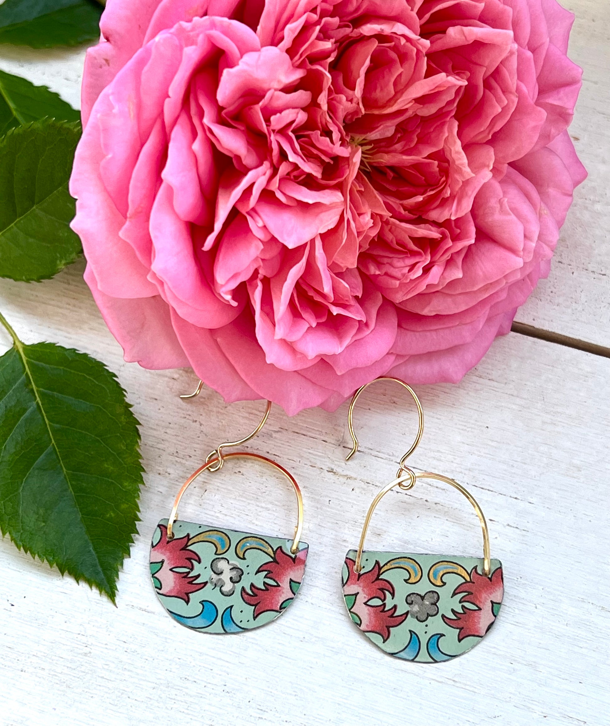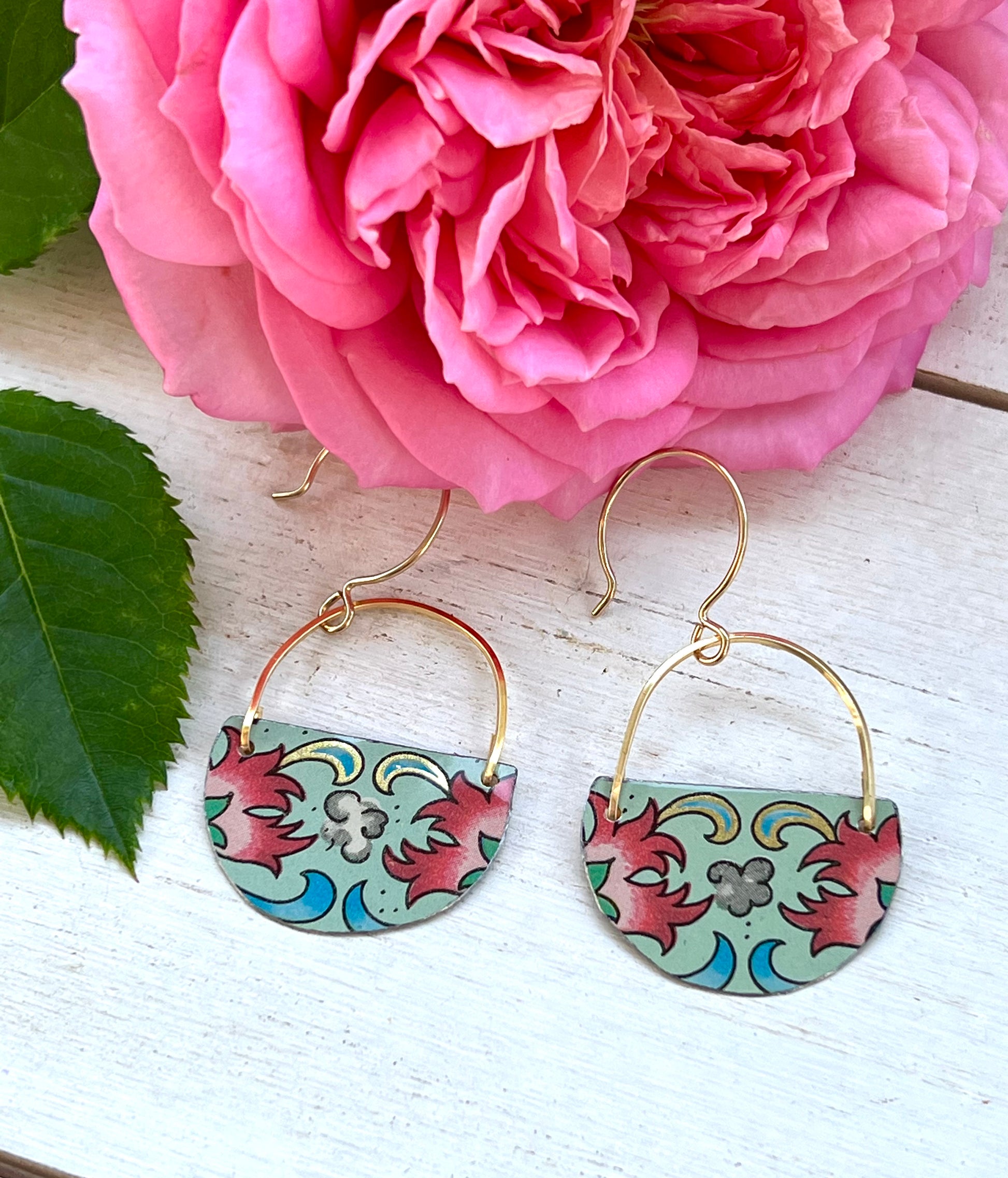 The earrings are made by repurposing a floral patterned, vintage tin container. The vintage tin piece is carefully hand cut, filed and attached to a hand shaped wire, which is then attached to a 14K gold filled ear wire. The earring length (from earring hole to base of earring) is 1 3/4" and the drop length (where ear wire meets earring to base of earring) is 1 5/8". The earring measures 1 1/8" at the widest point. The earrings are light weight. Each earring pair is unique, as the tin is cut on different parts of the pattern on the tin. Please see all listing pictures to see samples of the variations in the earrings. Please note due to the vintage nature, the tin may have slight scratches on the earrings.